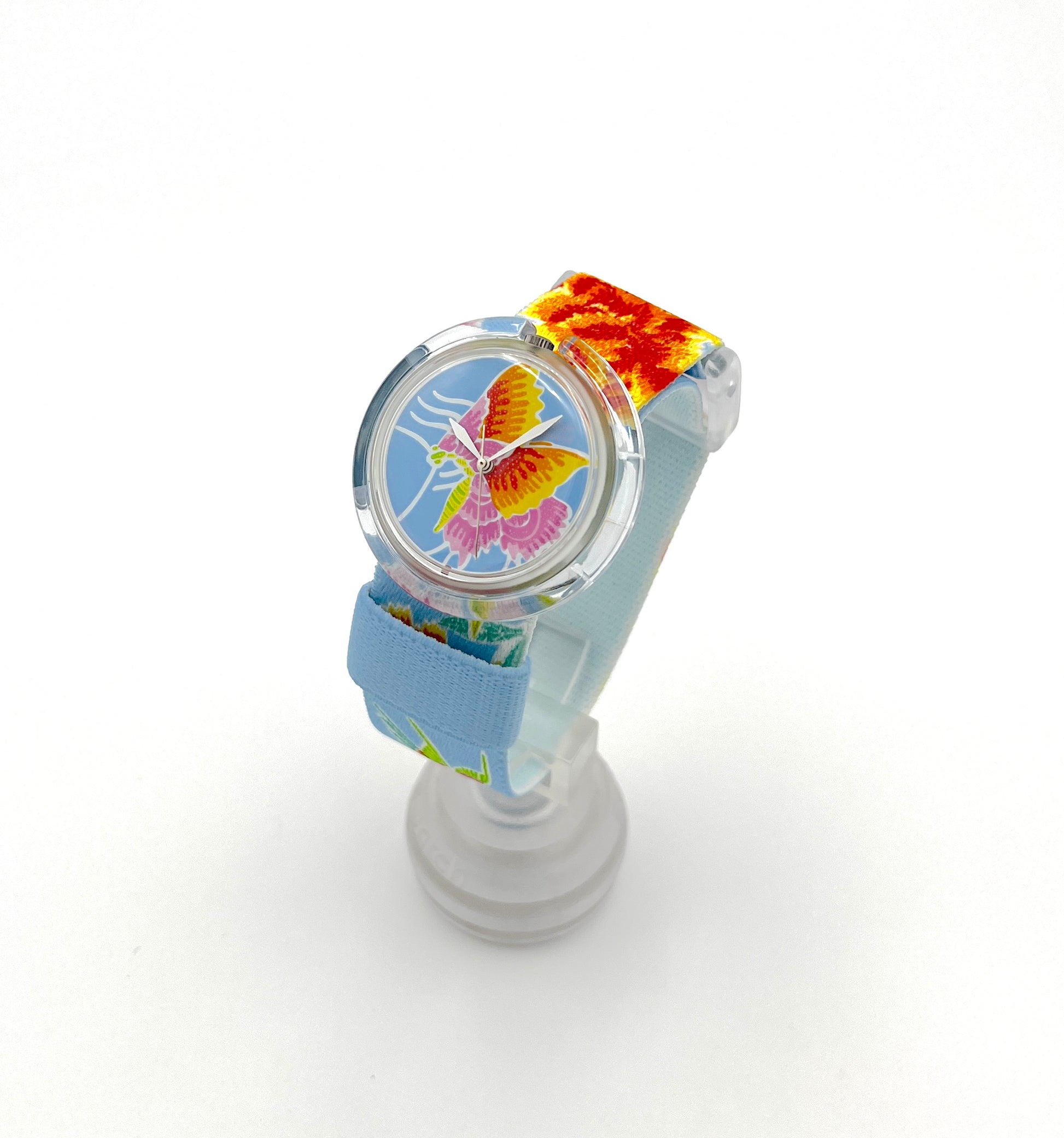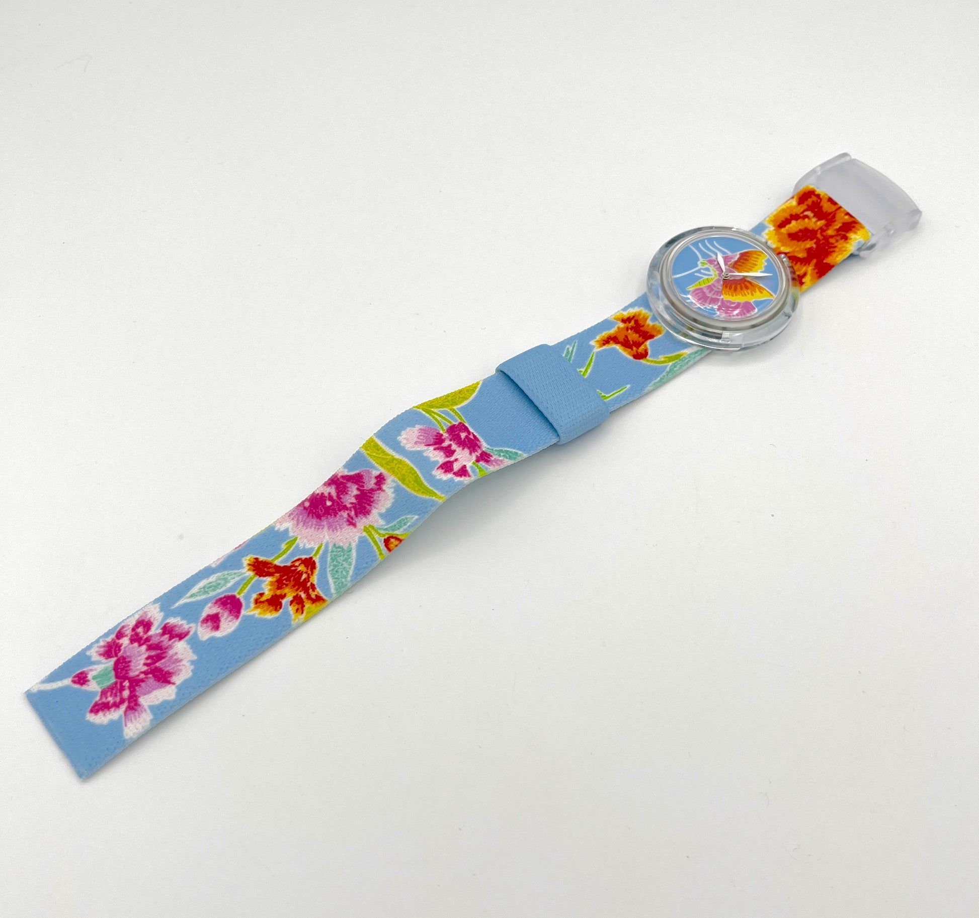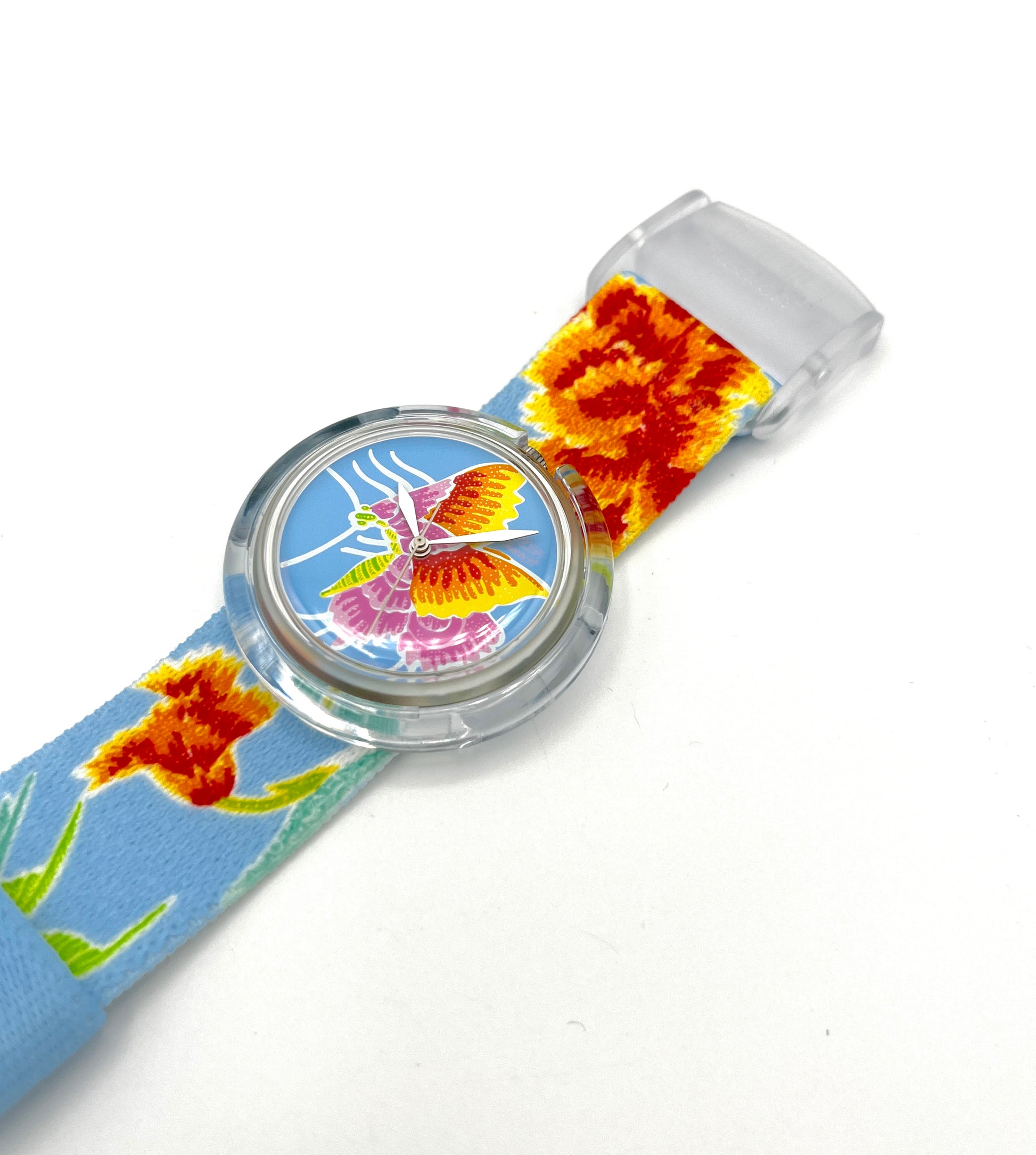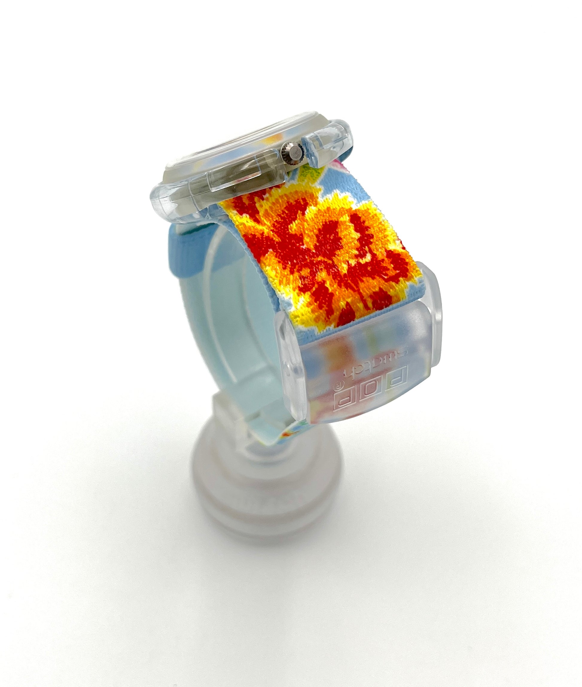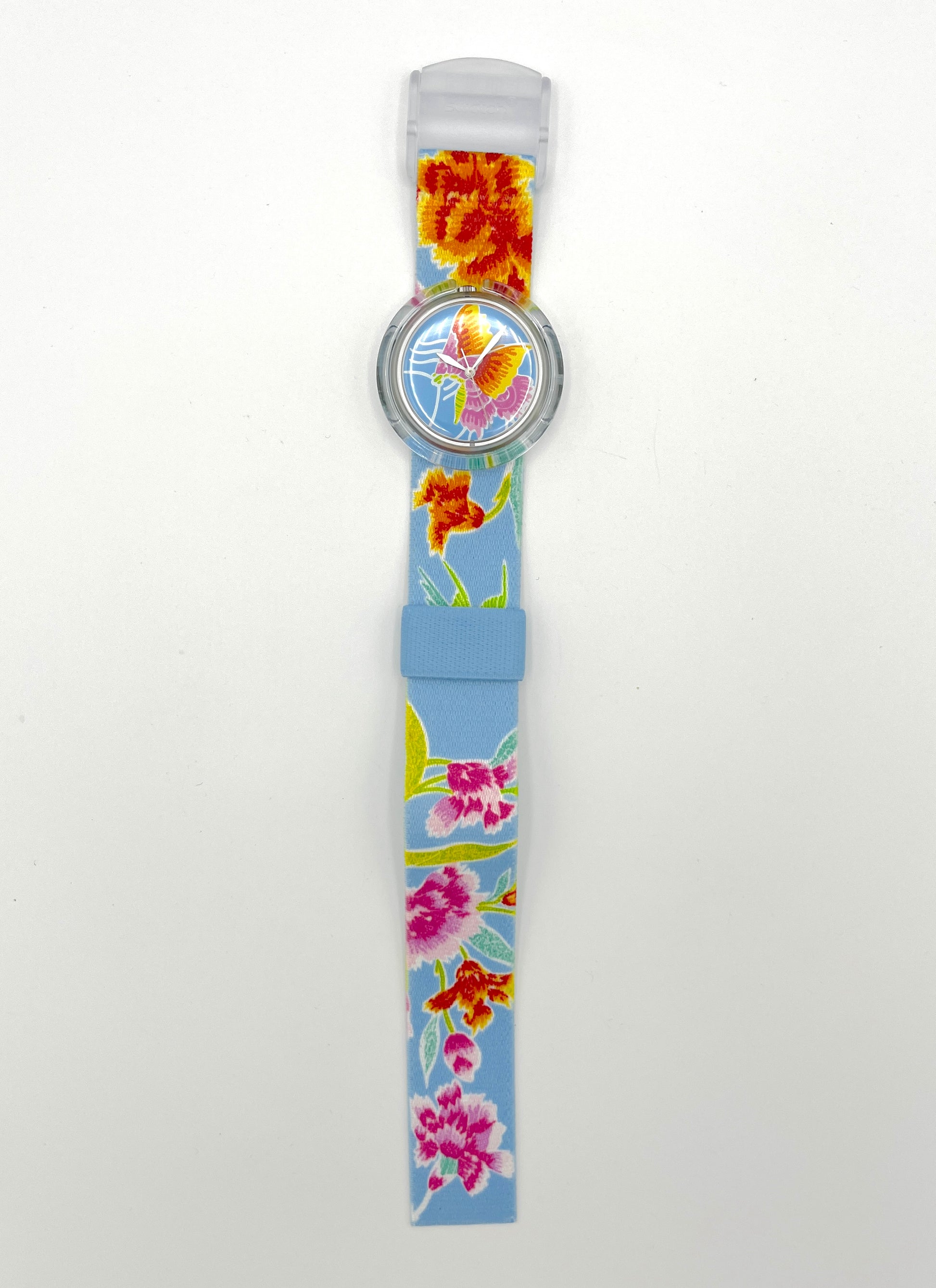 Floral Design – The very rare Midi Pop Swatch FLEURS D'ETE is a feast for the eyes. A colorful bouquet of flowers is depicted on the light blue dial and textile strap. The hands are white; the case, ring, and folding clasp are transparent.