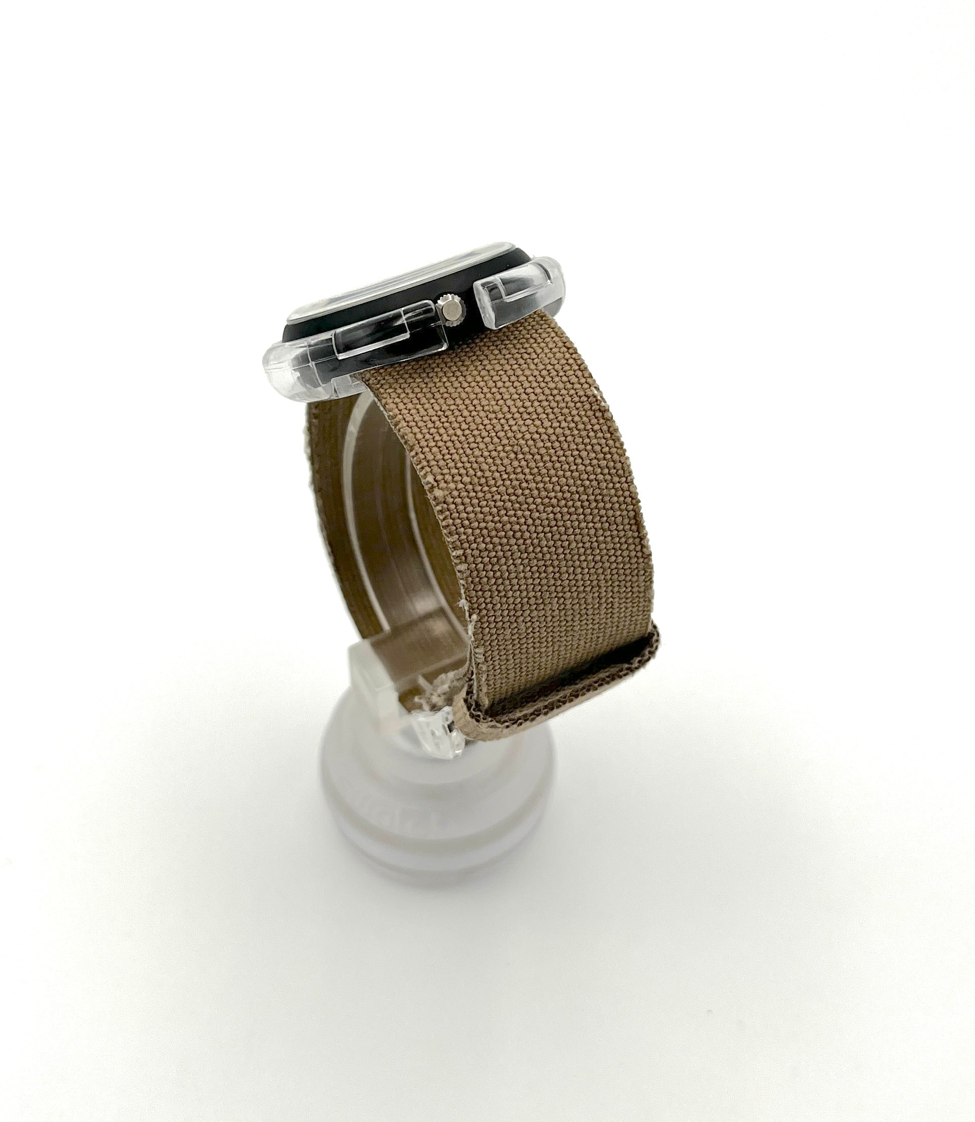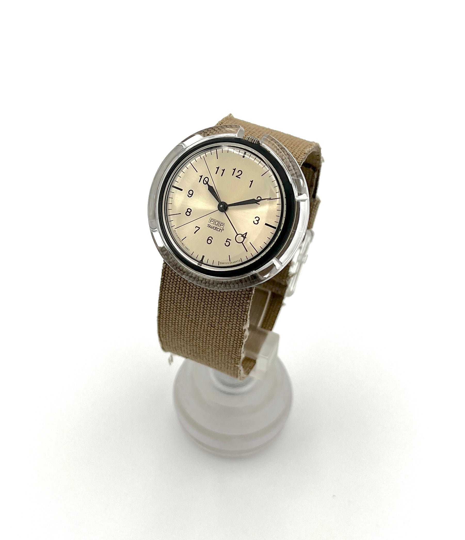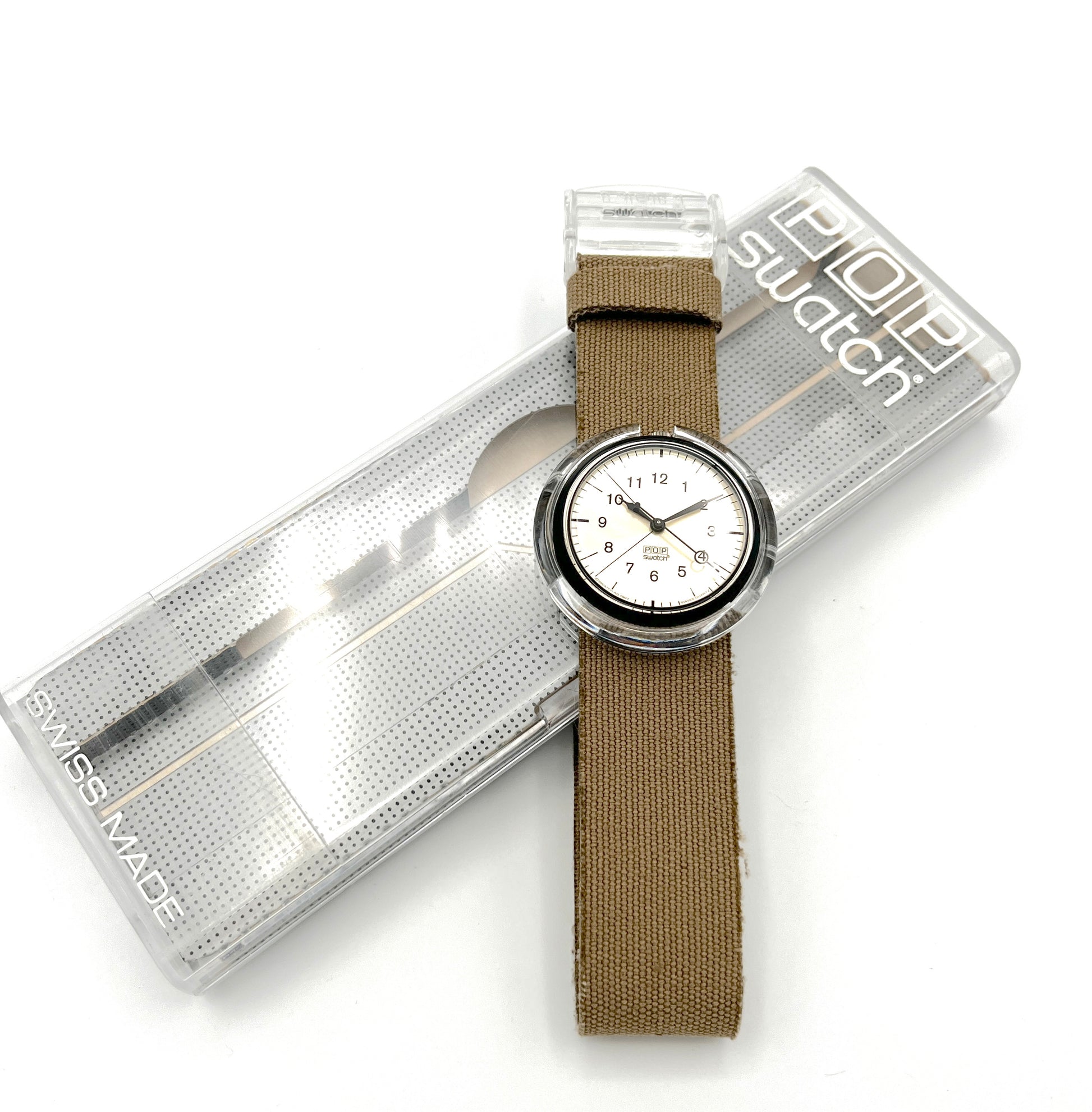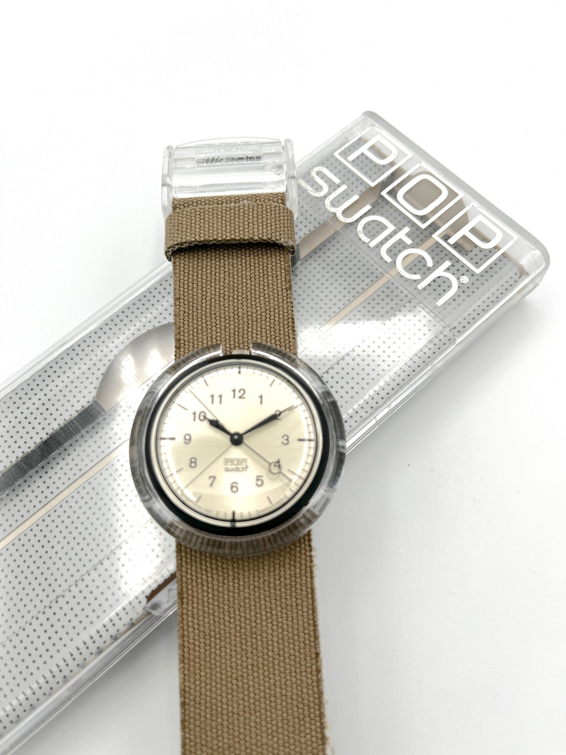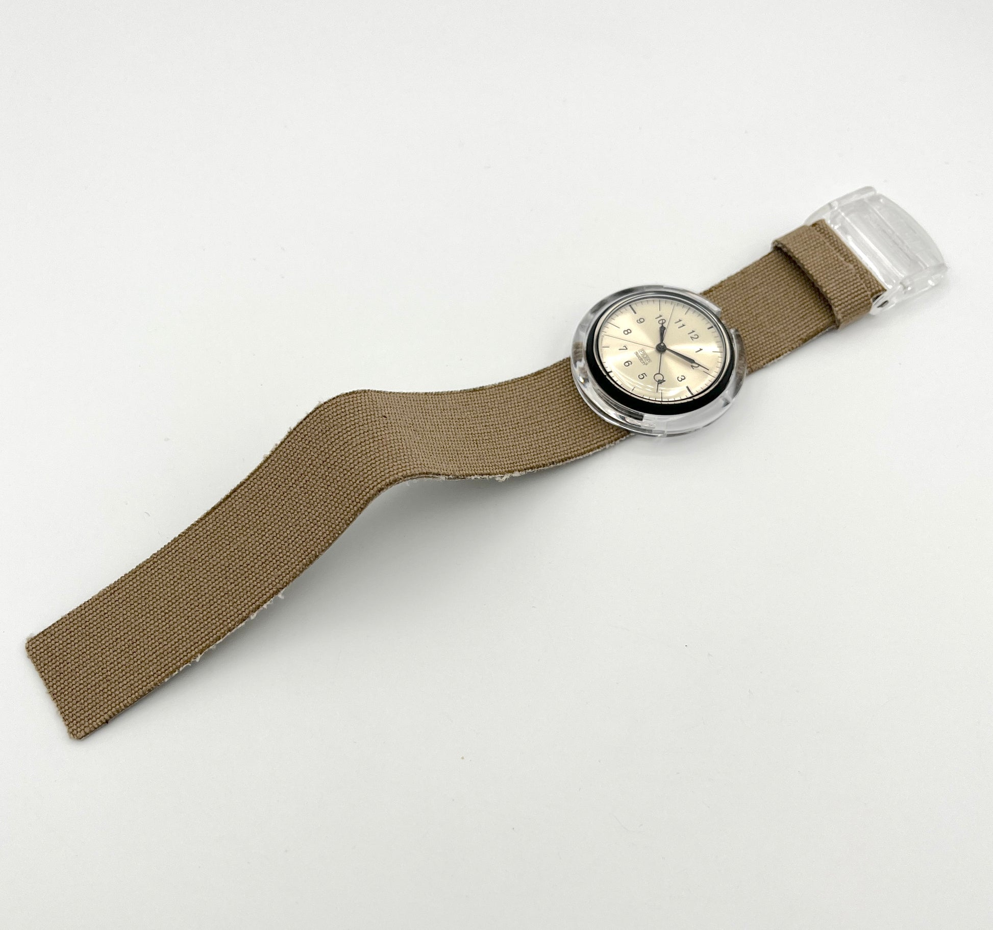 Bold Design – KURUMBU is an elegant midi pop swatch with an extravagant textile strap. The beige dial is easy to read, with black hands, numbers, and bar indices. A transparent buckle keeps the beige woven fabric securely on your arm.