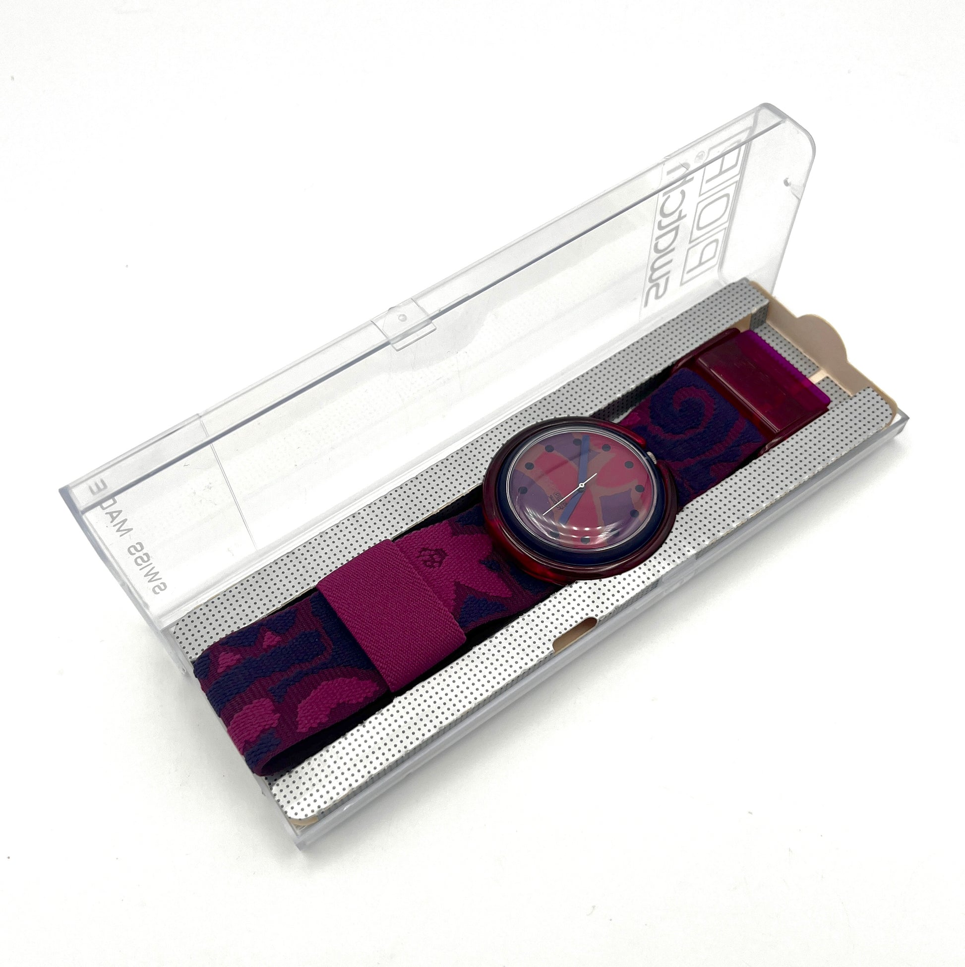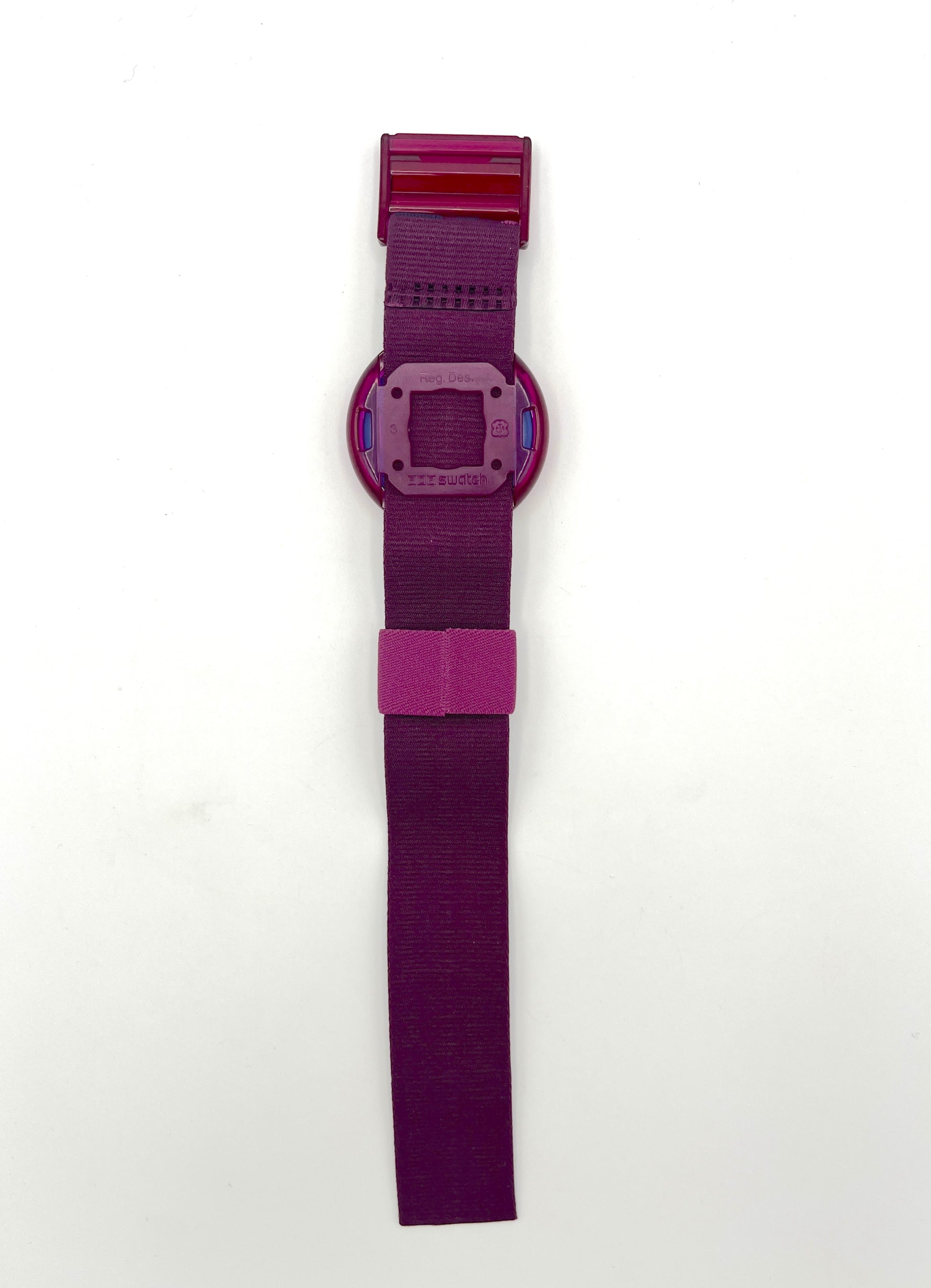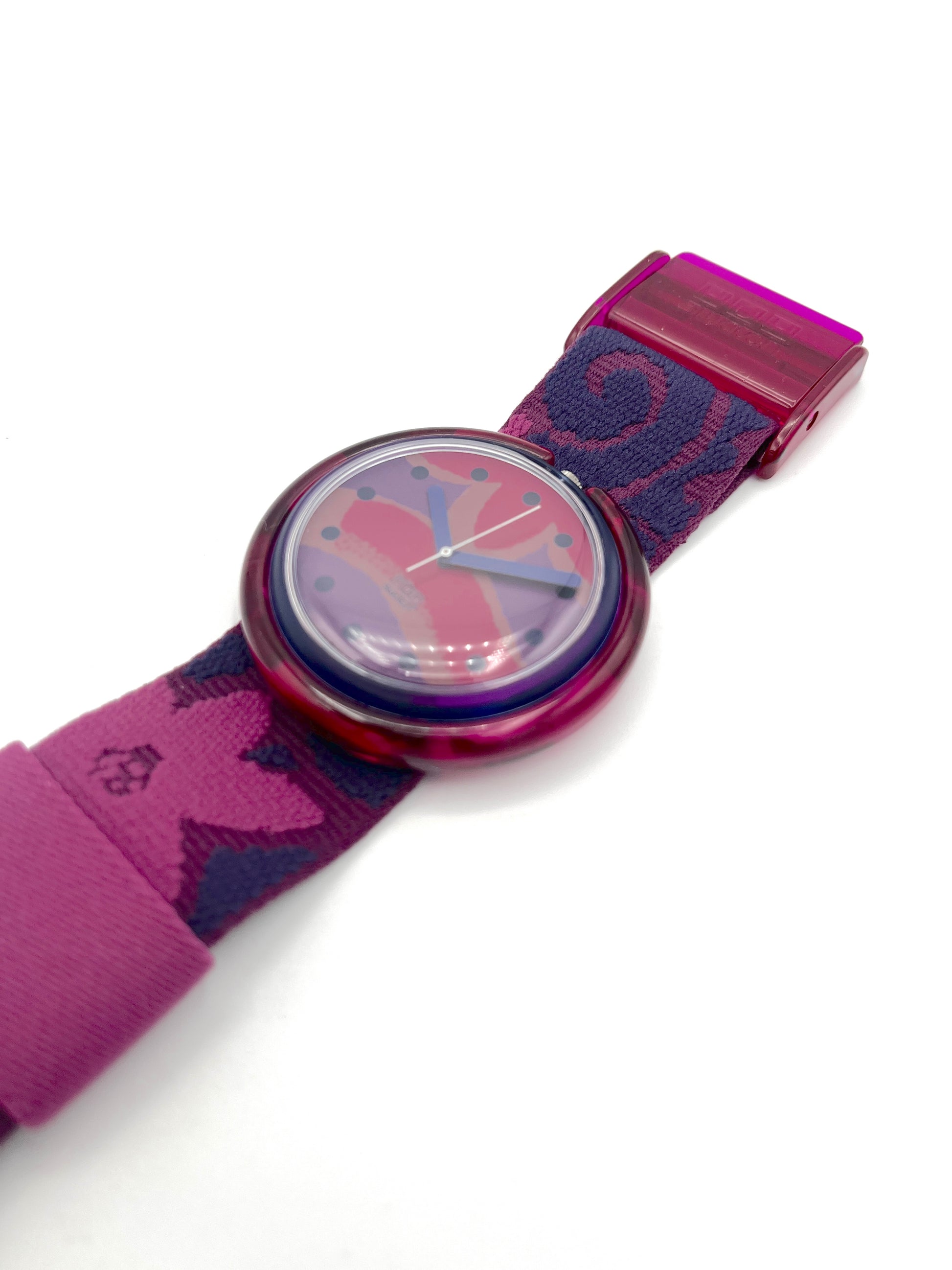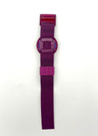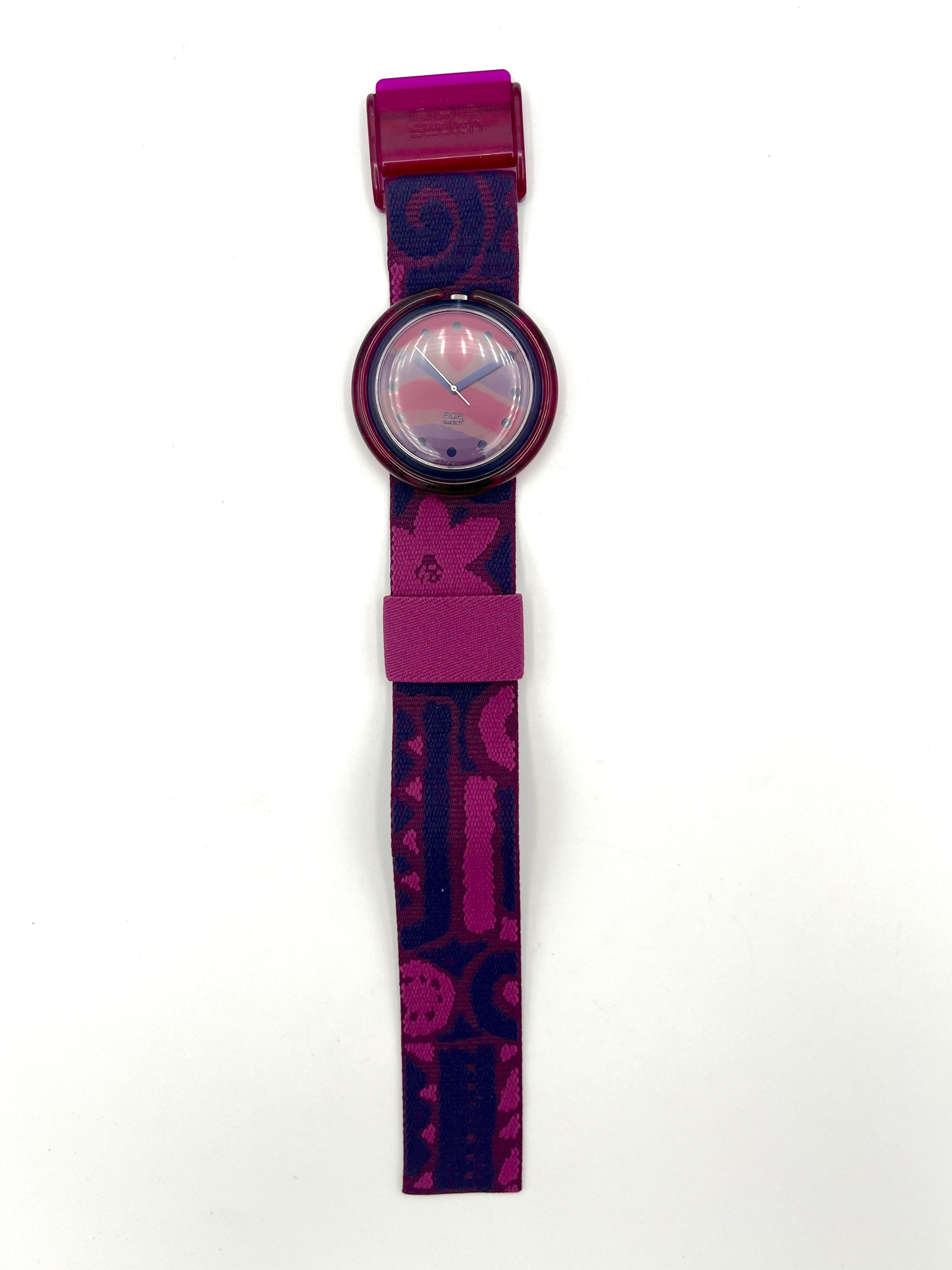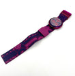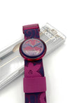 I Love My Pop – The Pop Swatch NDEBELE is a dream in pink and purple. On the soft textile strap, various shapes and surfaces are depicted in this play of colors. The dial is designed is kept in the same colors, purple circles are placed as indexes.