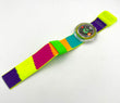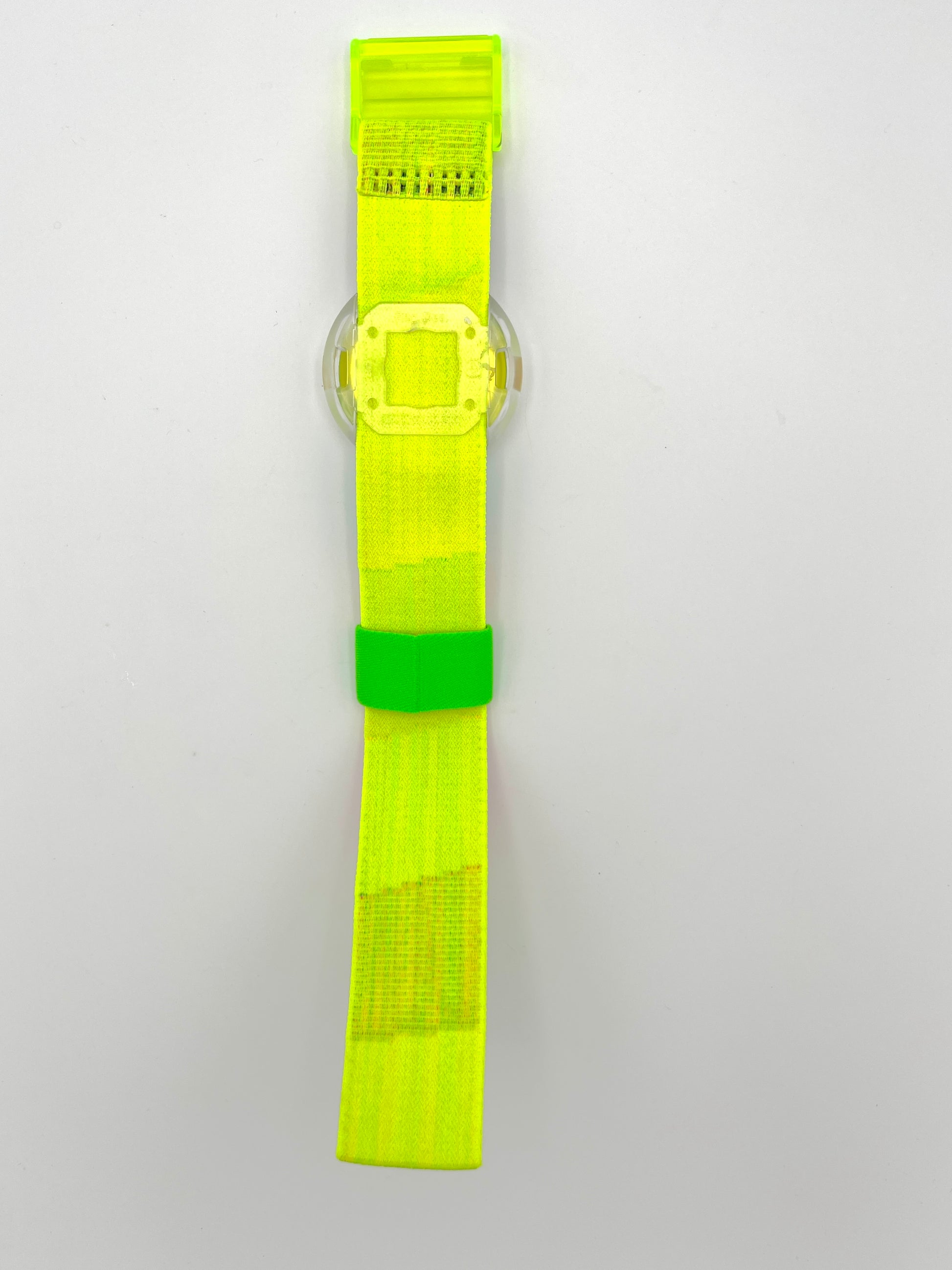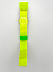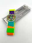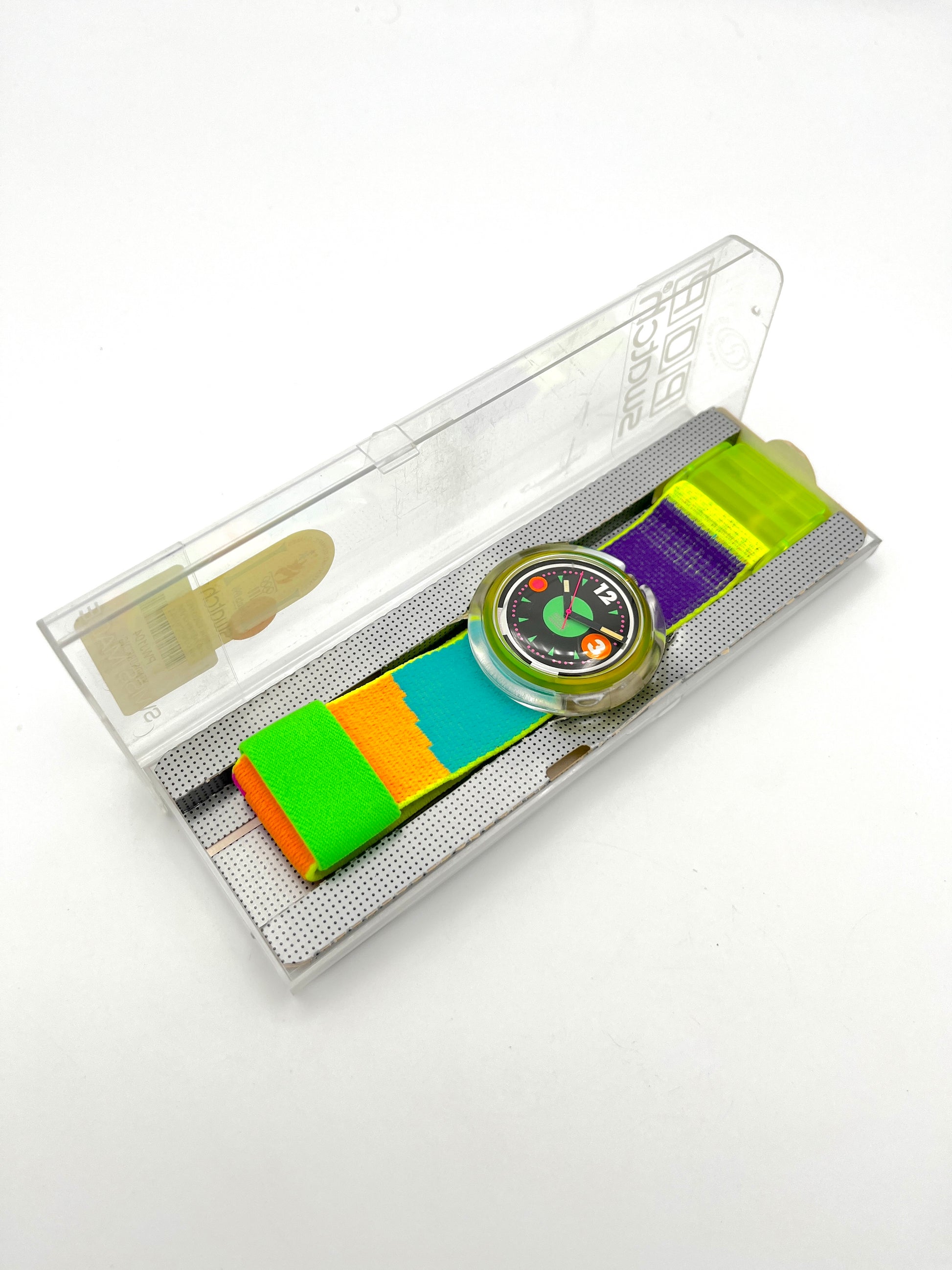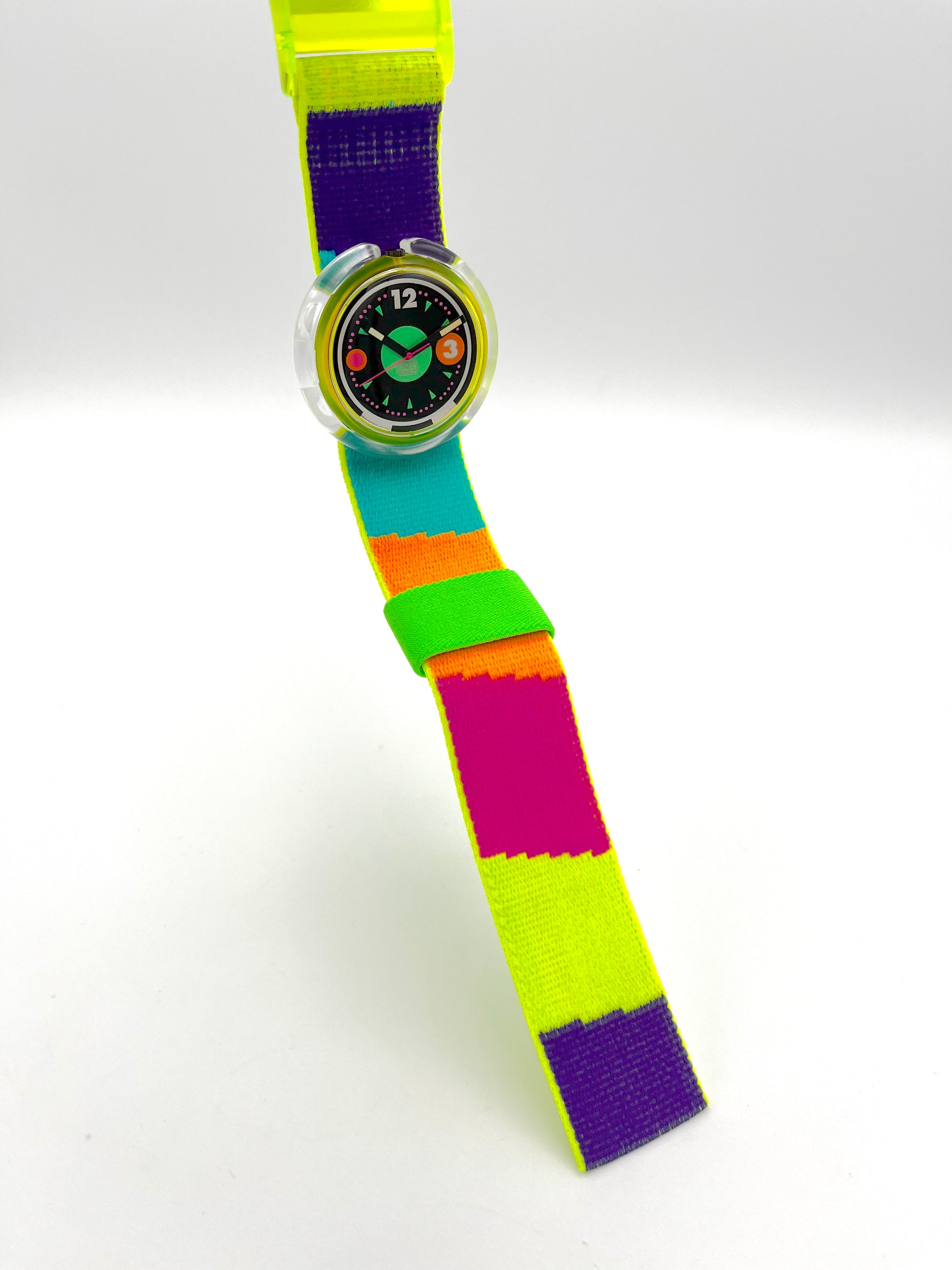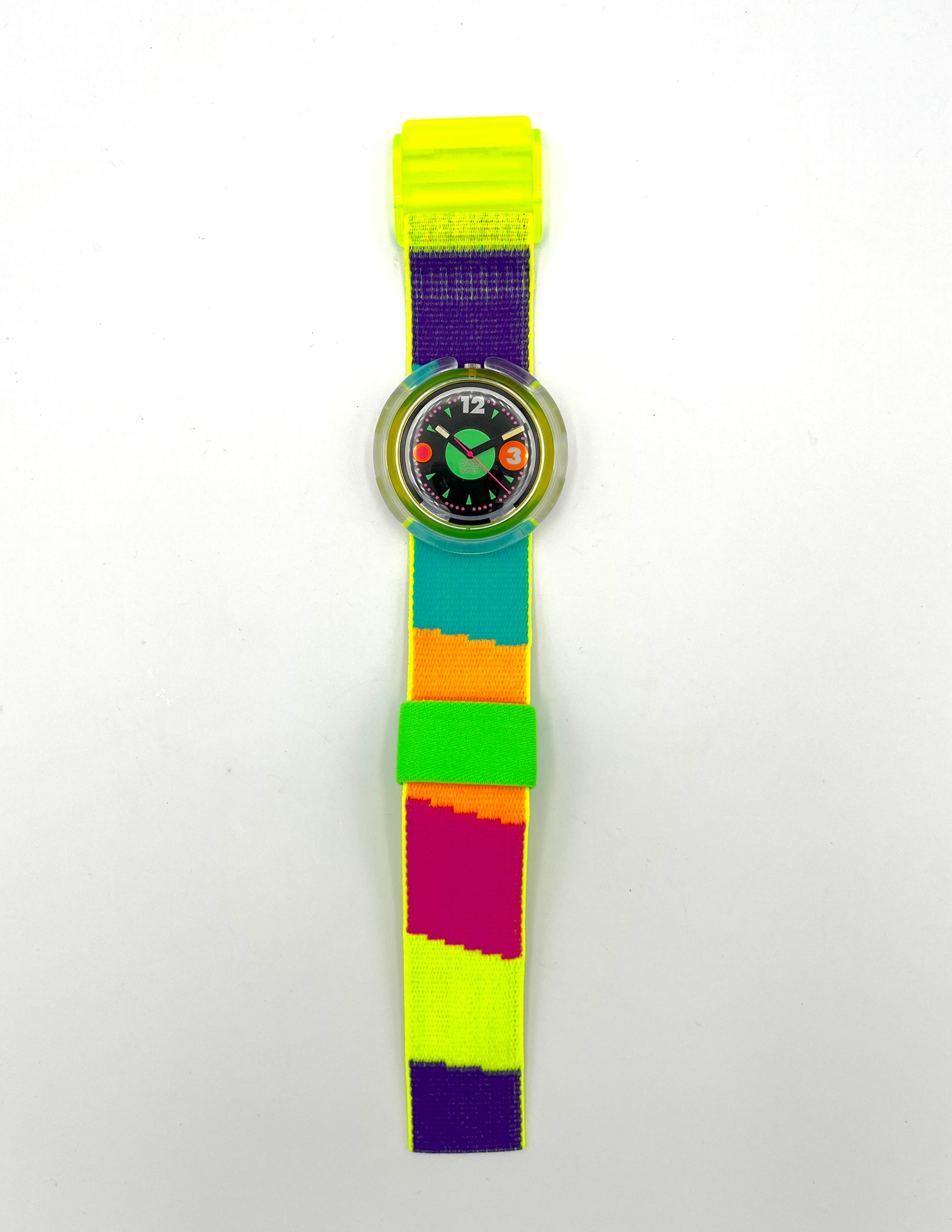 Summer Vibes – Bright, contrasting colors are displayed on the textile strap of the rare Pop Swatch WINDSURFING on large geometric surfaces. The lively watch appeared in the Spring/Summer 1993 collection.