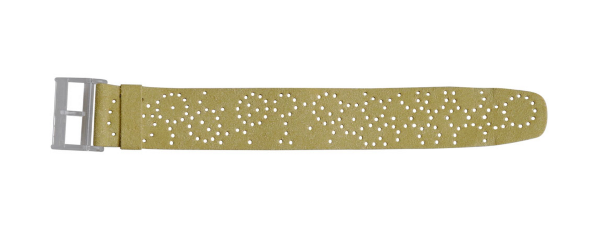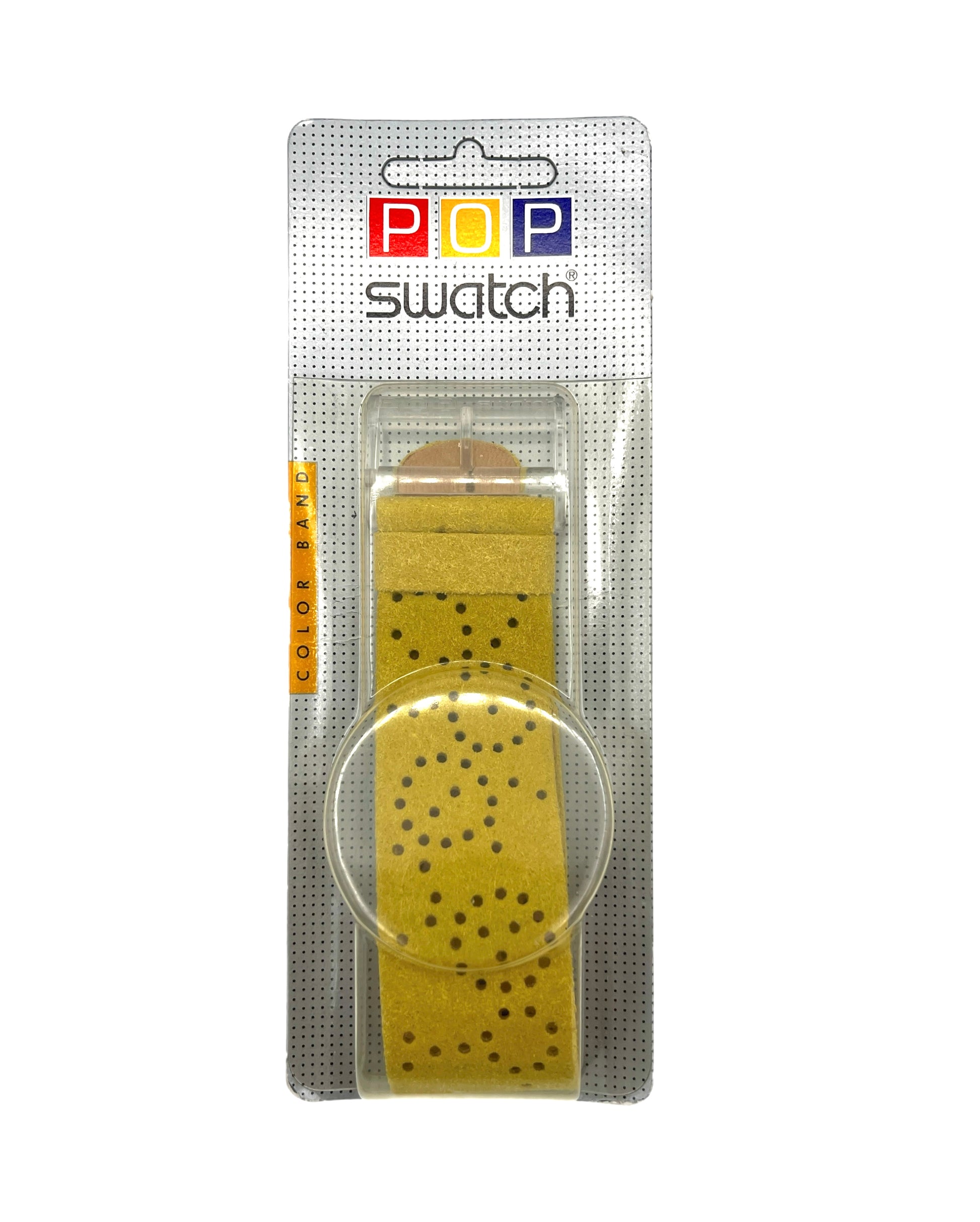 Classy Design – EPICE is a pretty Swatch leather strap with a perforated pattern. Small dots are punched into the mustard yellow suede strap, forming a geometric pattern. Every Pop Swatch with a ring is compatible with the strap, which is fastened with a transparent pin buckle.