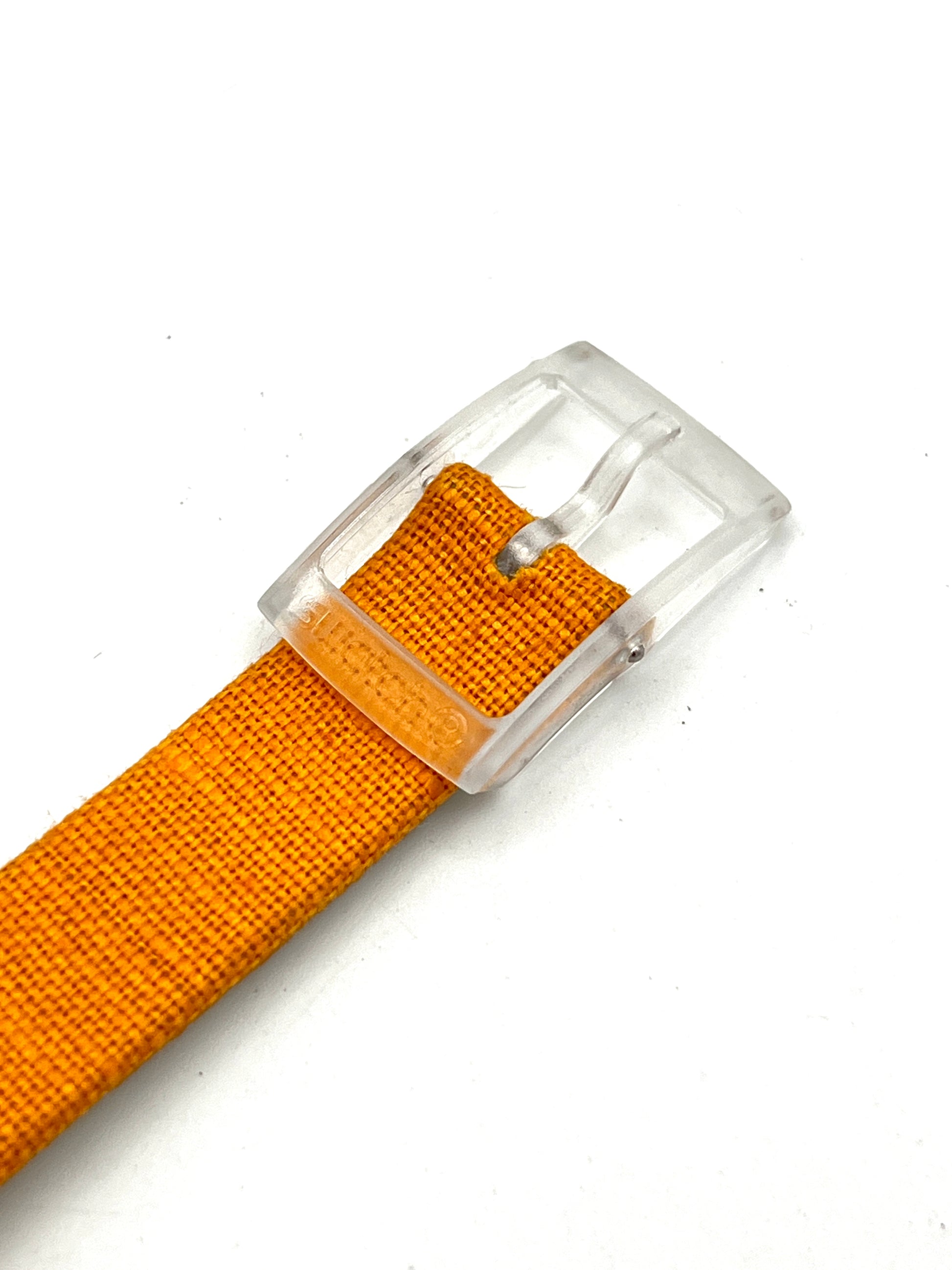 12mm Lug Size – PERENNIAL BEAUTY is a stylish Swatch leather strap with an orange linen fabric surface. A transparent plastic buckle serves as the clasp.
