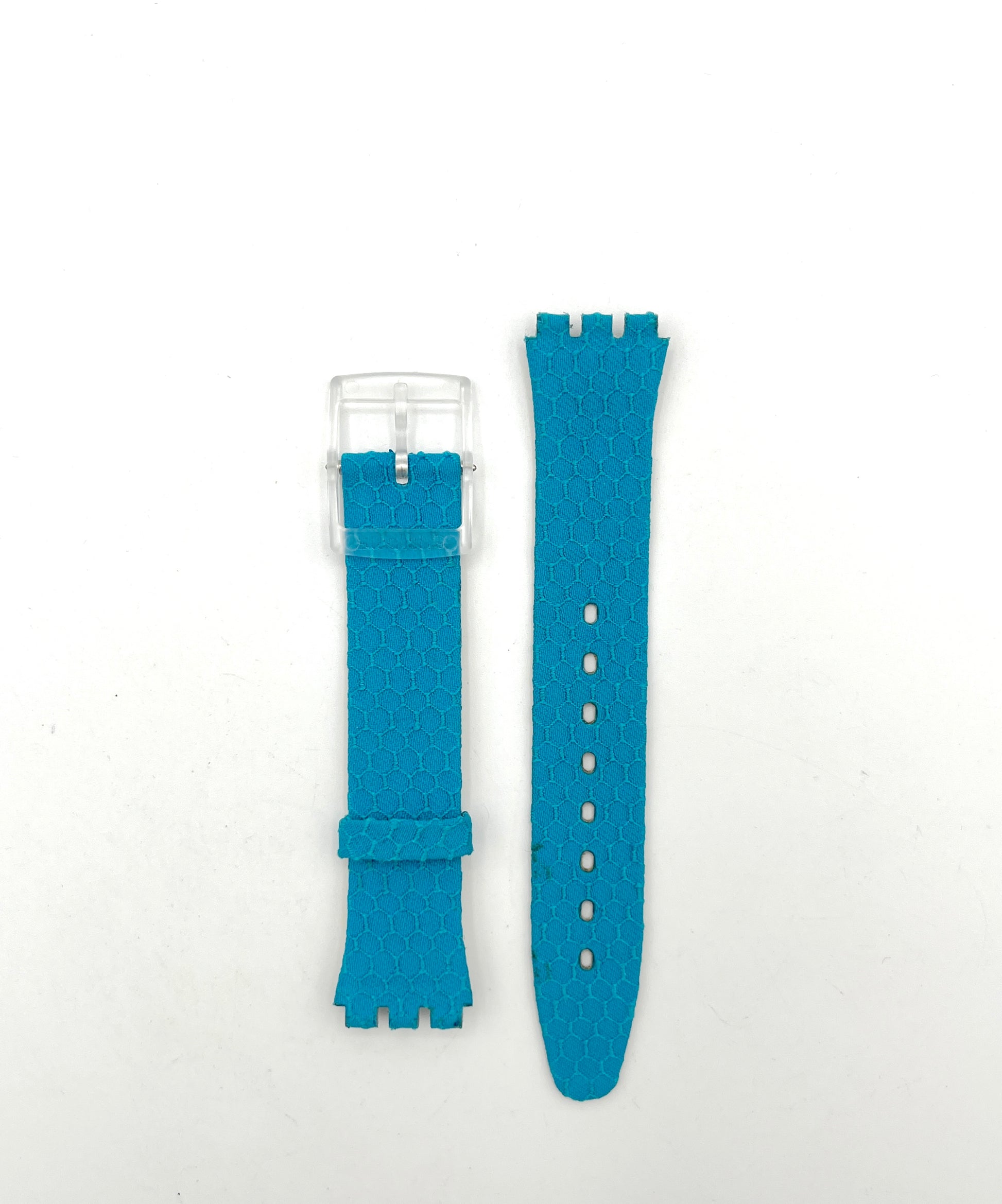 Blue textured watch strap on a white background