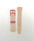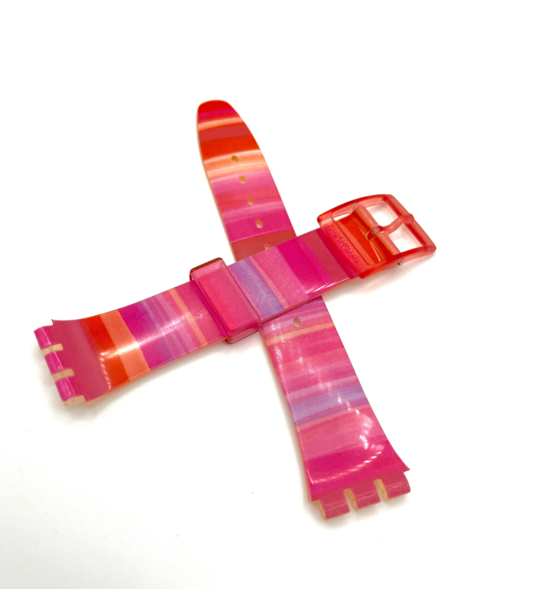 Perfect Fit – The Swatch ASTILBE plastic watchband features stripes in various shades of pink, orange, and purple. It fastens with a pink transparent buckle and fits any Swatch watch with a 17 mm lug width.