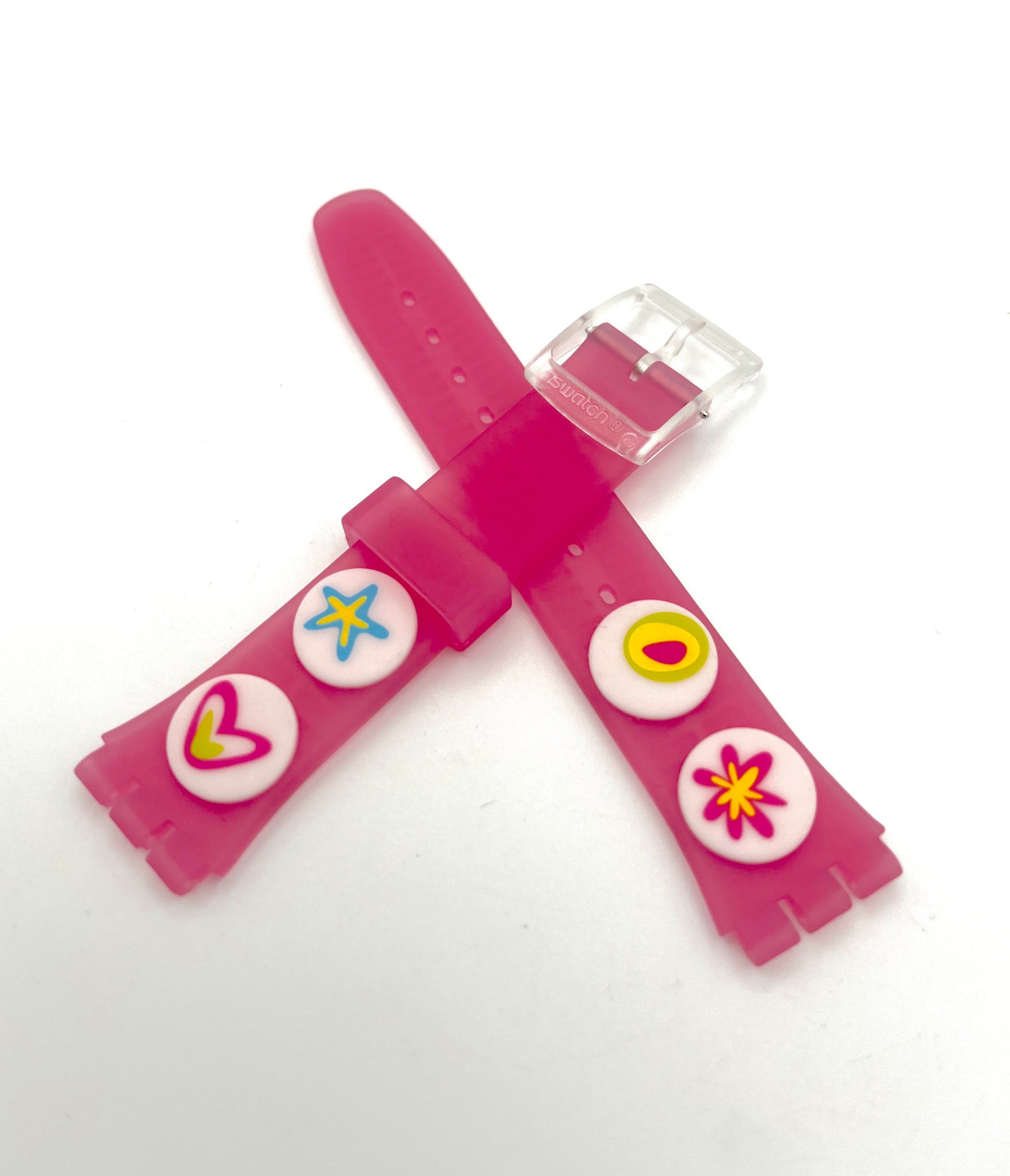 Perfect Fit – PINK CANDY is a pink transparent Swatch rubber strap with a transparent plastic buckle. The strap features round badges reminiscent of candy. Any Swatch watch with a 17 mm wide strap attachment fits this playful strap.