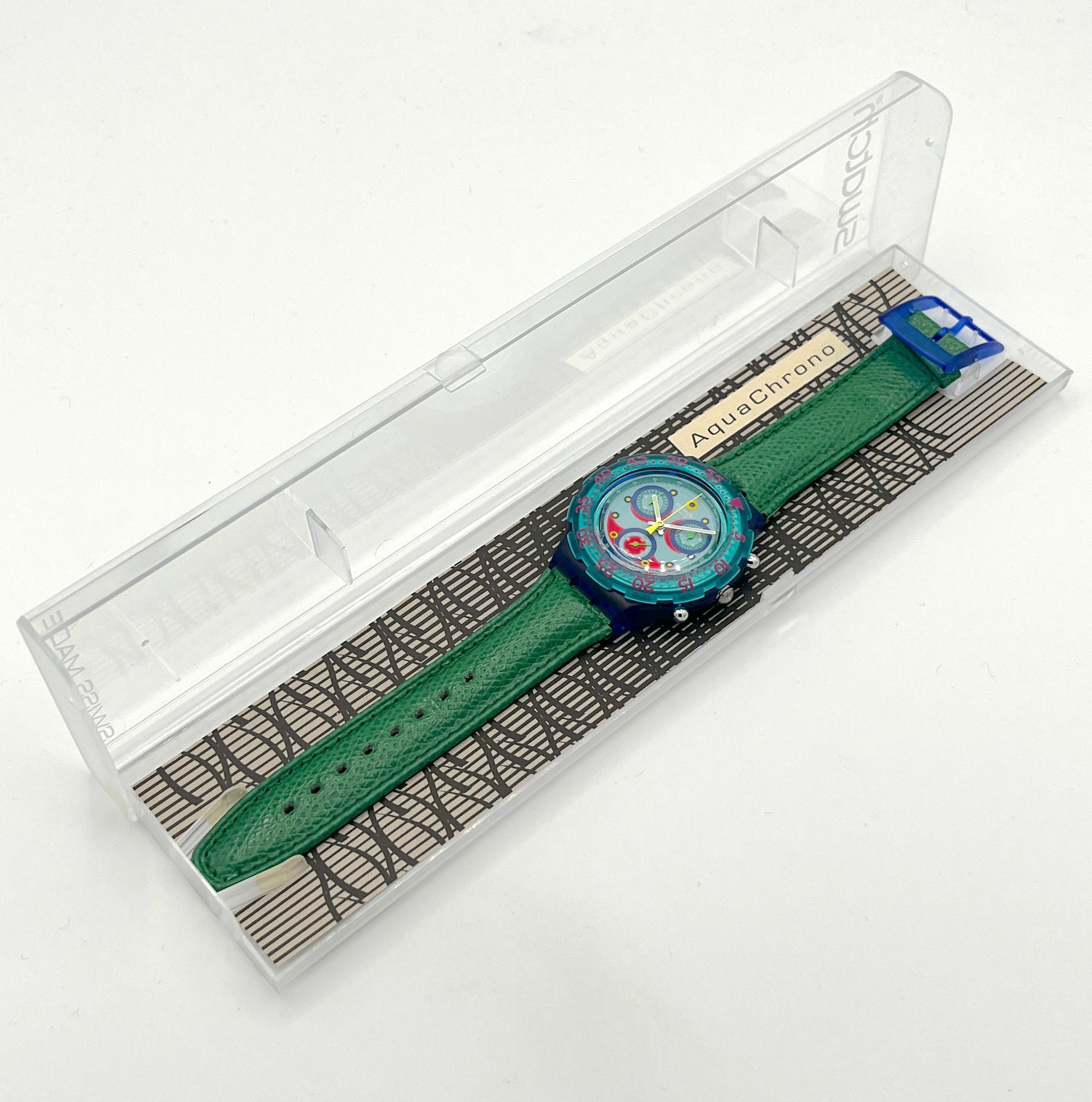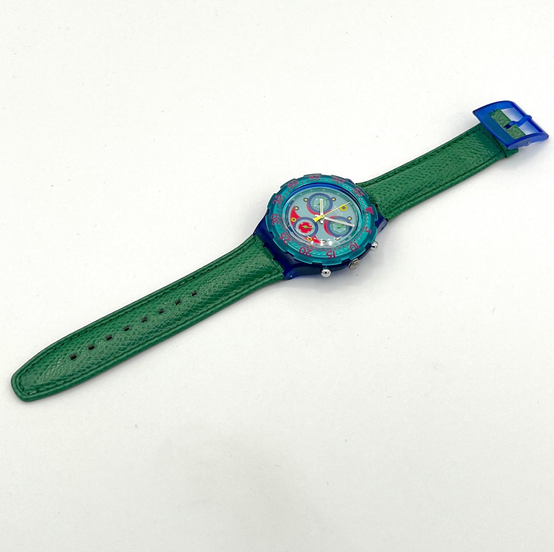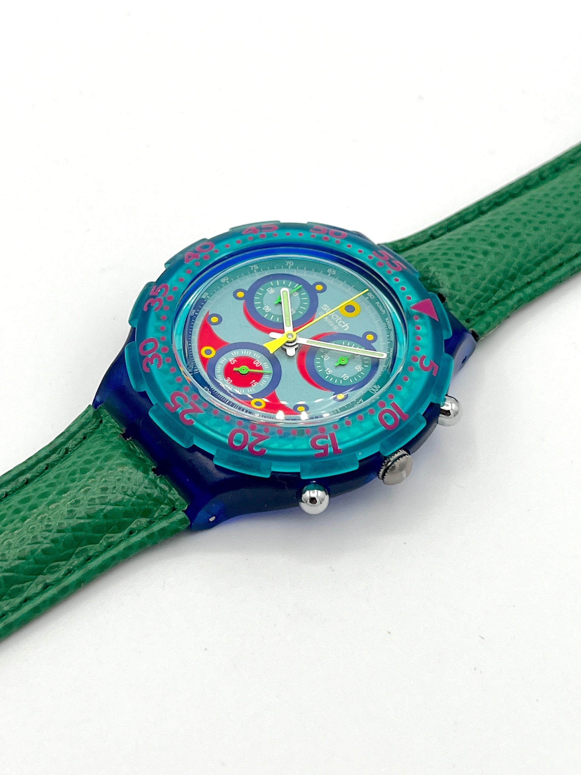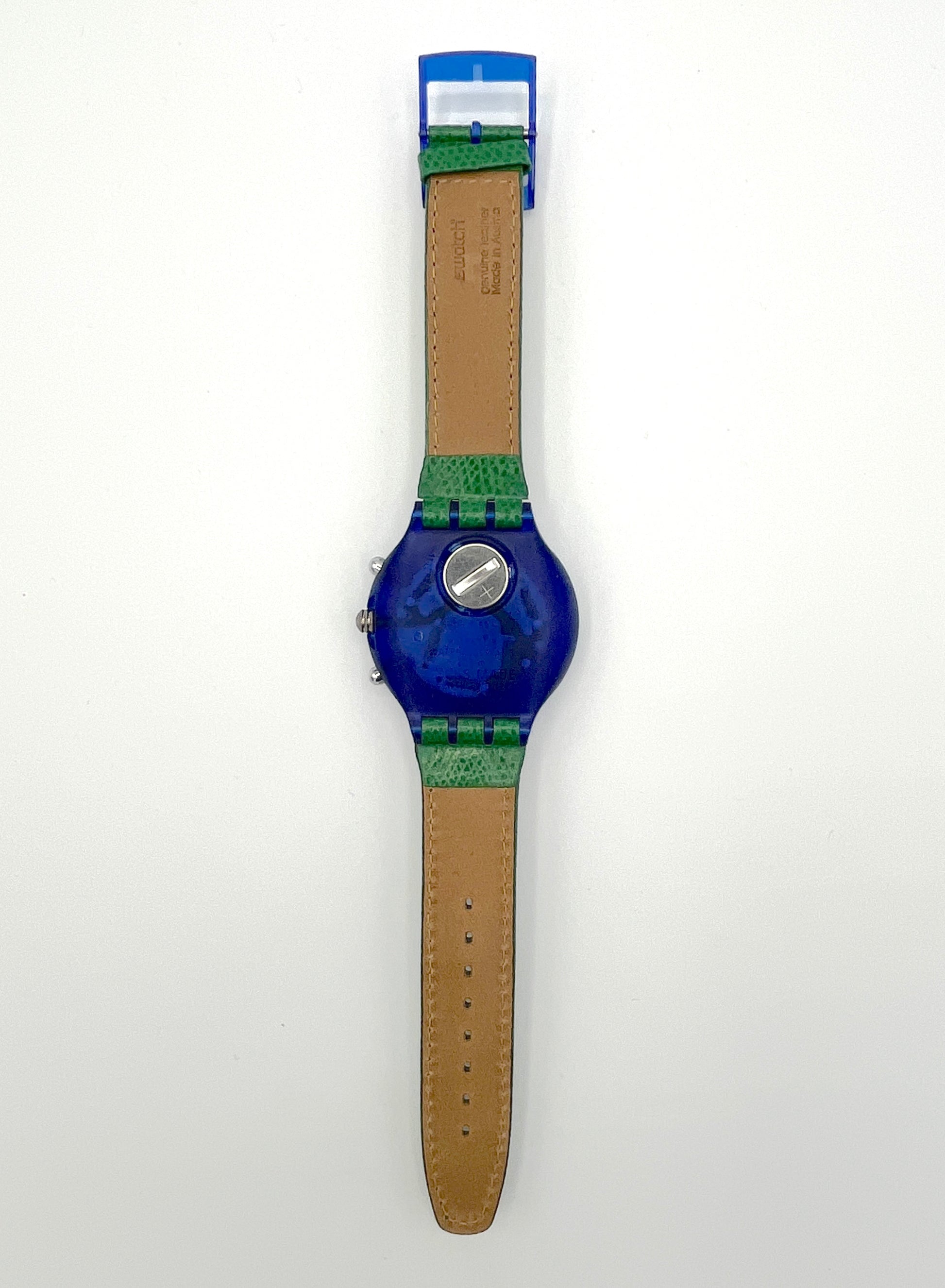 Green Leather Strap – The Swatch Aqua Chrono BLUE SKY is dominated by the colors green and blue.