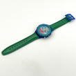 Colorful watch with a green strap on a white background