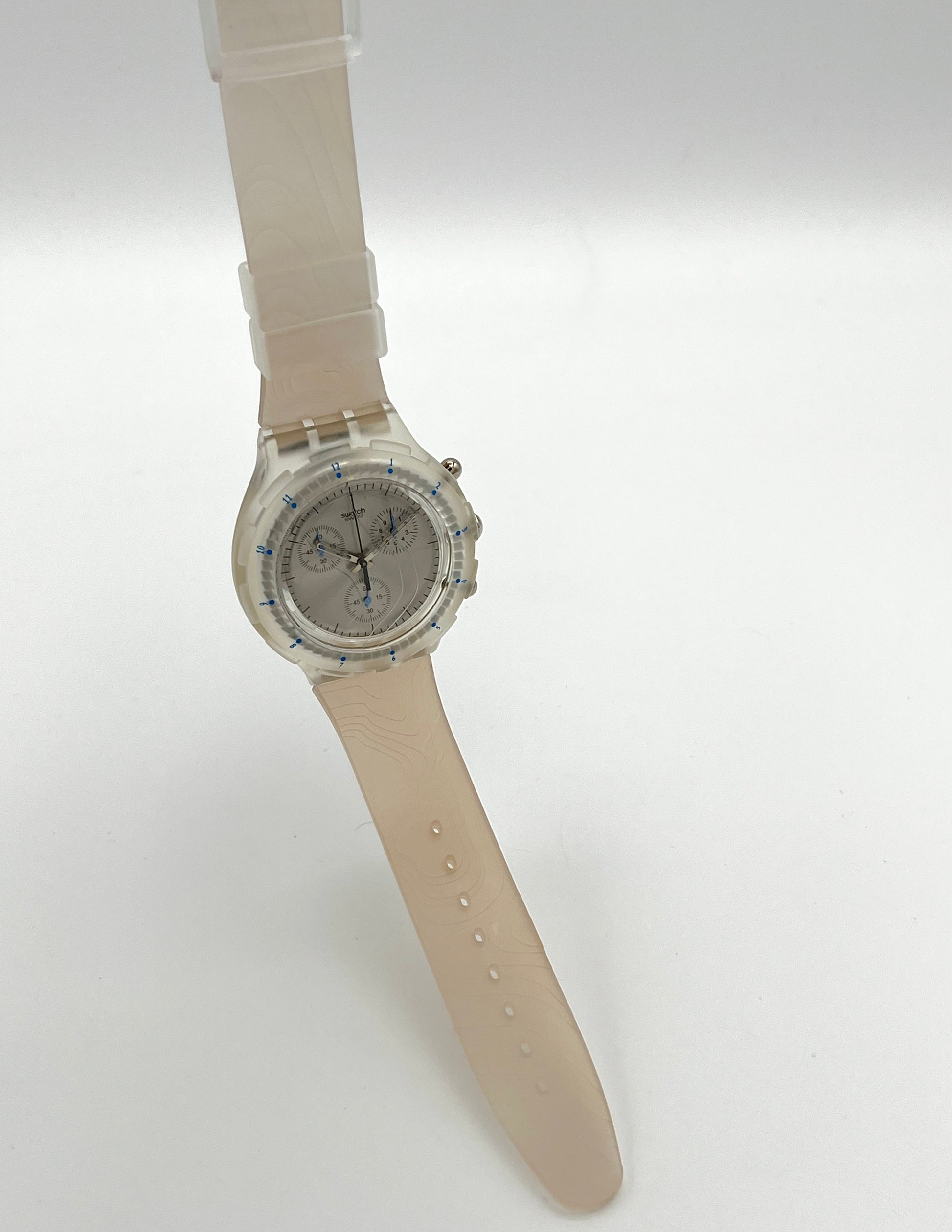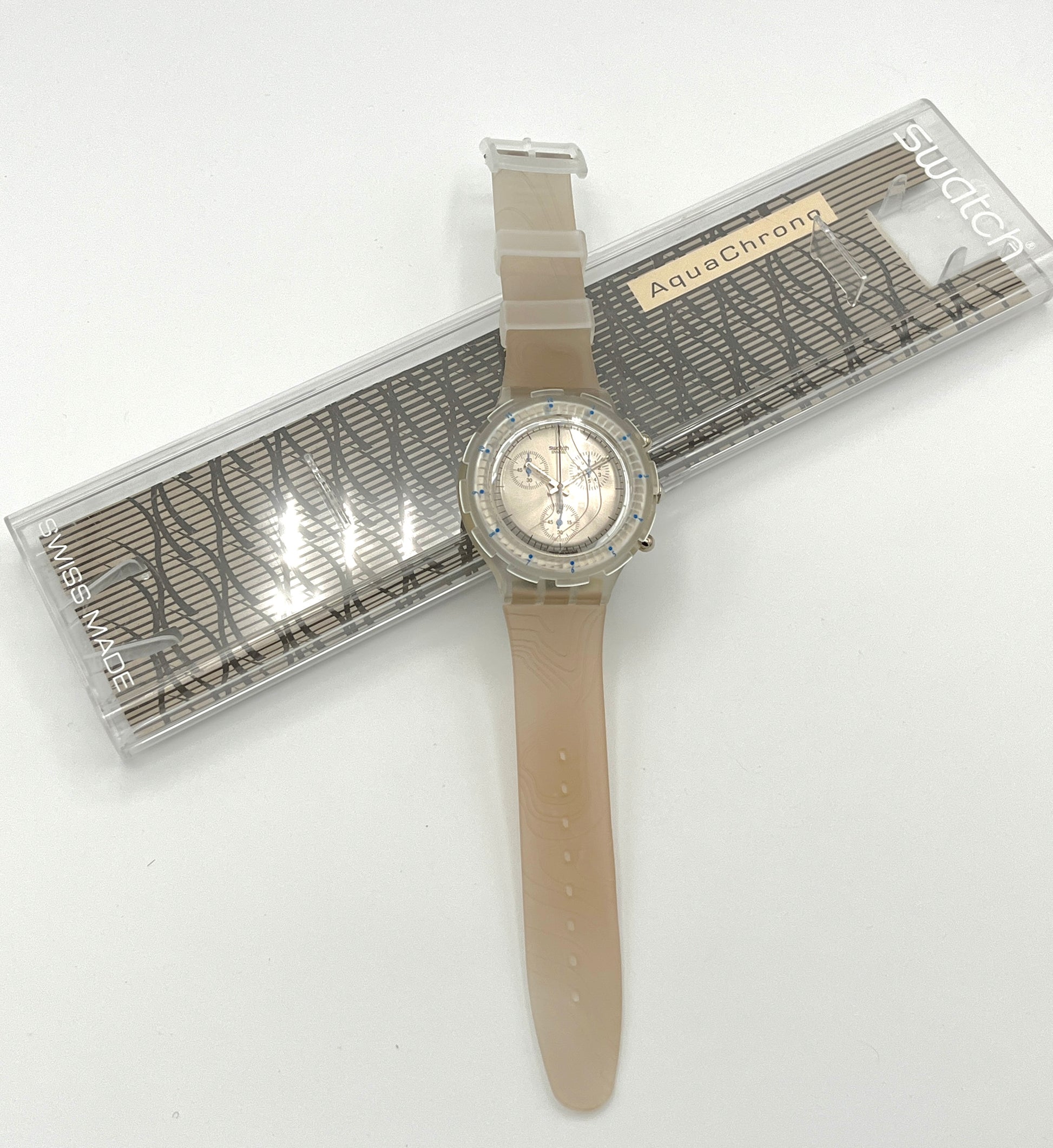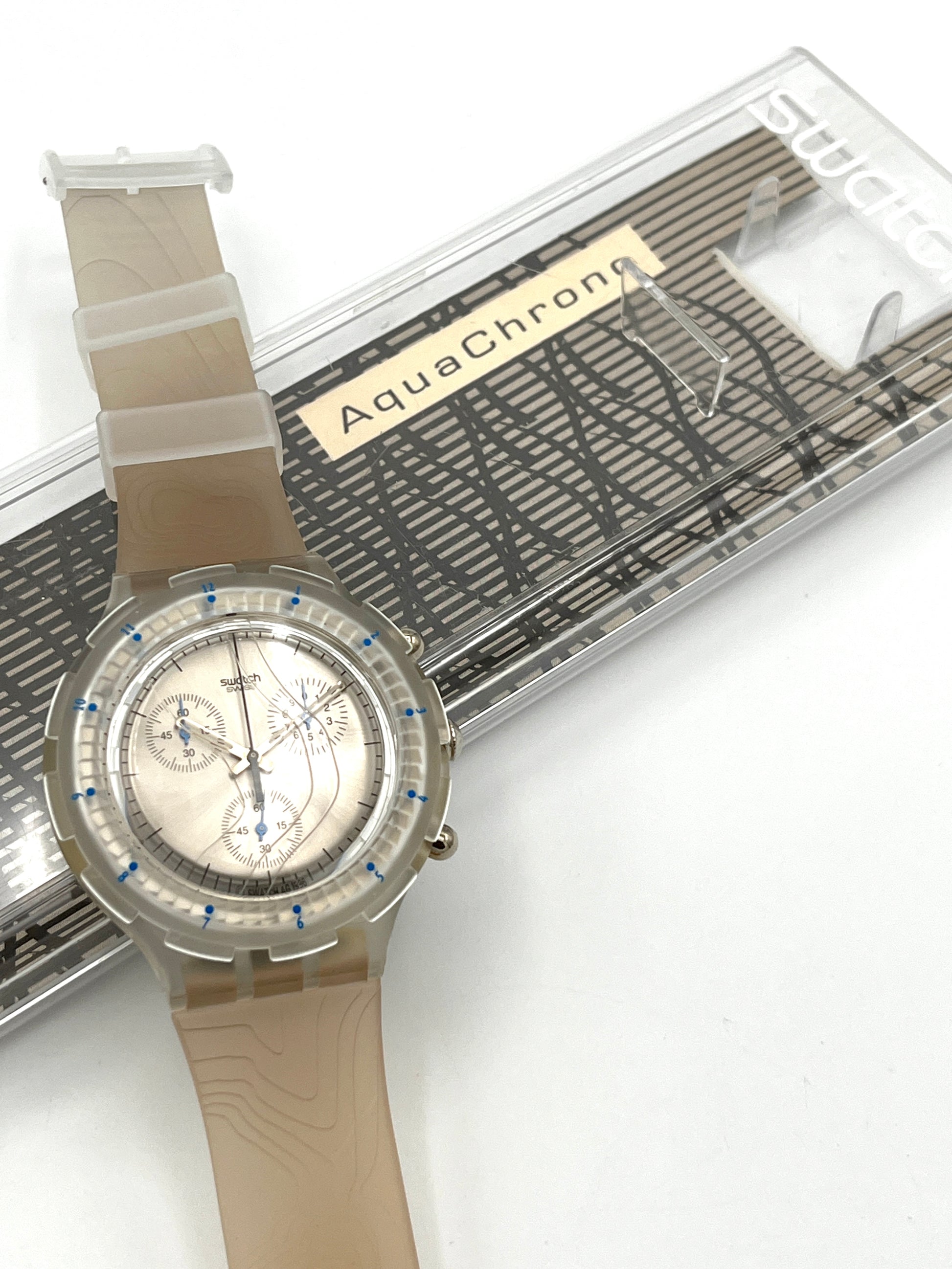 Water-Resistant Design – This Swatch Aqua Chrono CARTOGRAPHIC from 1997 stands out thanks to the cartographic relief on its plastic strap.