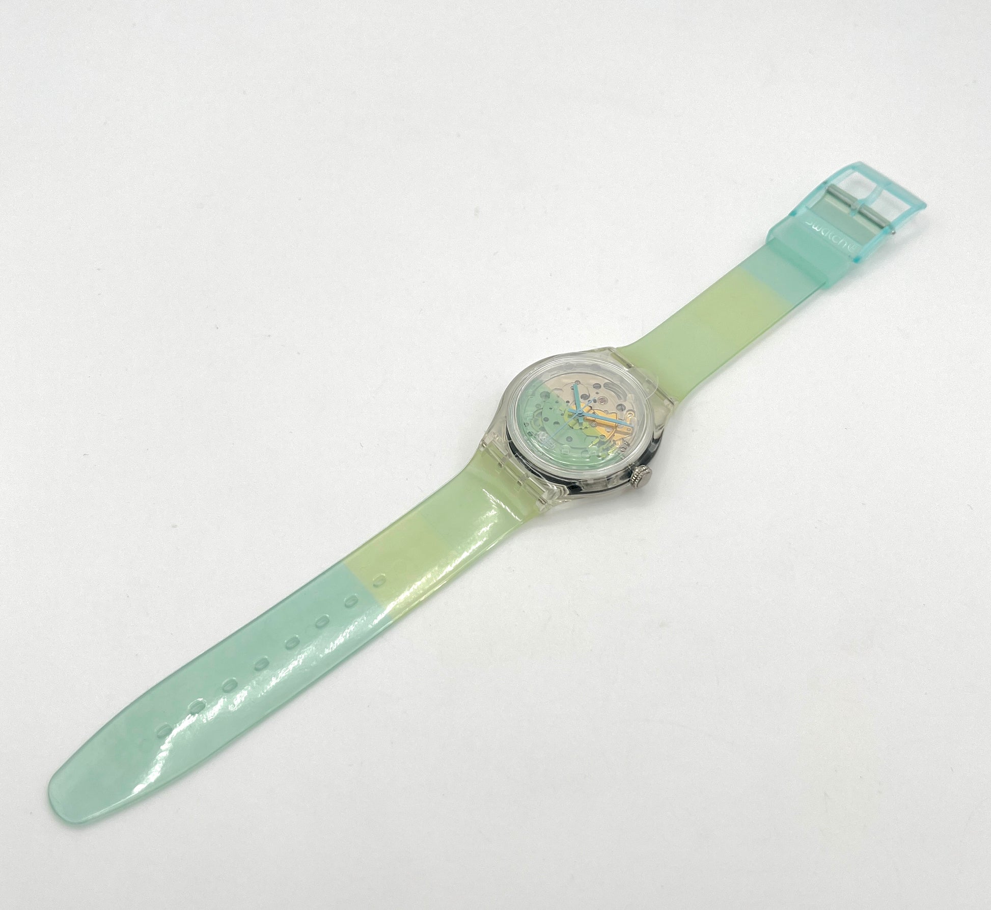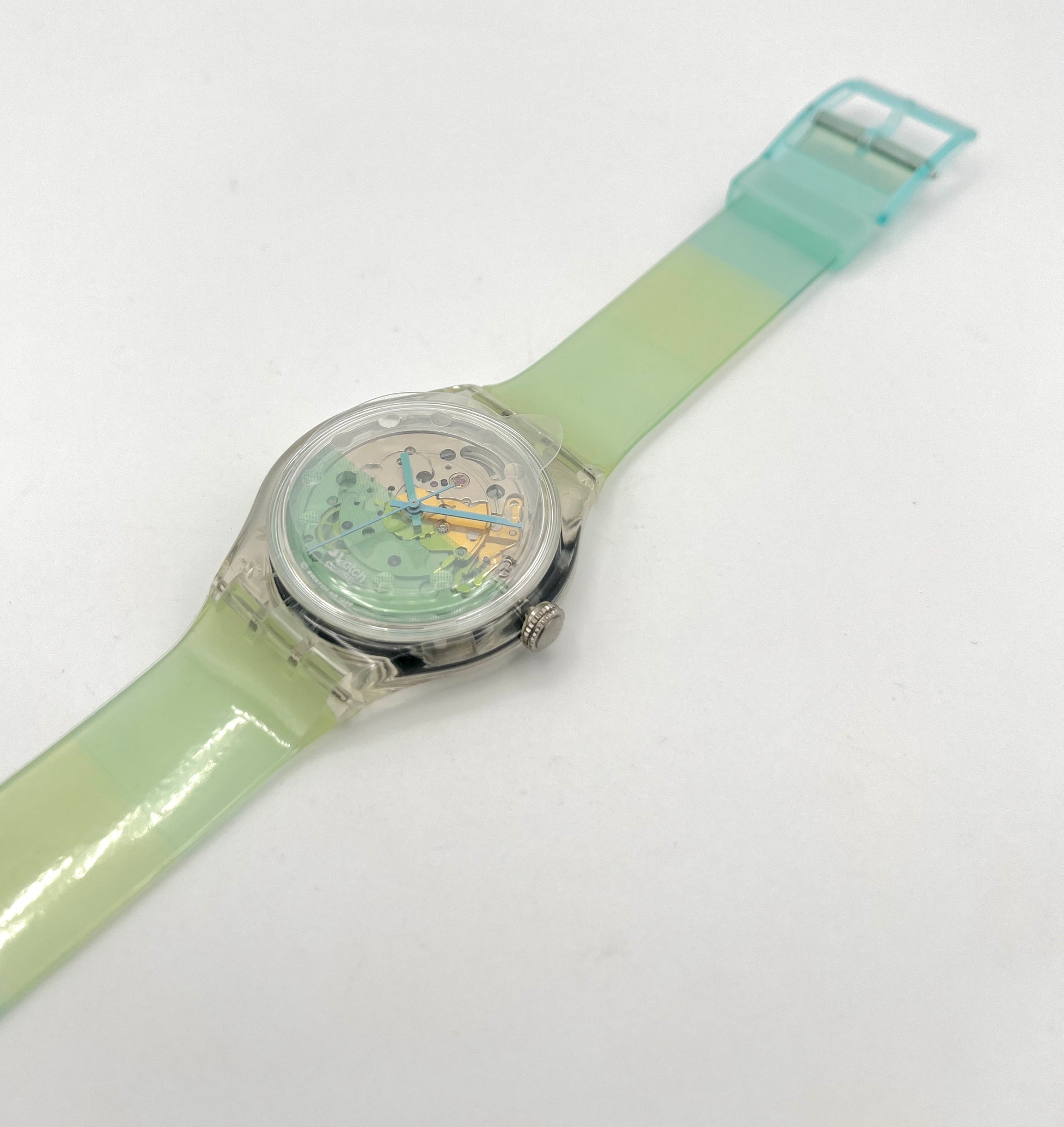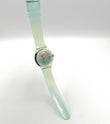 Green wristwatch with transparent case on a white background