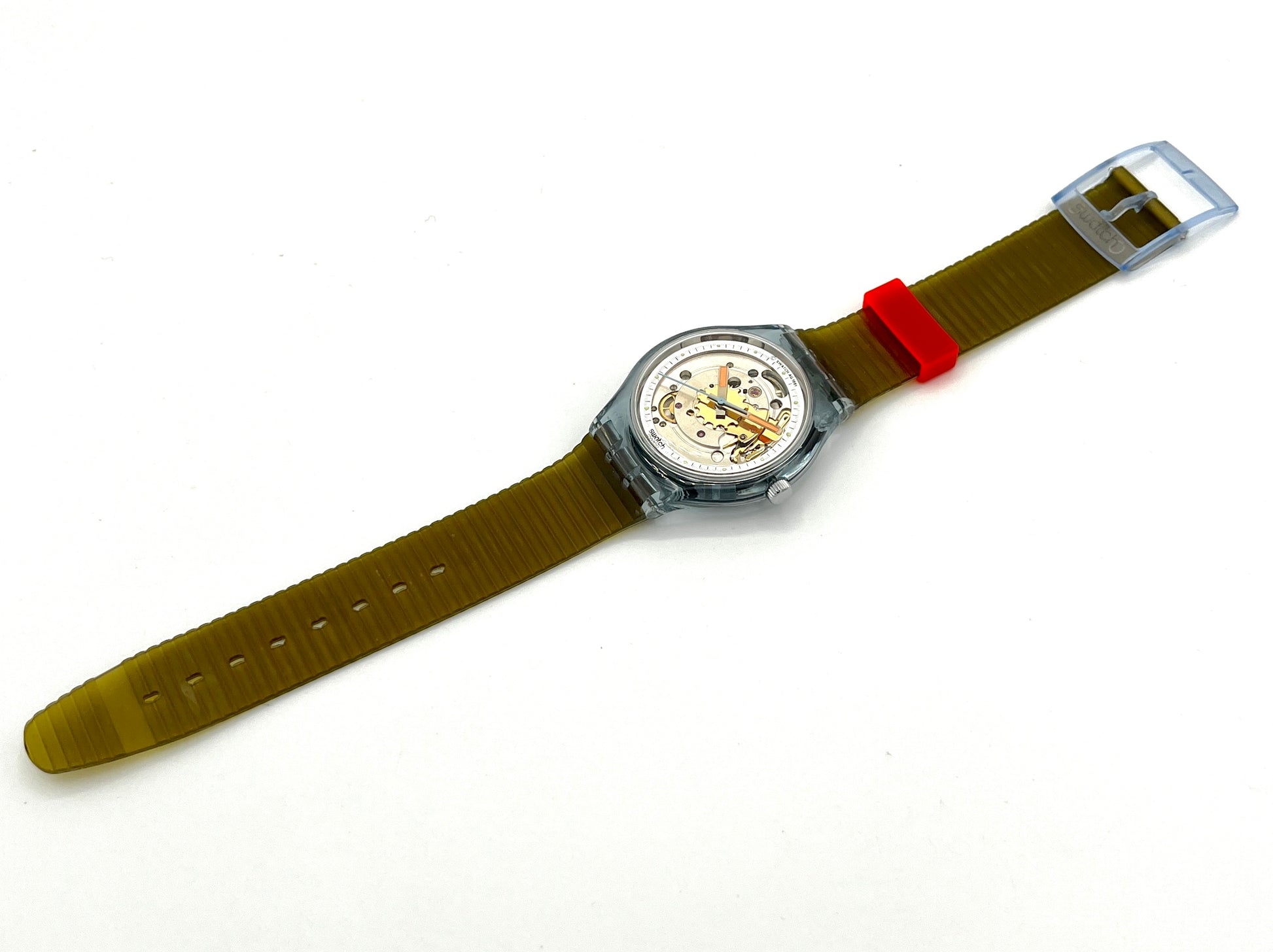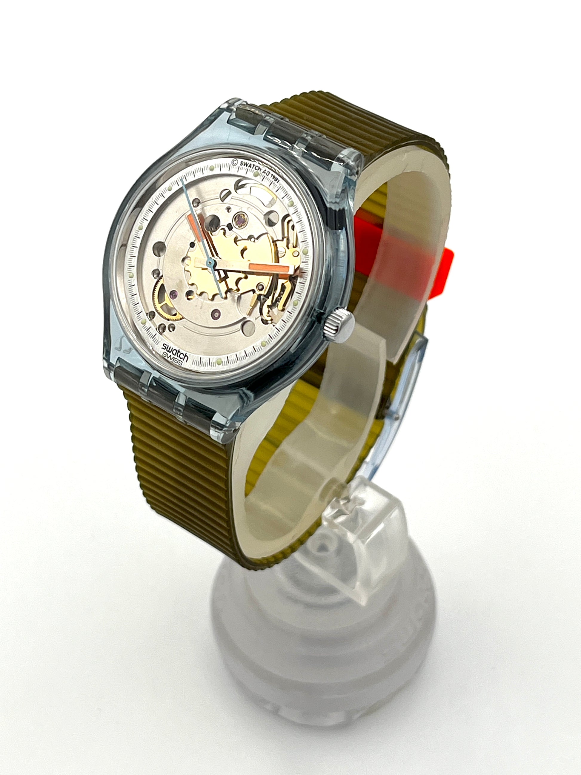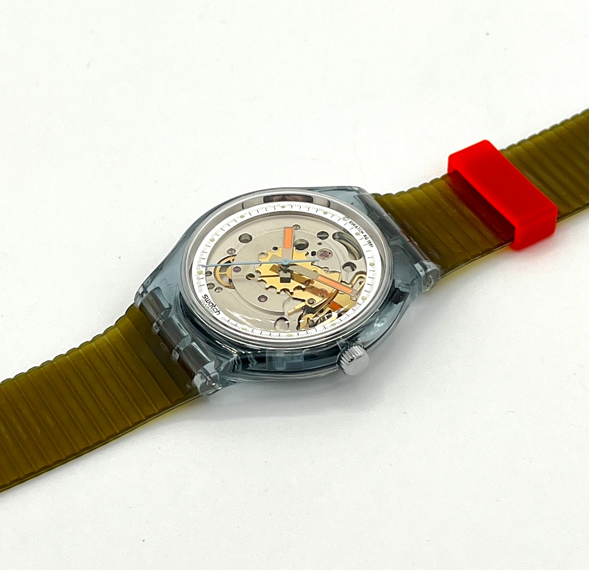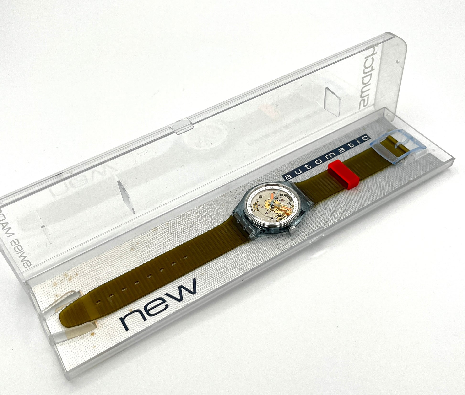 Very First Swatch Automatic – The Swatch Blue Matic SAN100 was the very first Swatch Automatic that Swatch launched in 1991 as part of a brand new product line. The second version is characterized by the banana-shaped window at the 12 o'clock position.