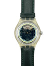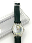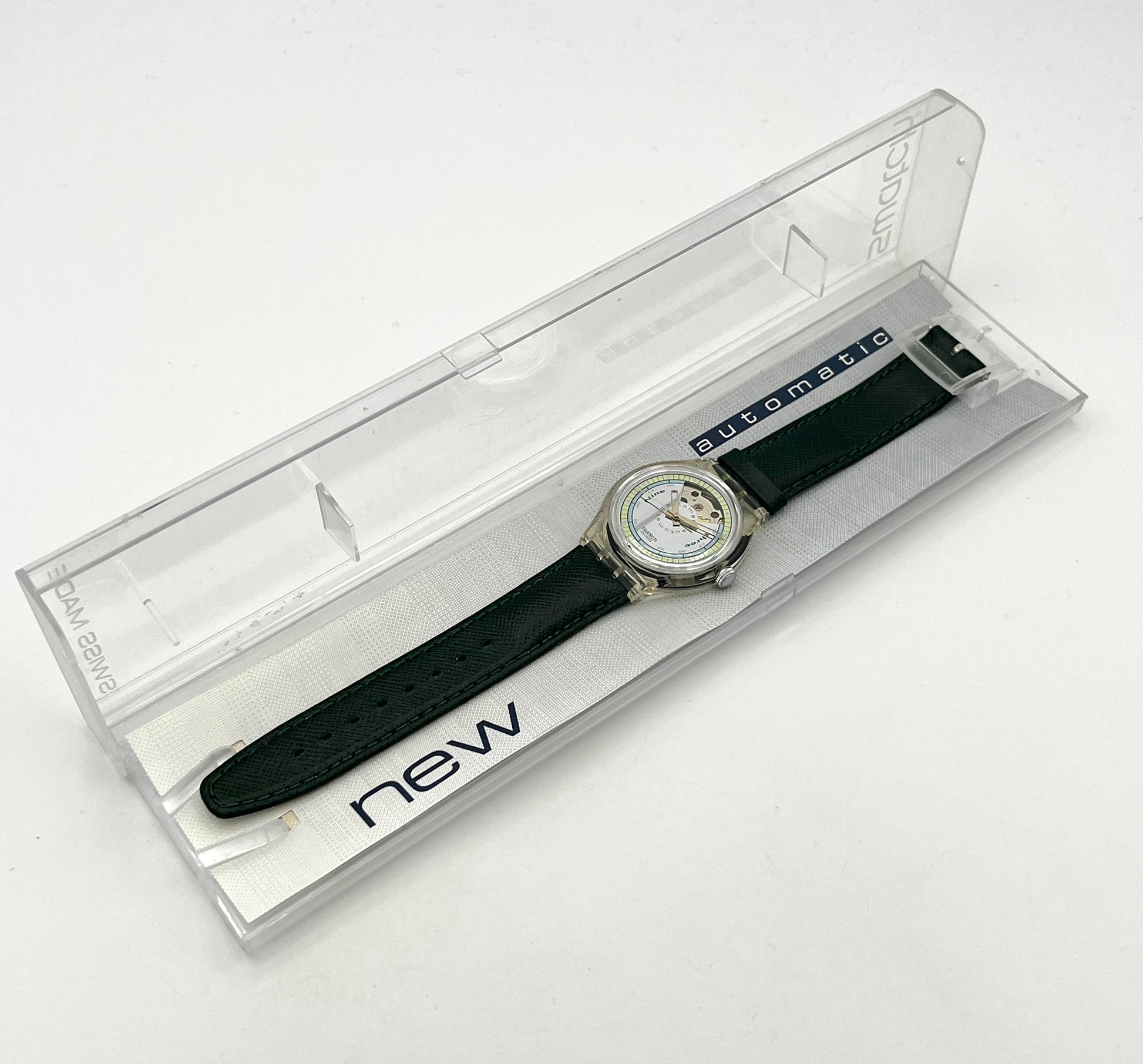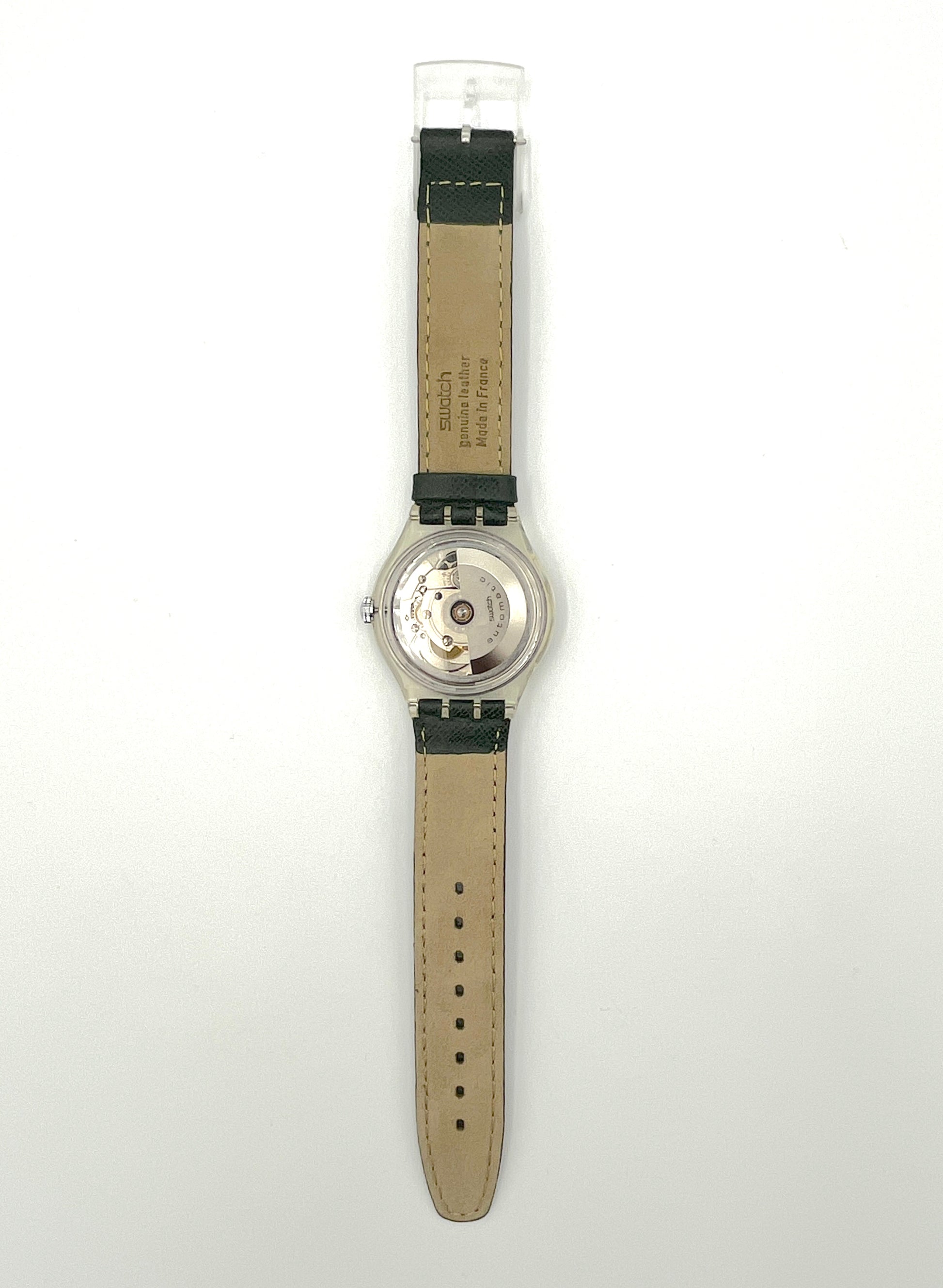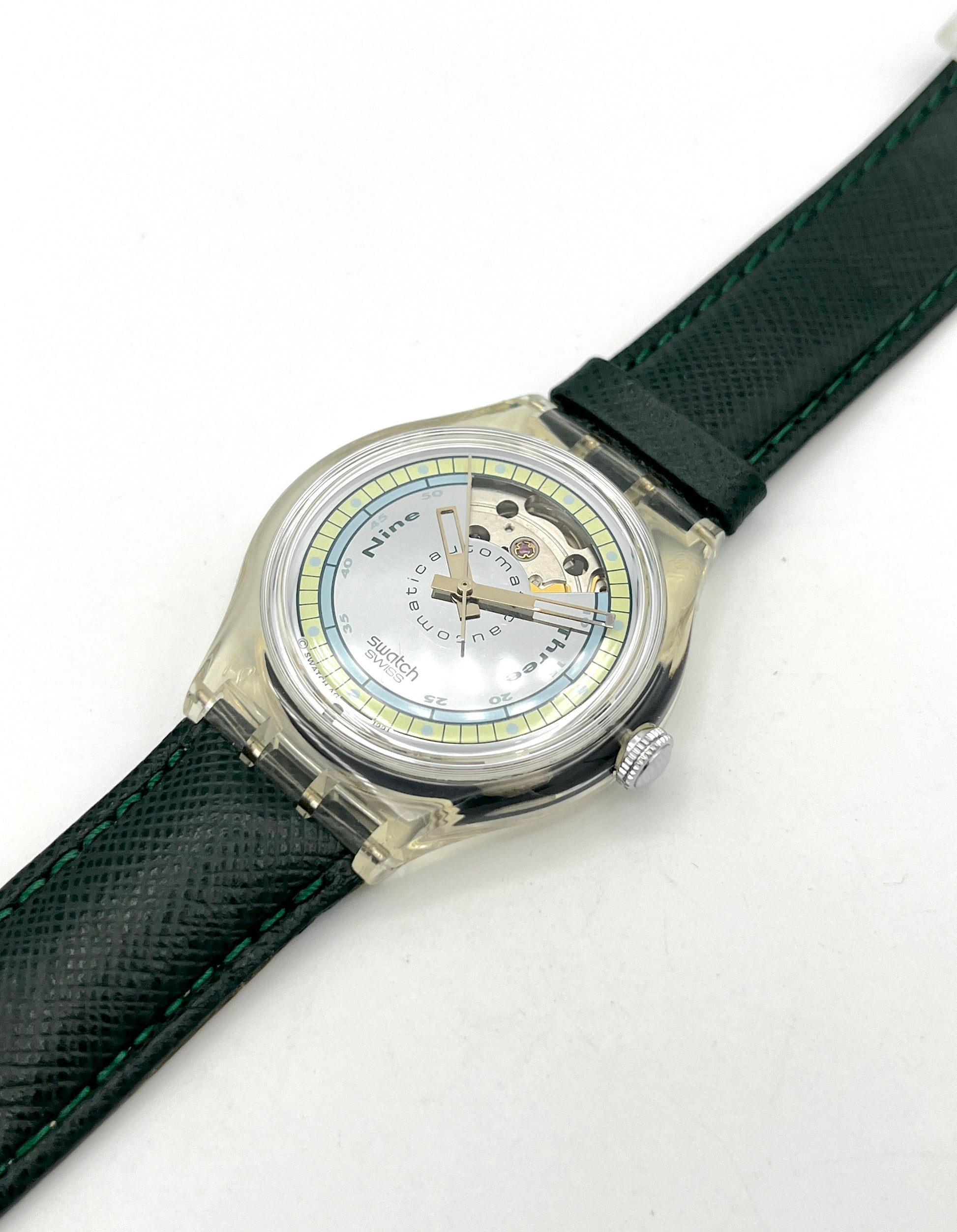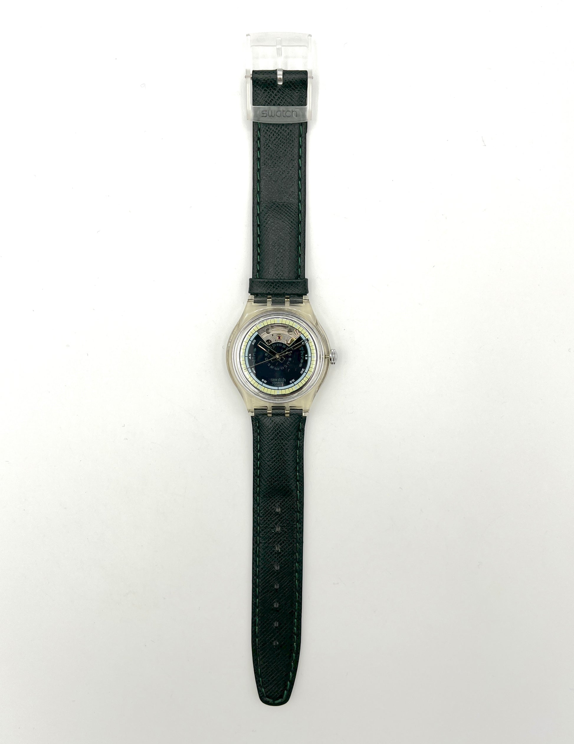 Mirror Dial – This 1992 Swatch watch has a reflective dial and a dark green leather strap with a cross-hatch pattern. The case and buckle are made of transparent plastic.