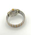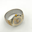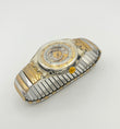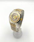 'Serti Misterieux' Design – Gold-tone dial with fixed zodiac sign markers; transparent case; two-tone gold and silver flexible metal strap.
