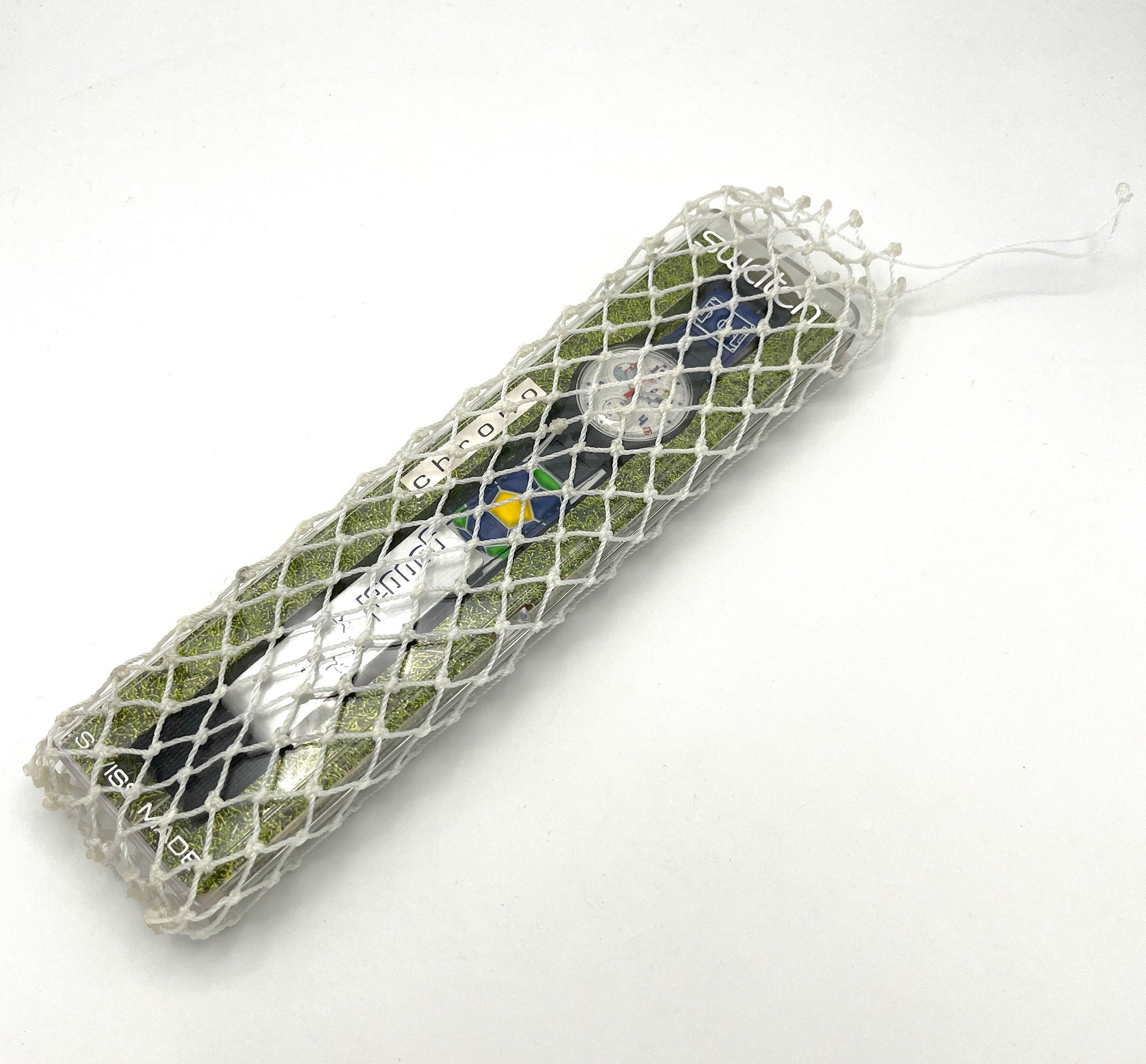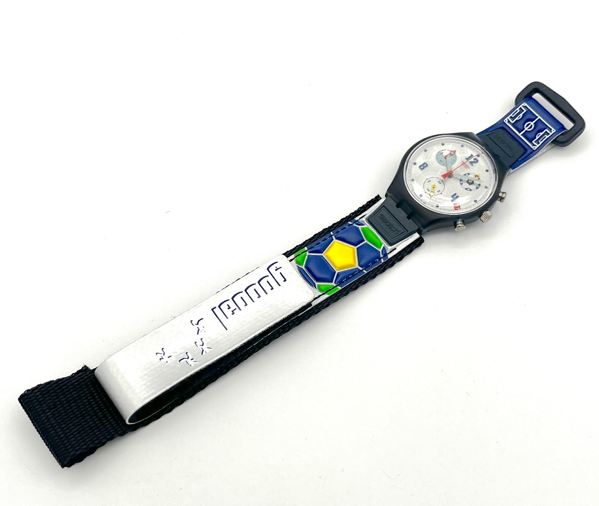 World Cup 1998 Chrono – The Swatch Chrono GOOOAL -BRAZIL was created for the 16th FIFA World Cup in France in 1998. The silver dial features the structure of a soccer ball with chronograph functions. There is also a date display at the 4 o'clock position. The waterproof watch is equipped with a precise ETA quartz movement with a stop function. The sporty Velcro strap is decorated with a layout of the playing field, and the soccer ball depicted has the national colors as a honeycomb structure.