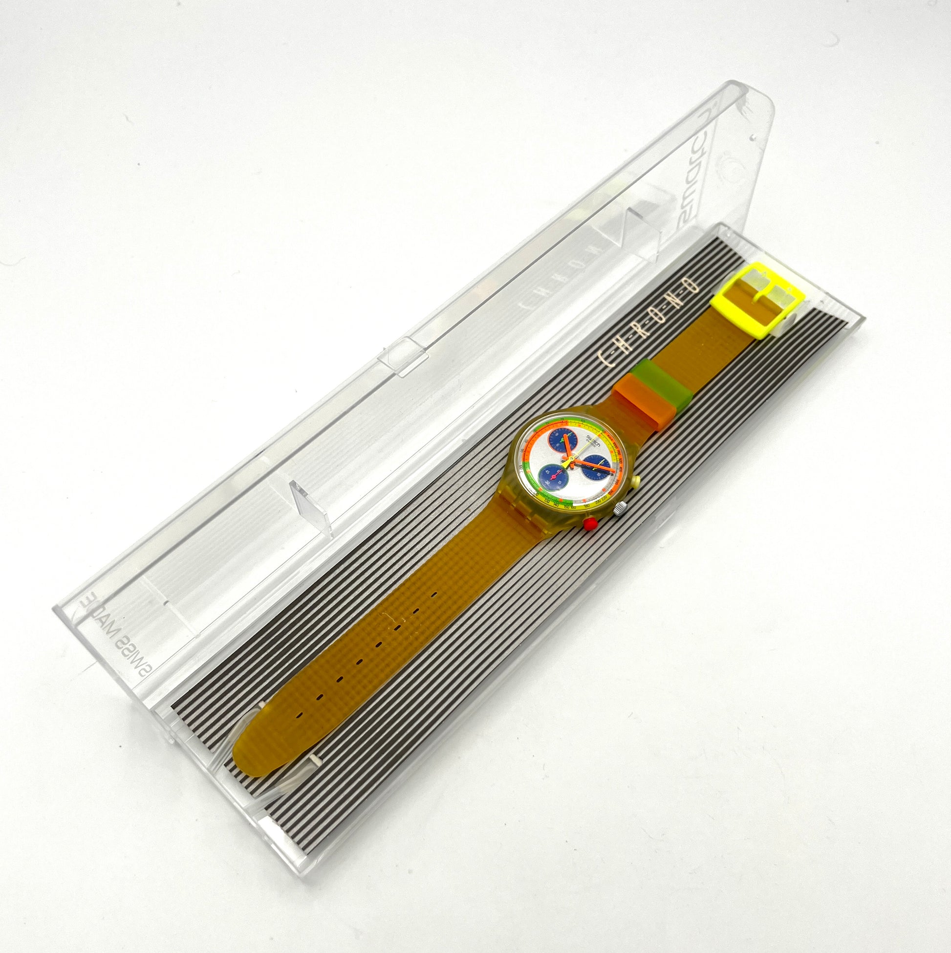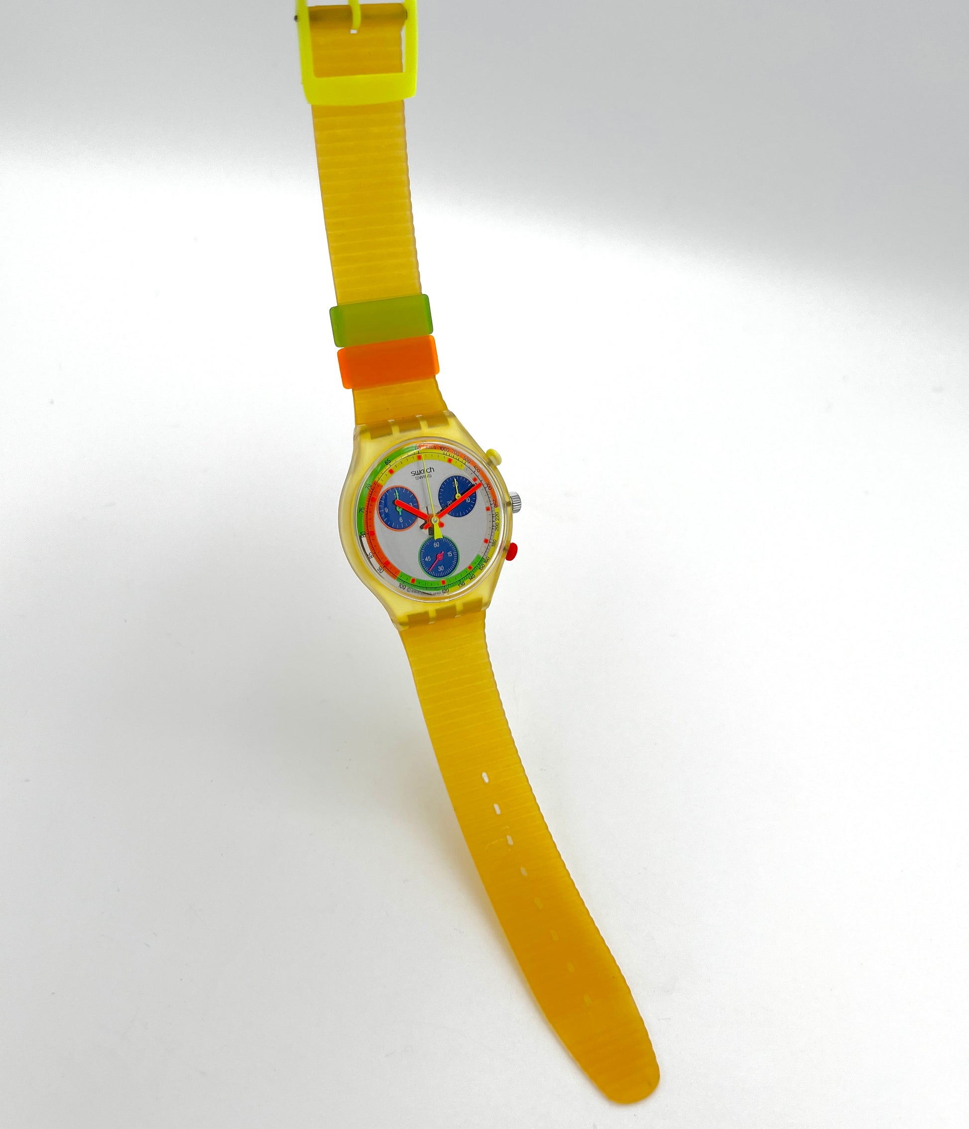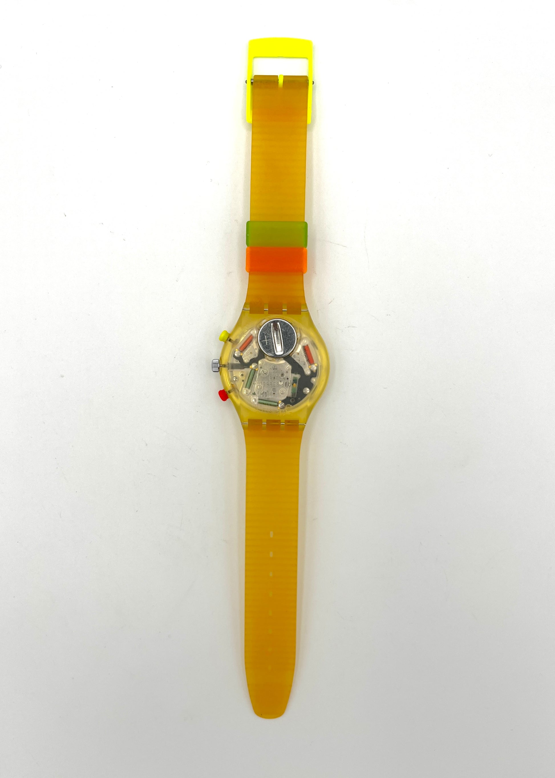 Rare Chrono from the '90s – The very rare Swatch Chrono JELLY STAG comes from Swatch's first Chrono series, which was sold in the 1990s. The plastic strap features a line pattern. Fresh neon colors characterize the design of this model.