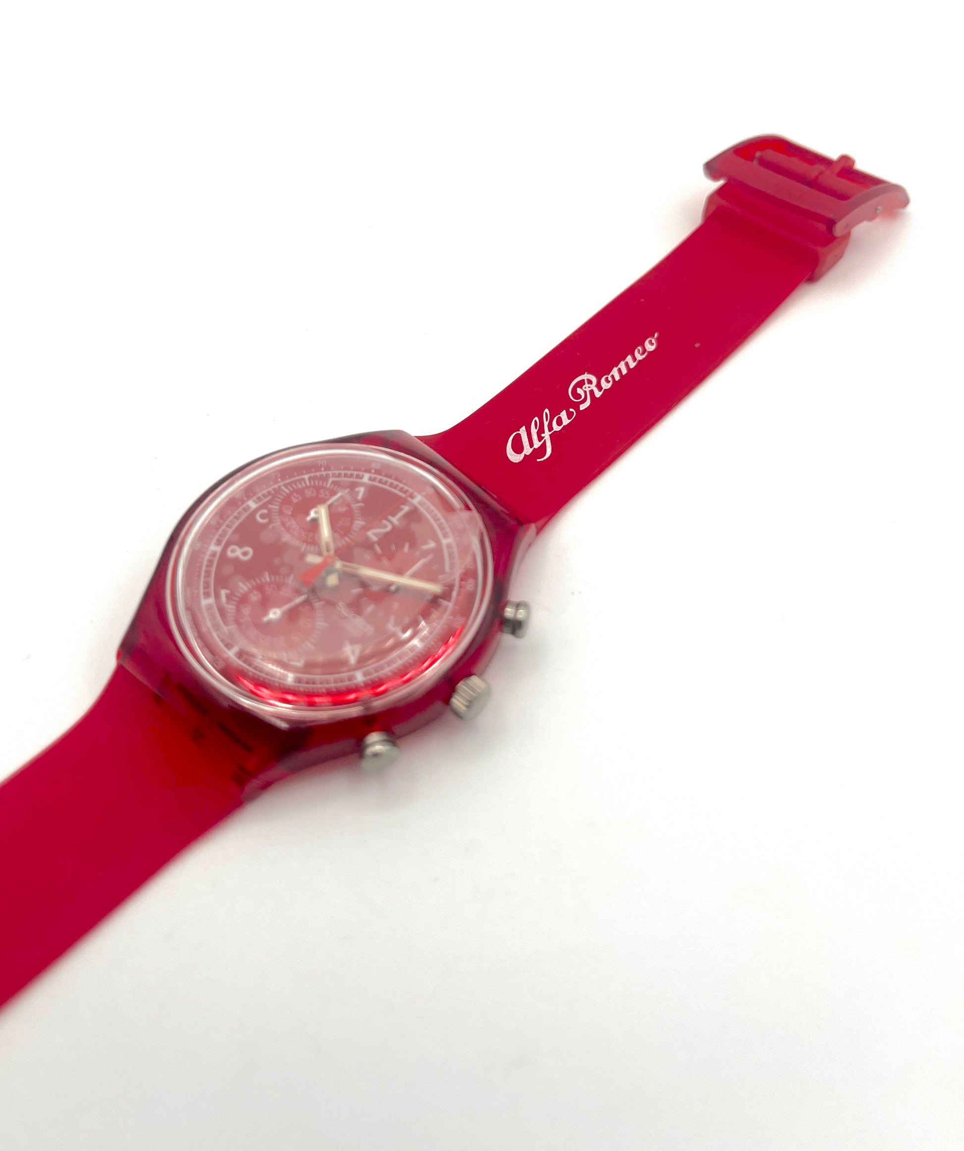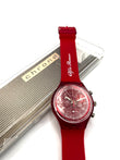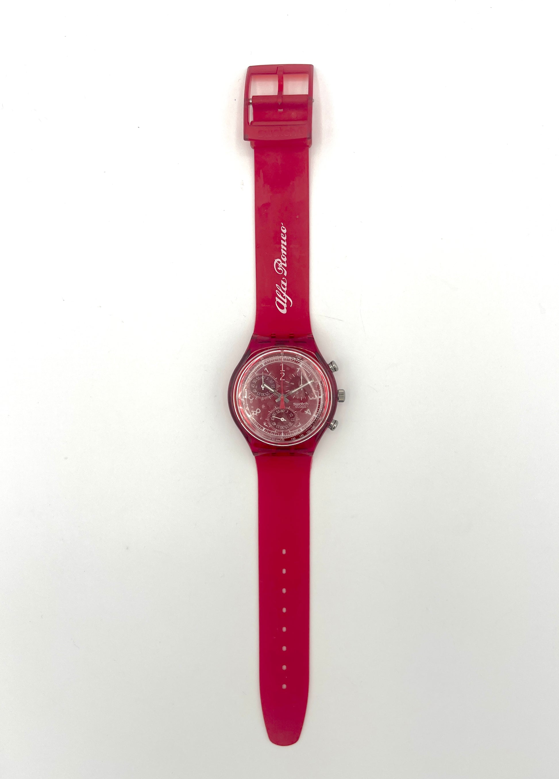 Rare Chrono from the '90s – The very rare Swatch Chrono LE ROUGE comes from Swatch's first Chrono series, which has been on sale since the 1990s. It is one of the very few Chronos that is completely red. The strap, watch case, and dial are all styled in this color. This SRC101C is even more special as it was produced as a promotional item for the Italian Car manufacturer ALFA ROMEO.