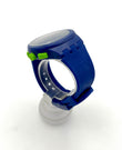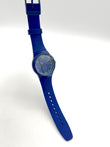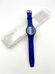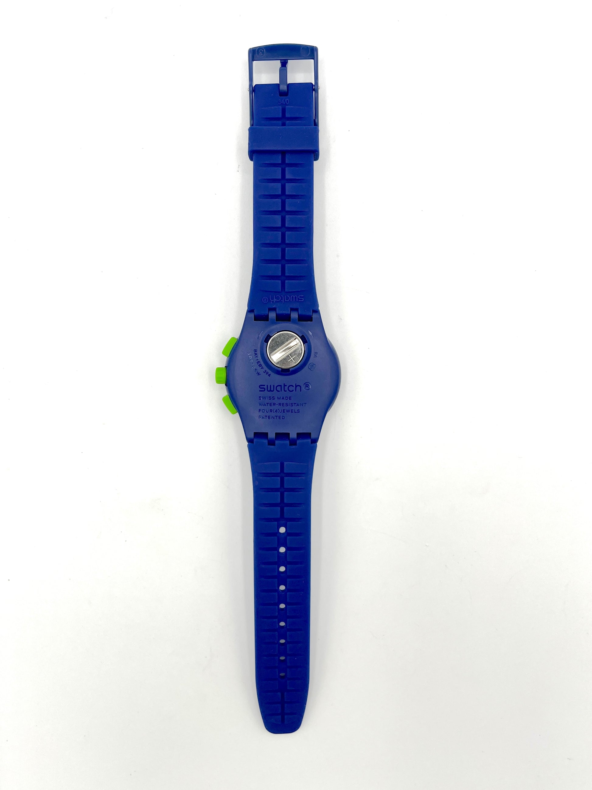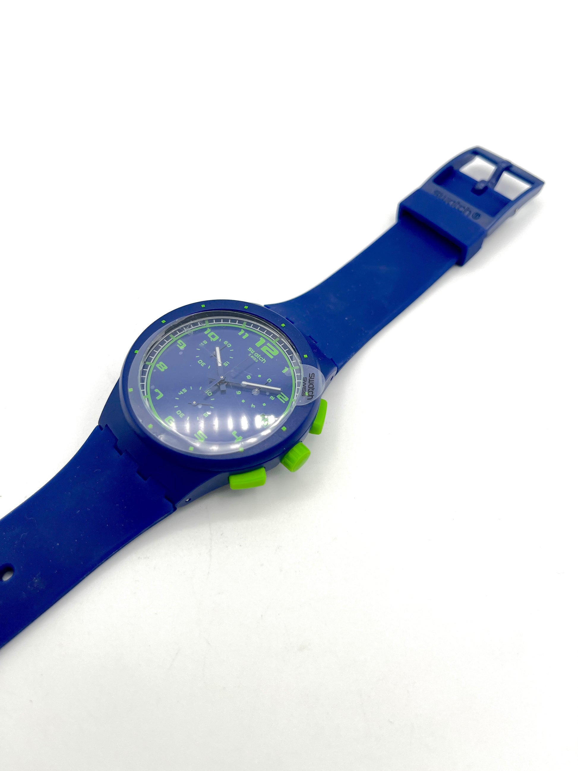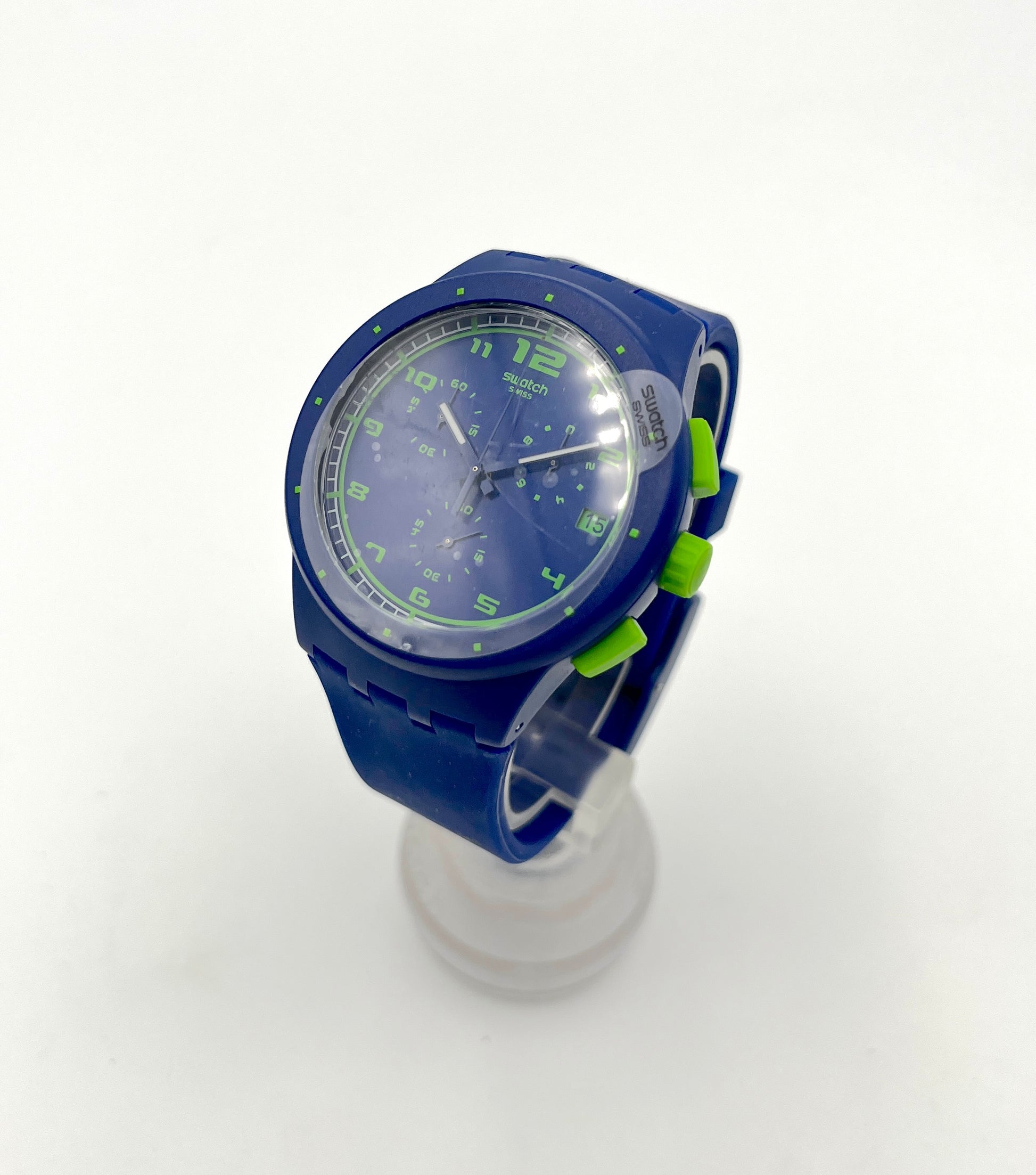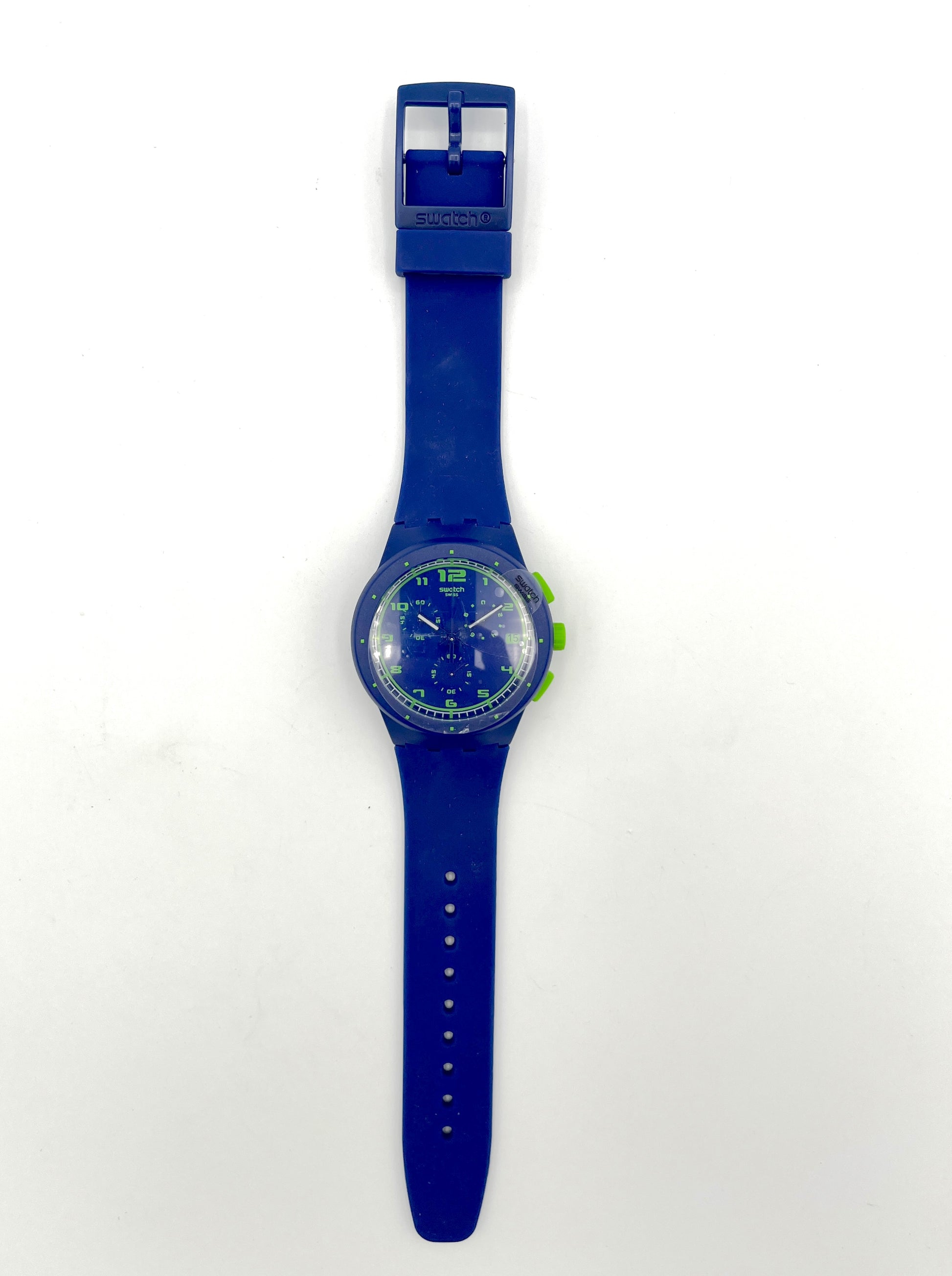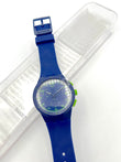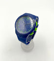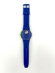 Blue Swatch watch with green accents on a white background