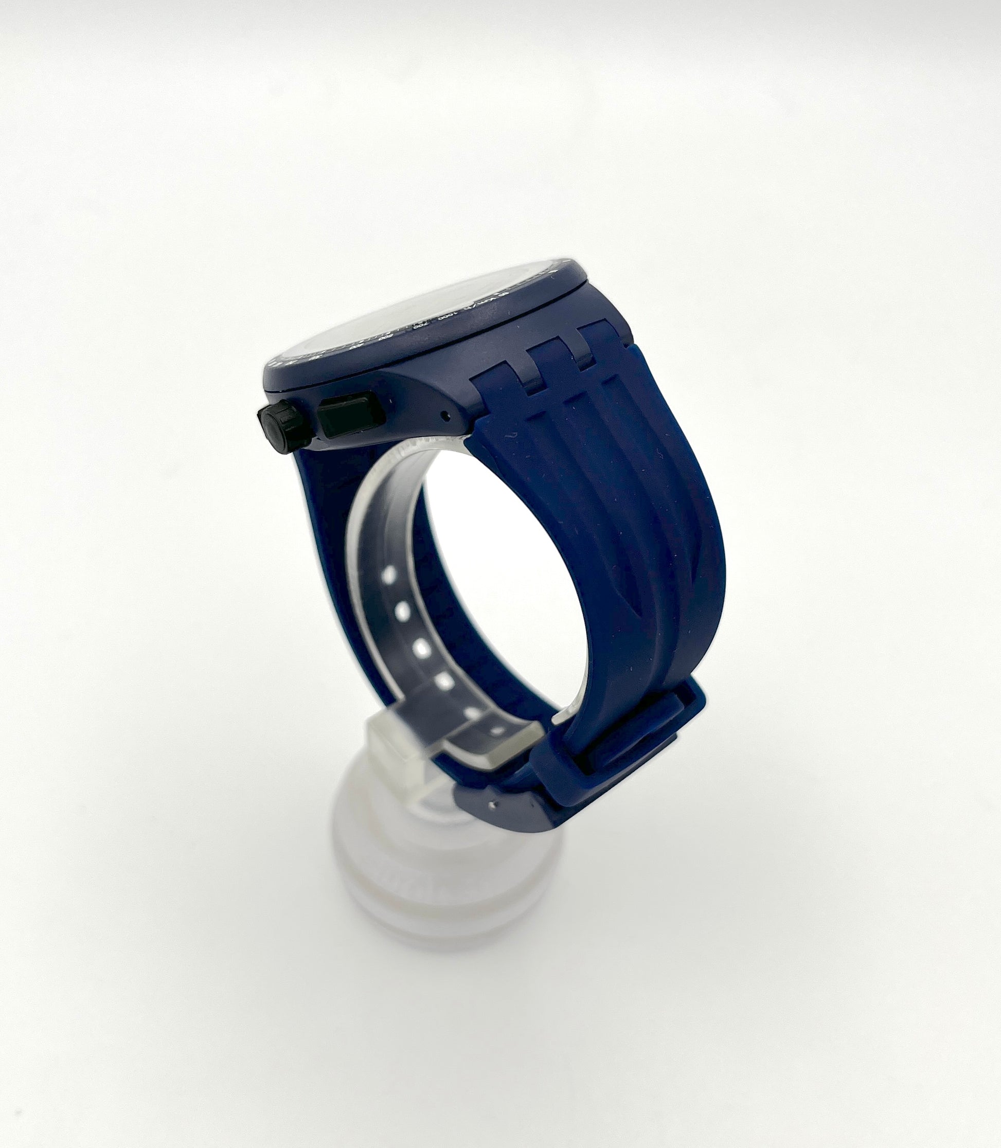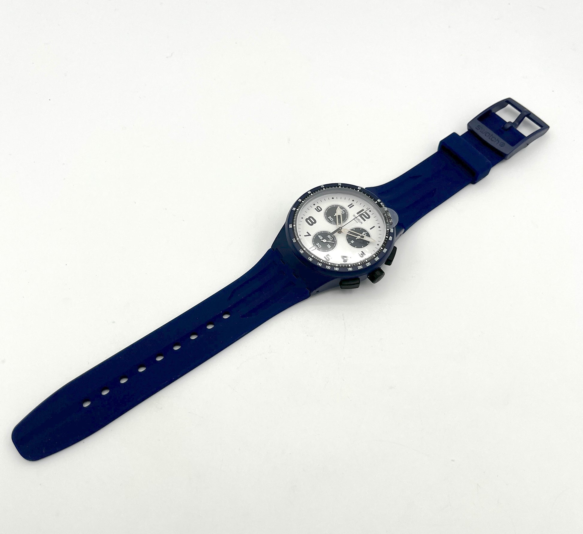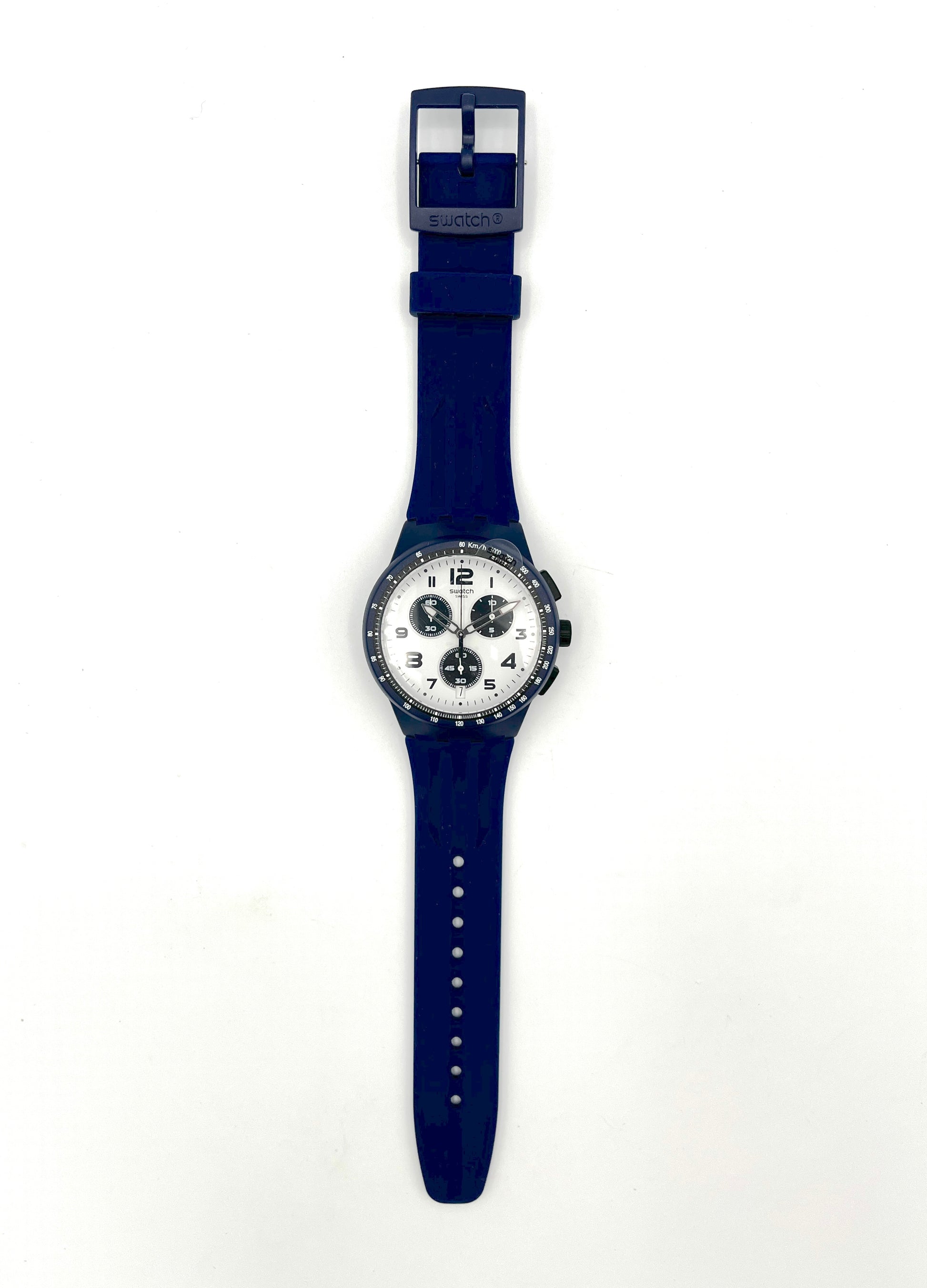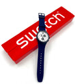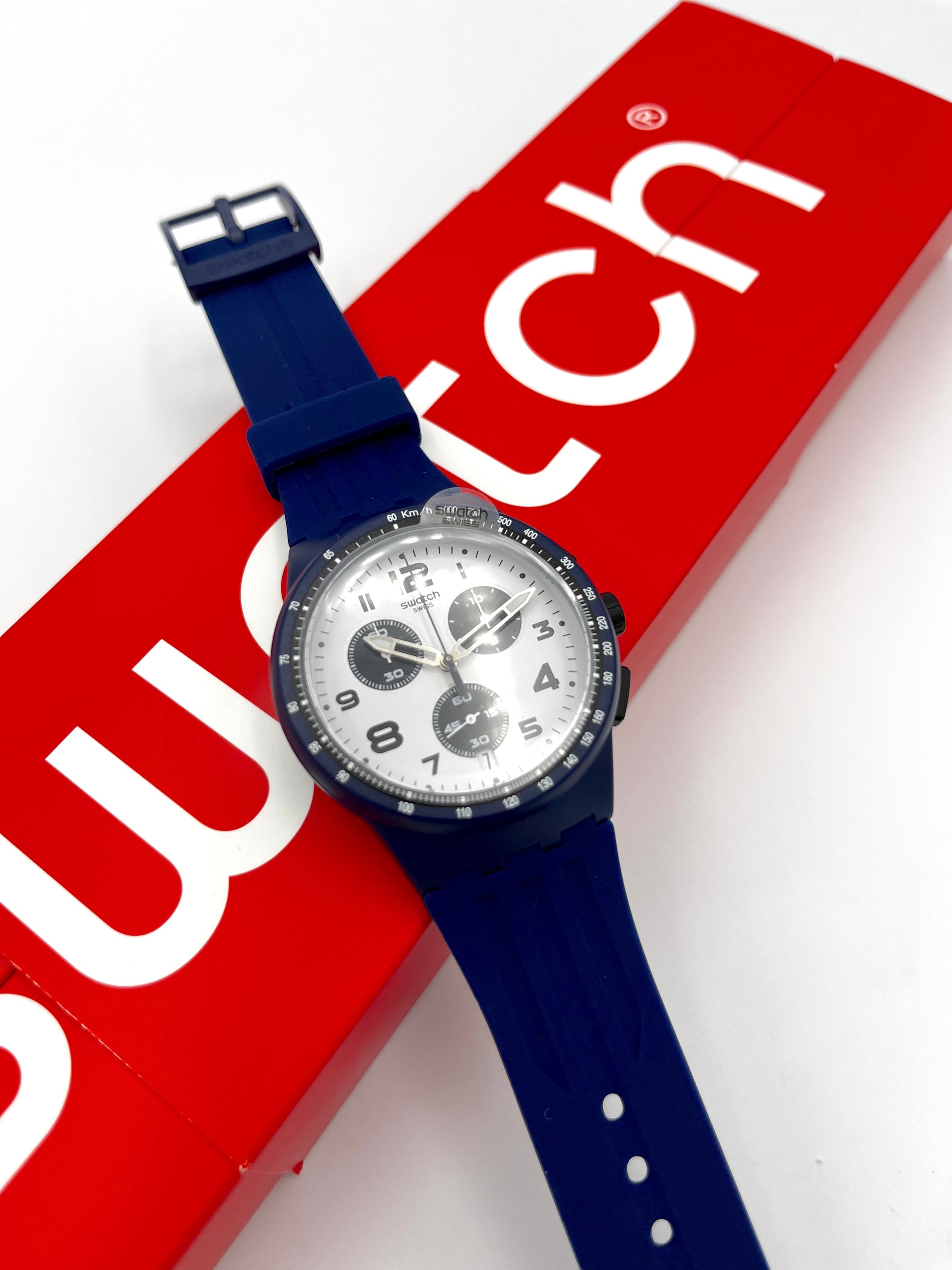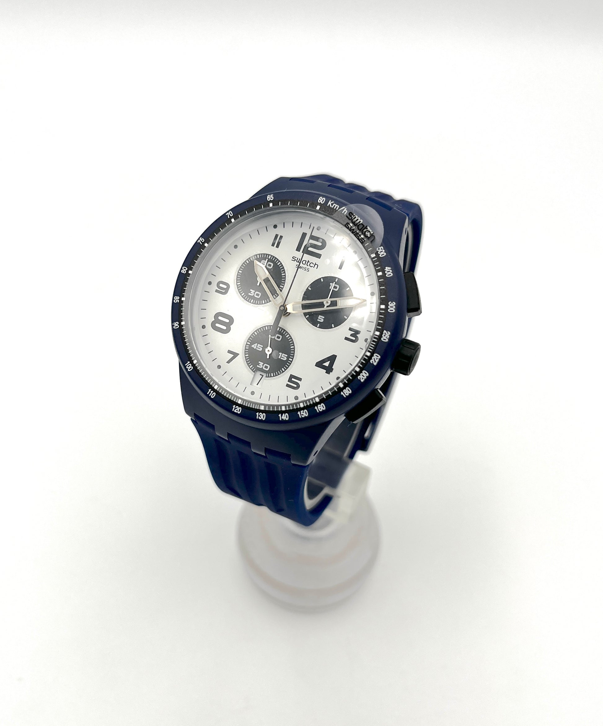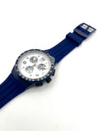 Sporty Design – The rare Swatch Plastic Chrono TRAVEL CHOC has a classic black and white dial. This is perfectly complemented by the blue tone of the plastic case and silicone strap. A tachymeter scale is printed on the bezel, which can be used to convert distances into speeds traveled. The outer ring of the dial is very finely scaled, making it easy to time to the second. This sought-after classic dates from 2015.