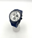 Wristwatch with a blue strap and white dial on a white background