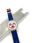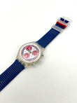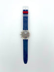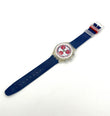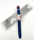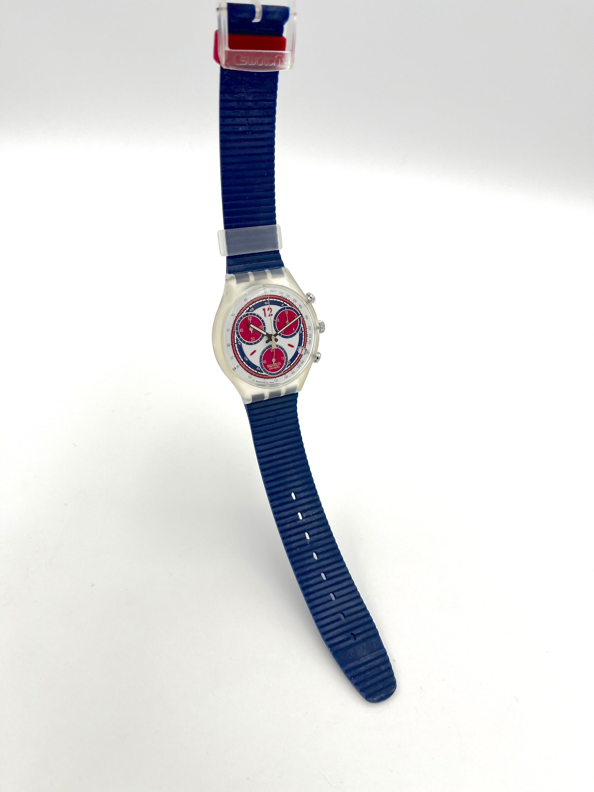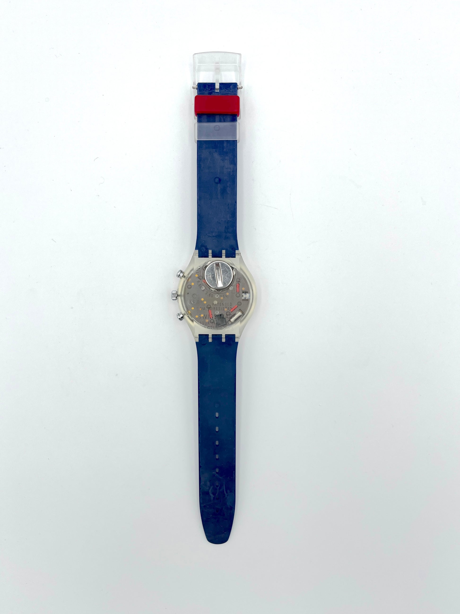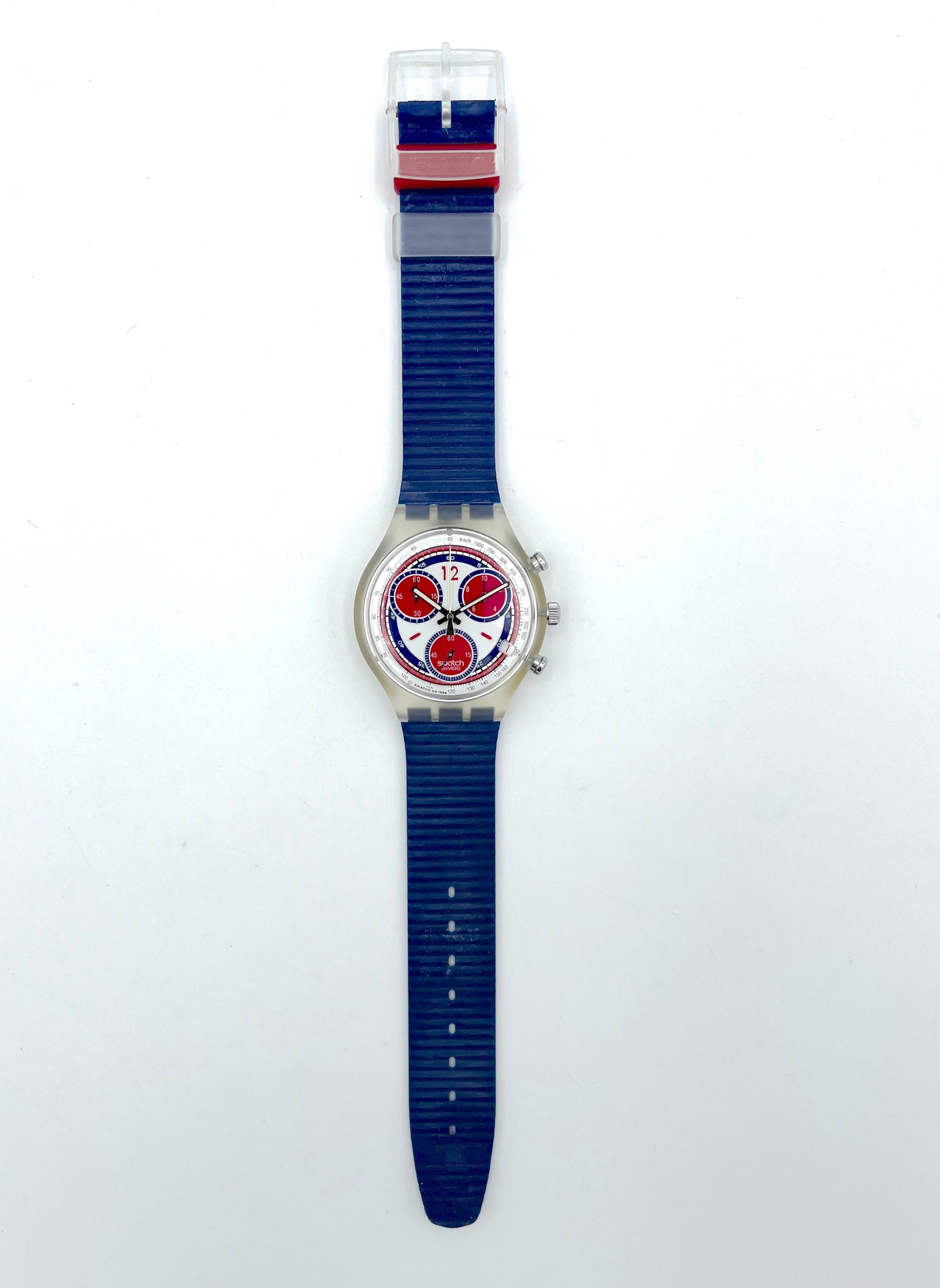 Rare Chrono from the '90s – The white dial with red subdials and blue accents has a distinctly maritime look. The grooved plastic strap with buckle clasp is also blue. The watch has a stopwatch function, is water-resistant, and has an accurate, battery-powered quartz movement with battery. This rare classic dates back to 1995.