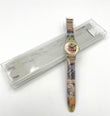 Watch with a colorful strap featuring a map design and a castle illustration on the dial.