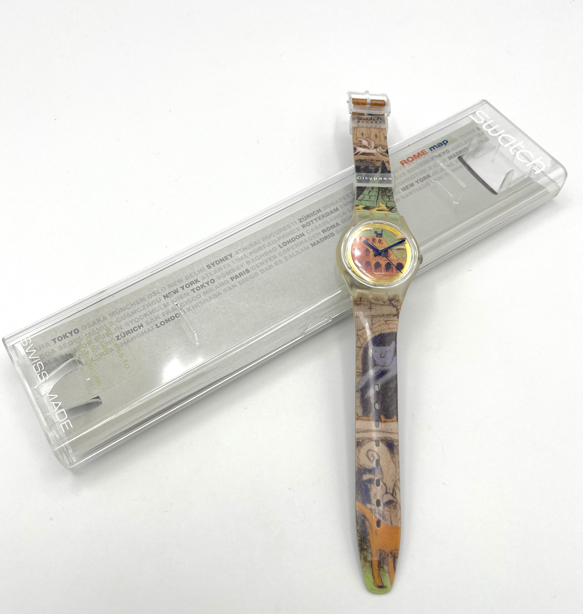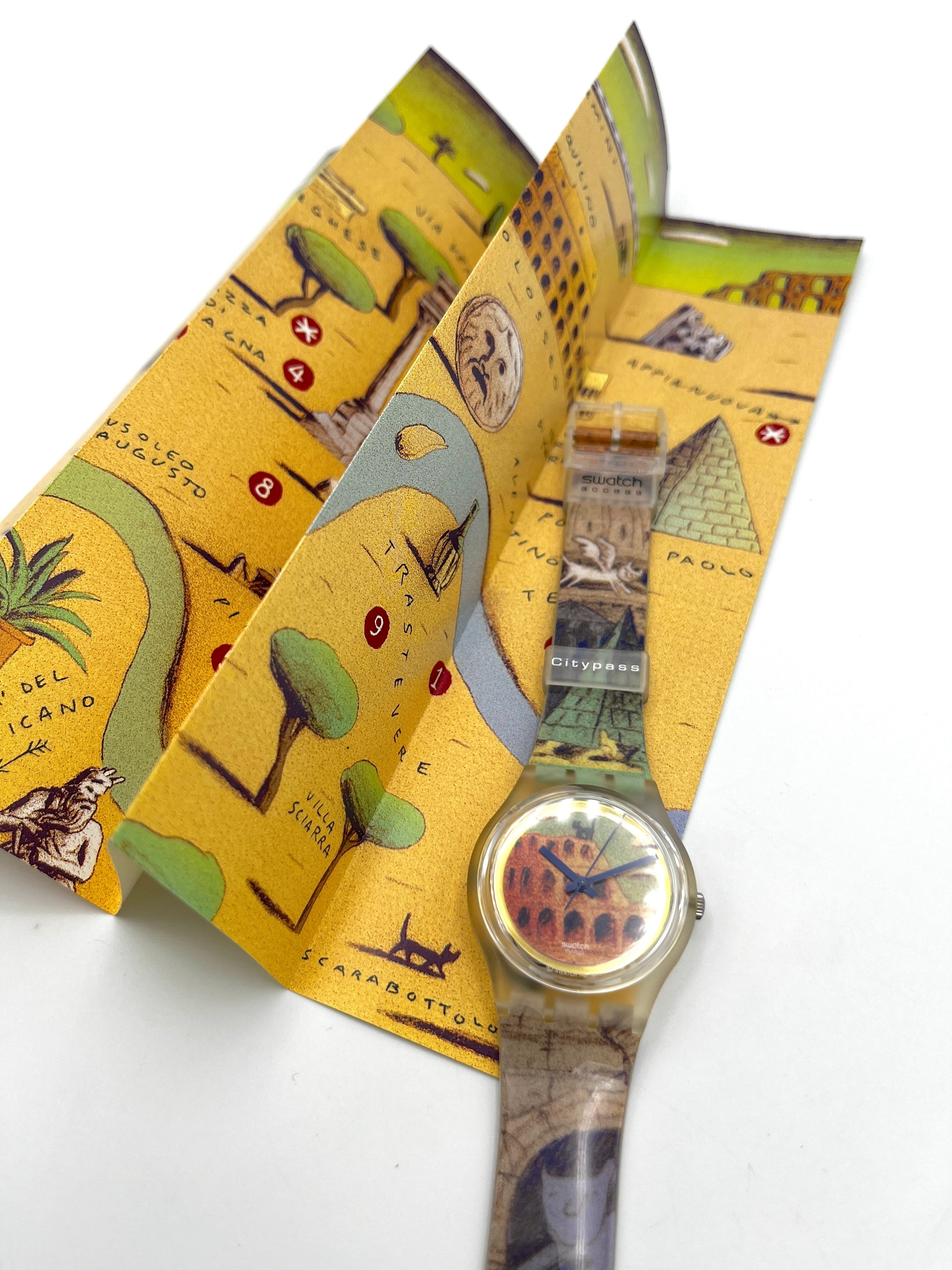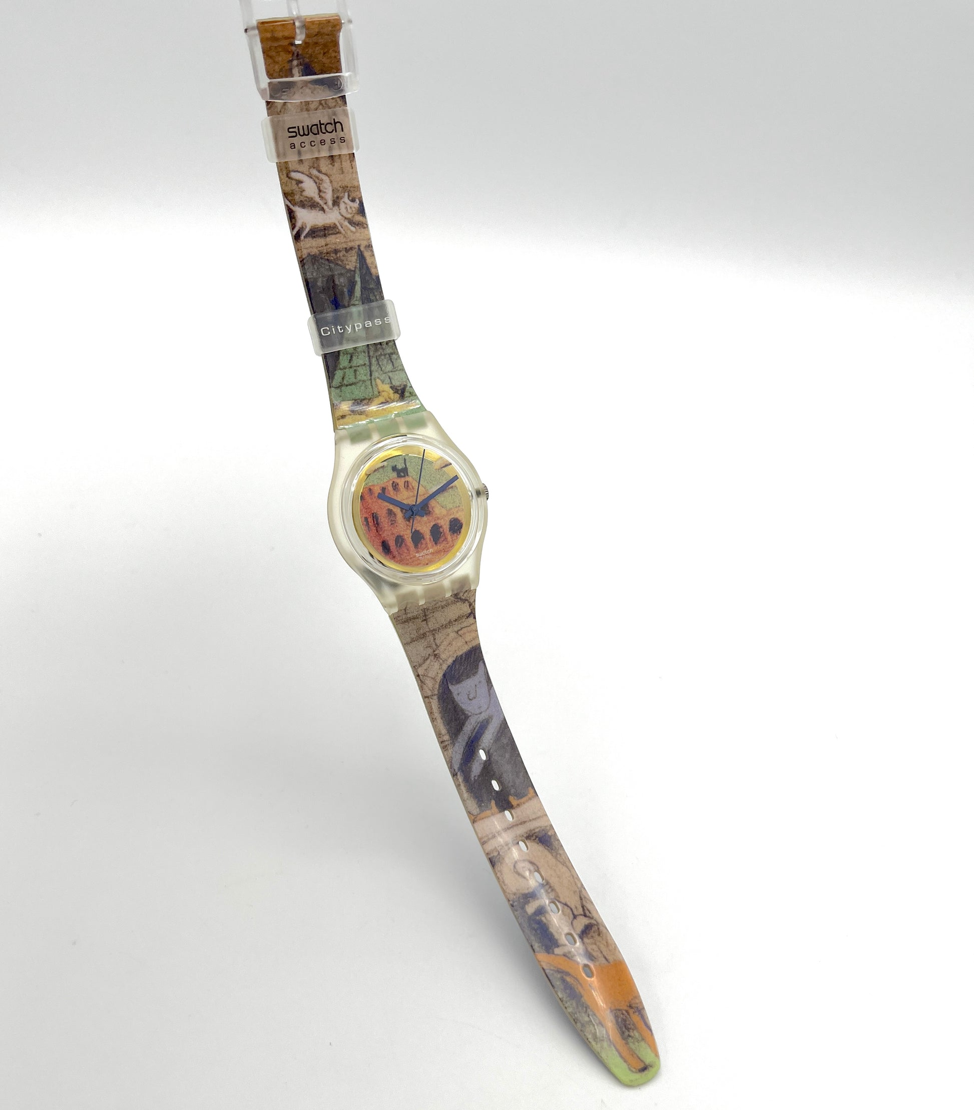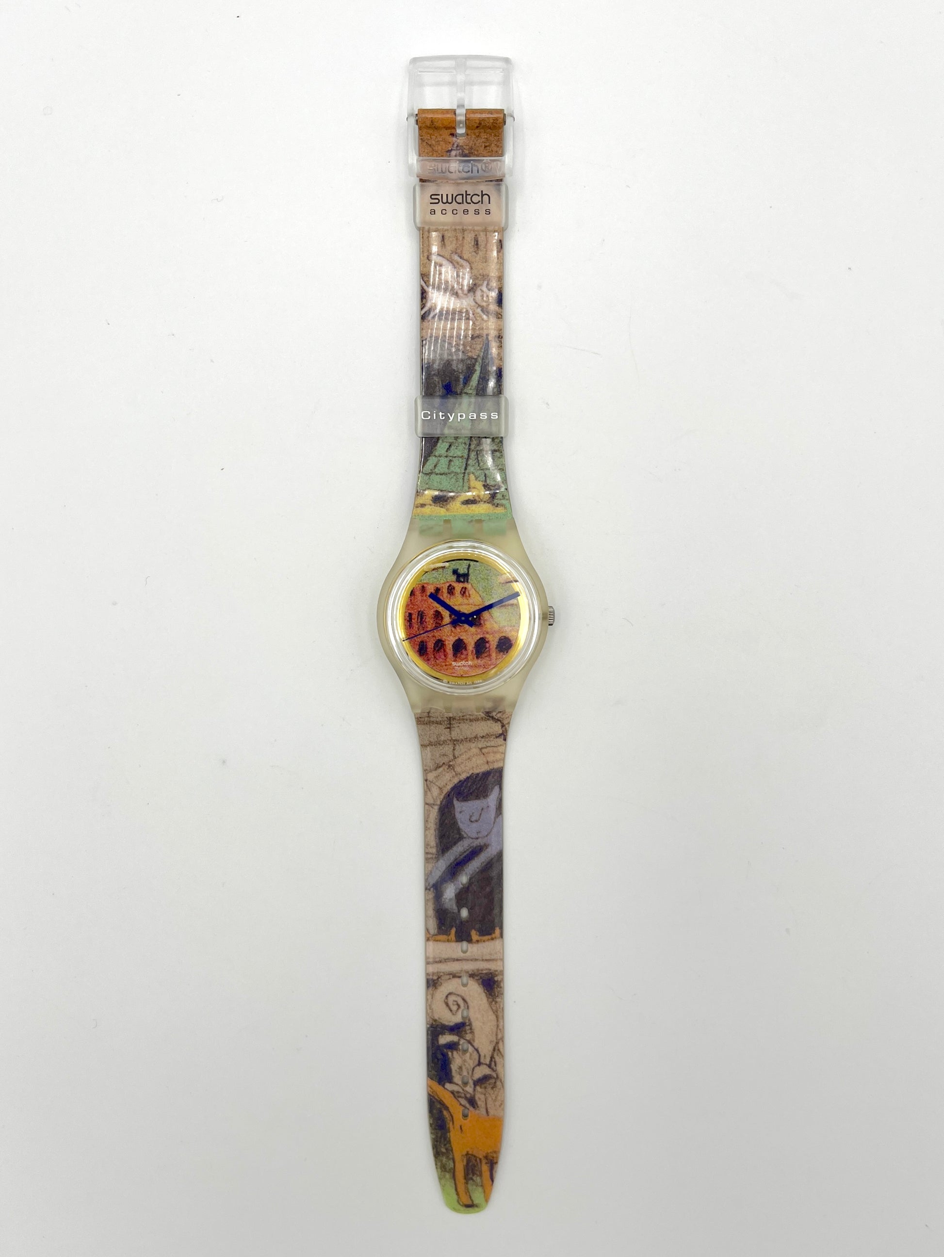 Perfect for Italian CollectorsThe Swatch Gent Access PONENTINO was released as City Access Swatch for the city in Rome in 1998. The model was to be charged as city pass for various sights in Rome. On the dial and strap several highlights such as the Colosseum are depicted