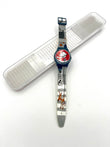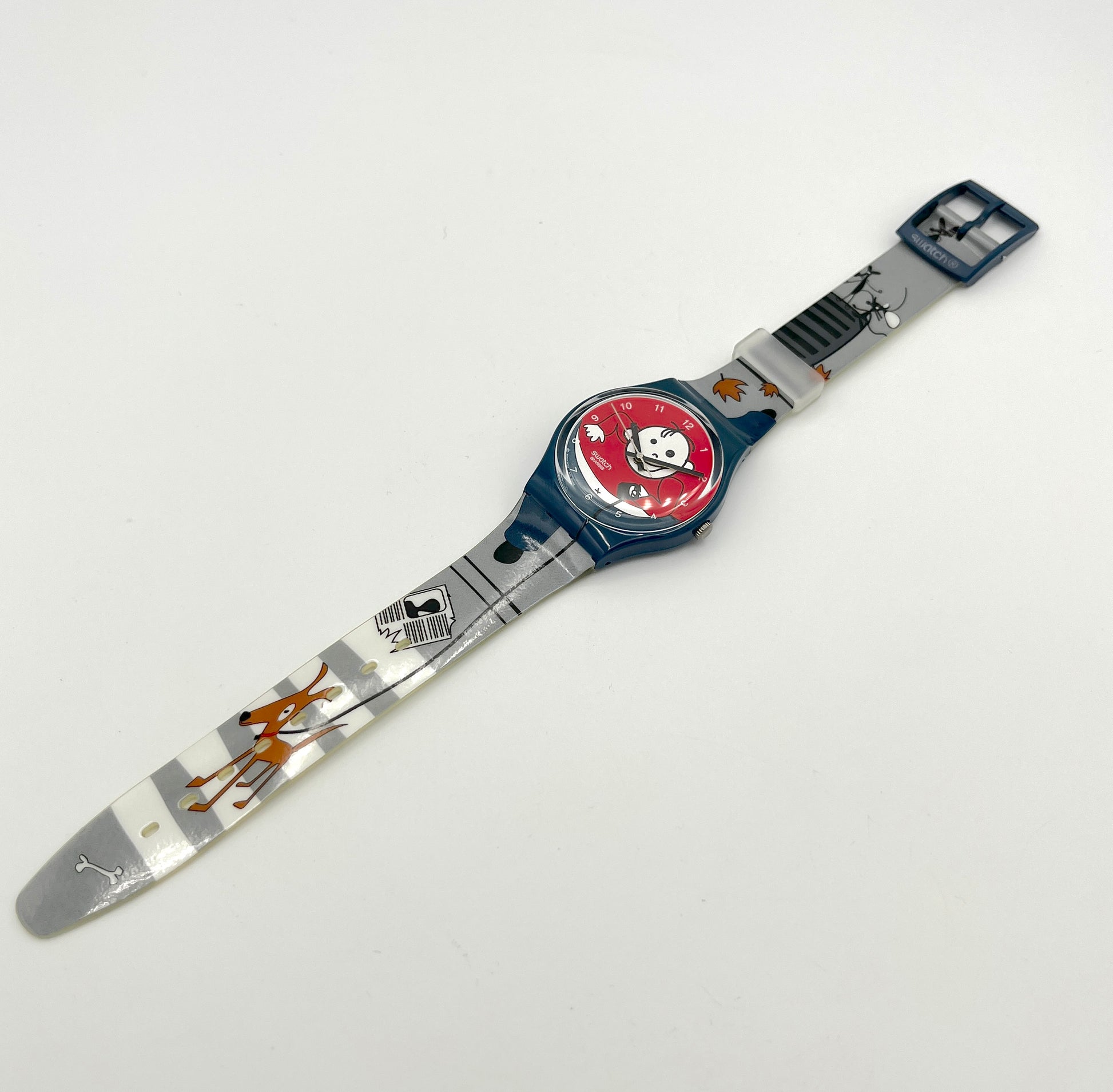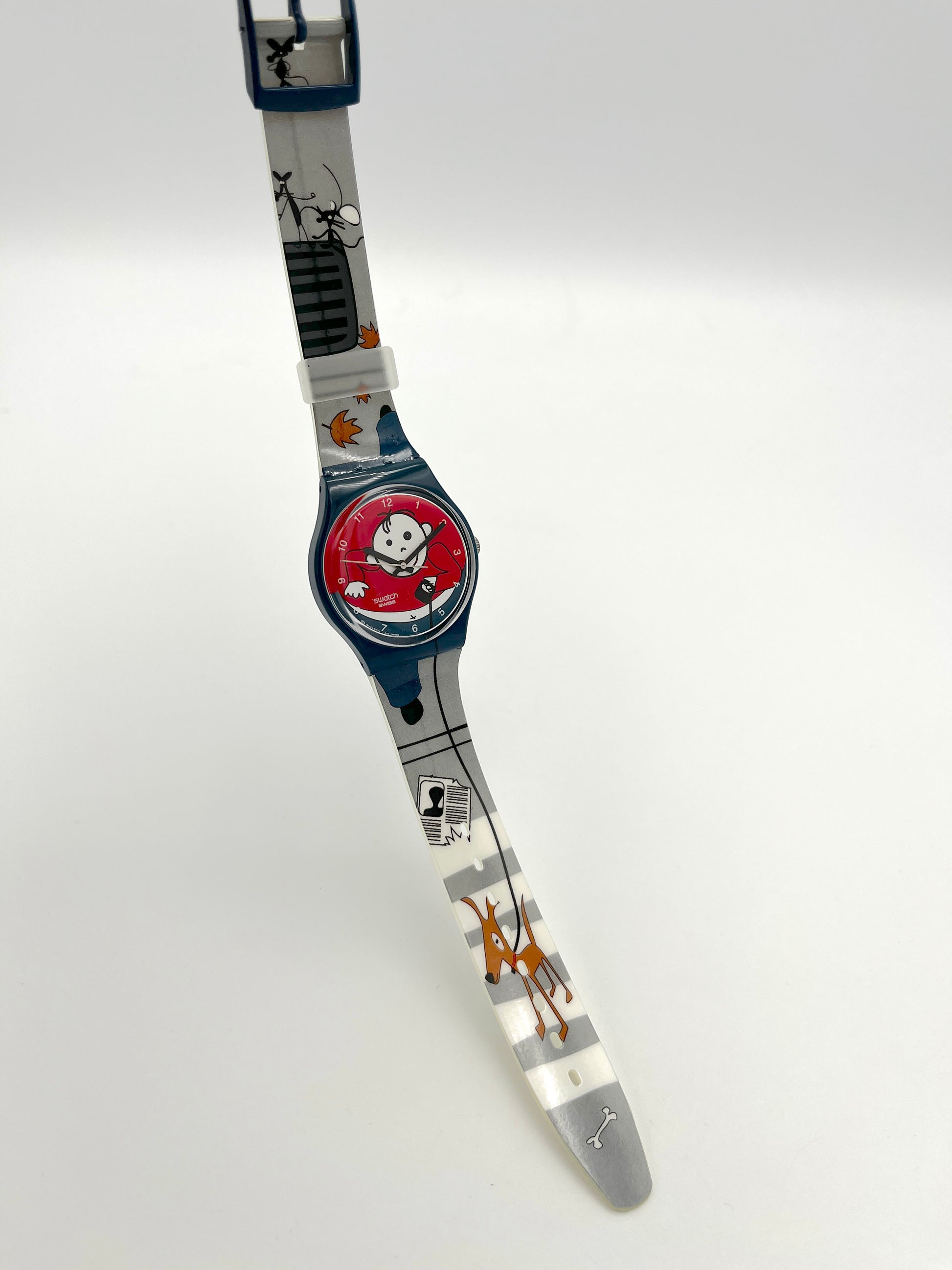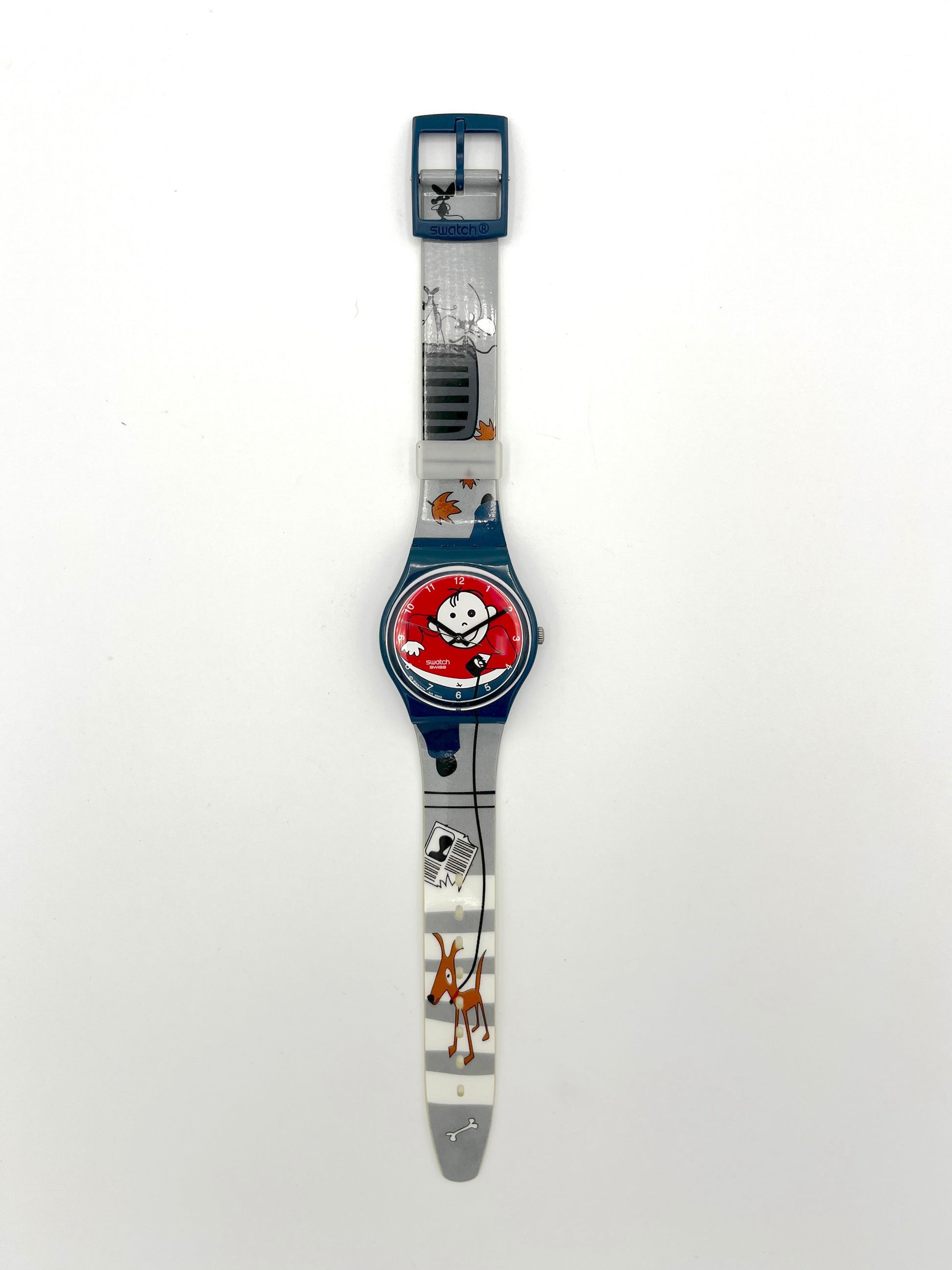 Rare Model – The rare, playful Swatch Gent AVOIR DU CHIEN from the model year 2006 features a man on the dial walking his dog on a leash. The dog is standing on a zebra crossing on the plastic strap. Mice and flying leaves can also be seen on the strap. The case of this Gent is dark blue, as is the sturdy plastic clasp.