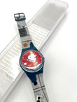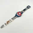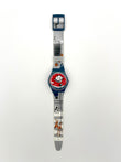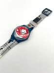 Cartoon-themed watch with a red face and blue strap on a white background