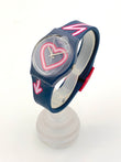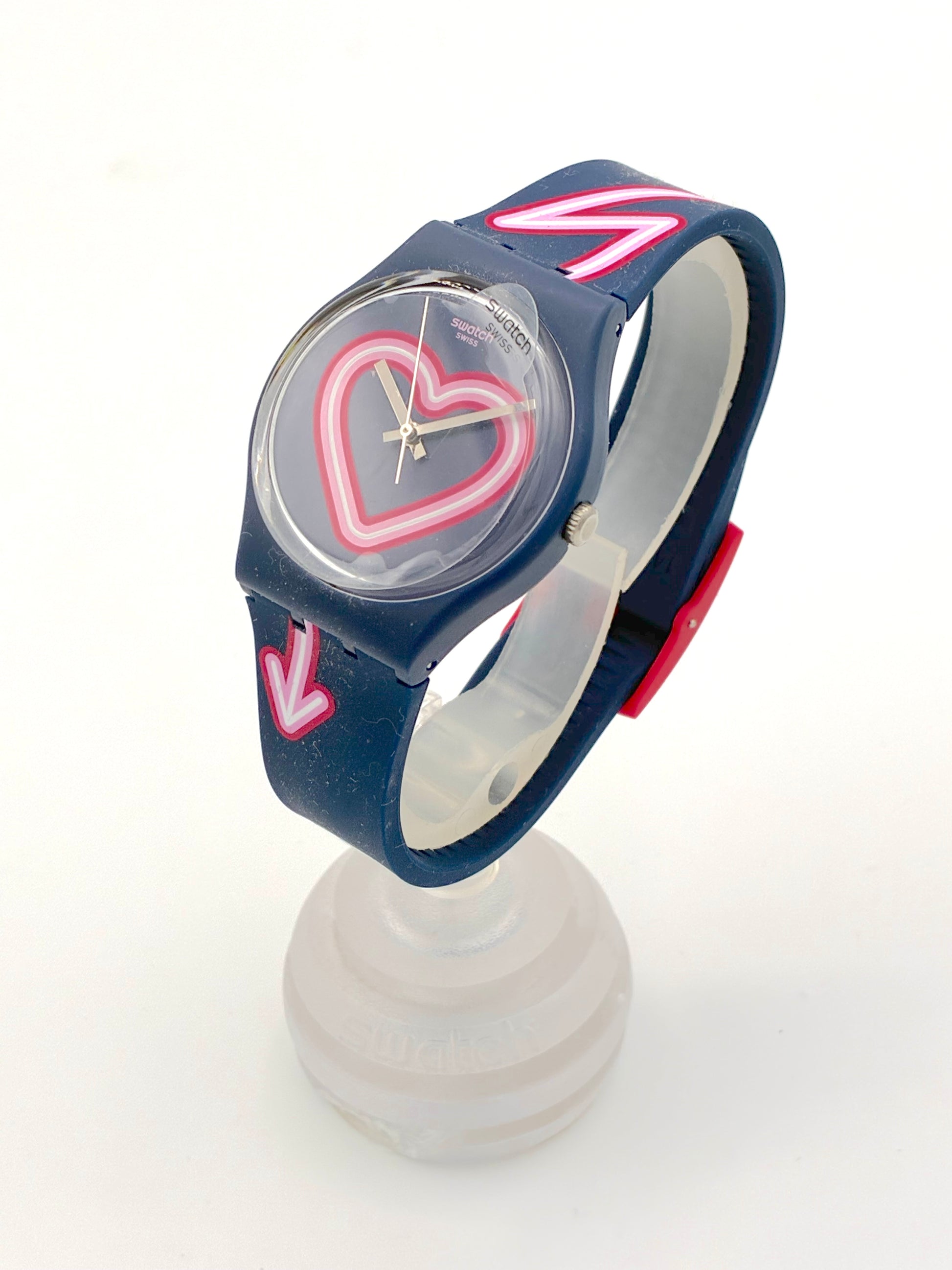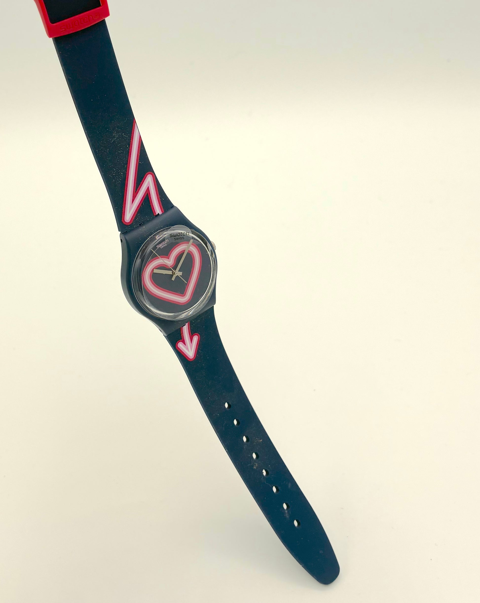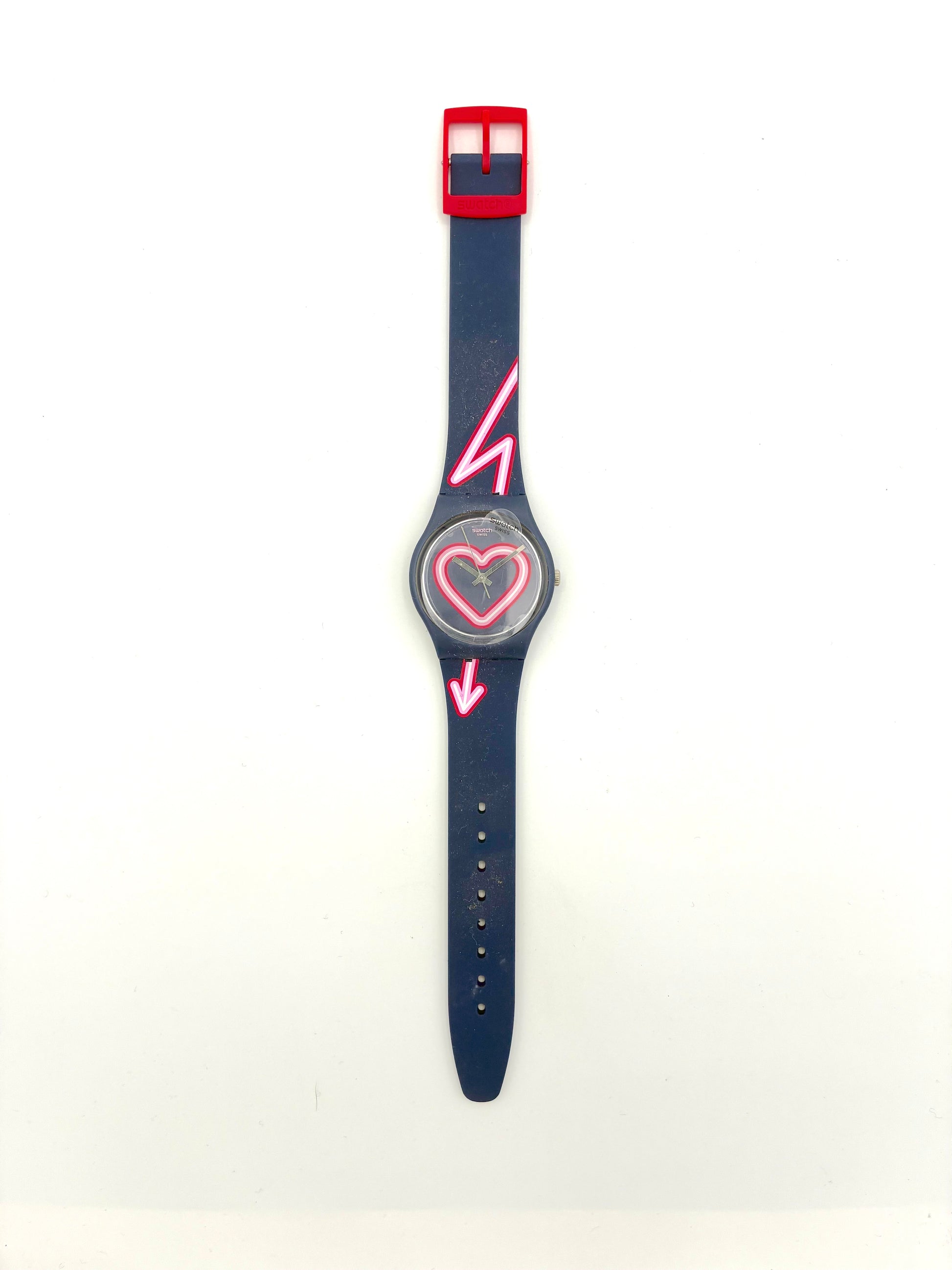 The Perfect For Lovers  – For Valentine's Day on February 14, Swatch created the Power of Love collection featuring the Gent FLASH OF LOVE. Like a neon sign, a neon pink heart with lightning bolts adorns the dark blue watch. The case and buckle are made of plastic, with a silicone strap attached. Please be informed that the small red horizontal loop on the strap is missing.