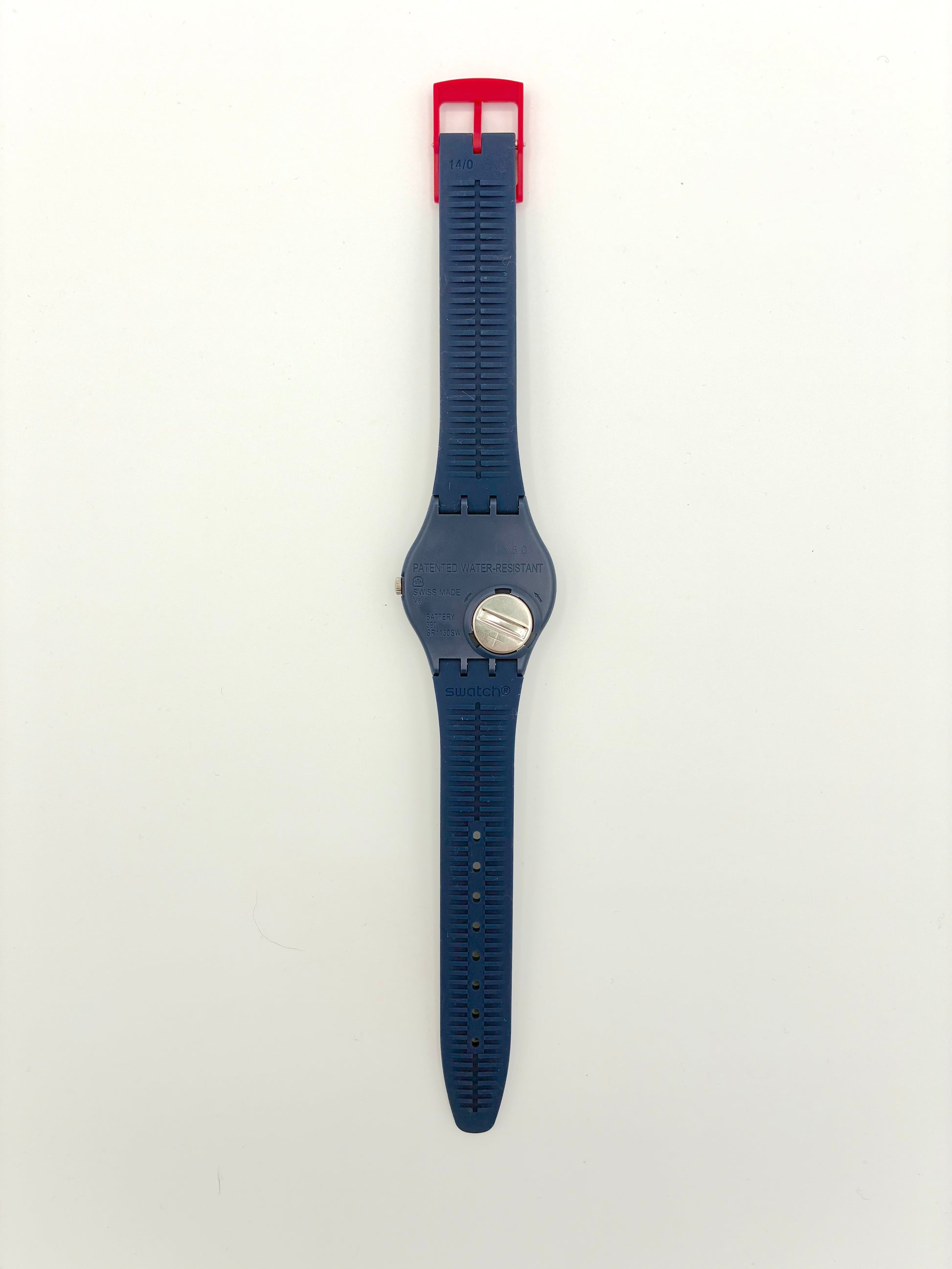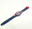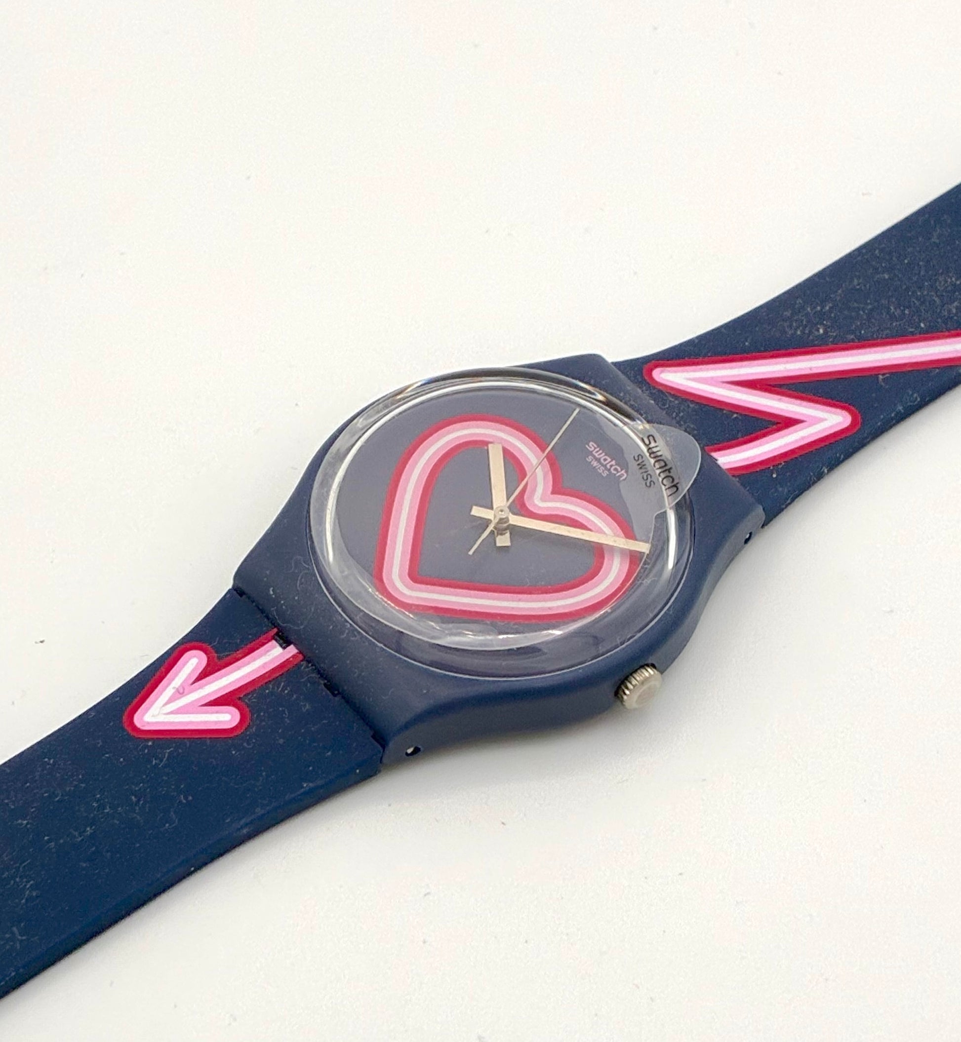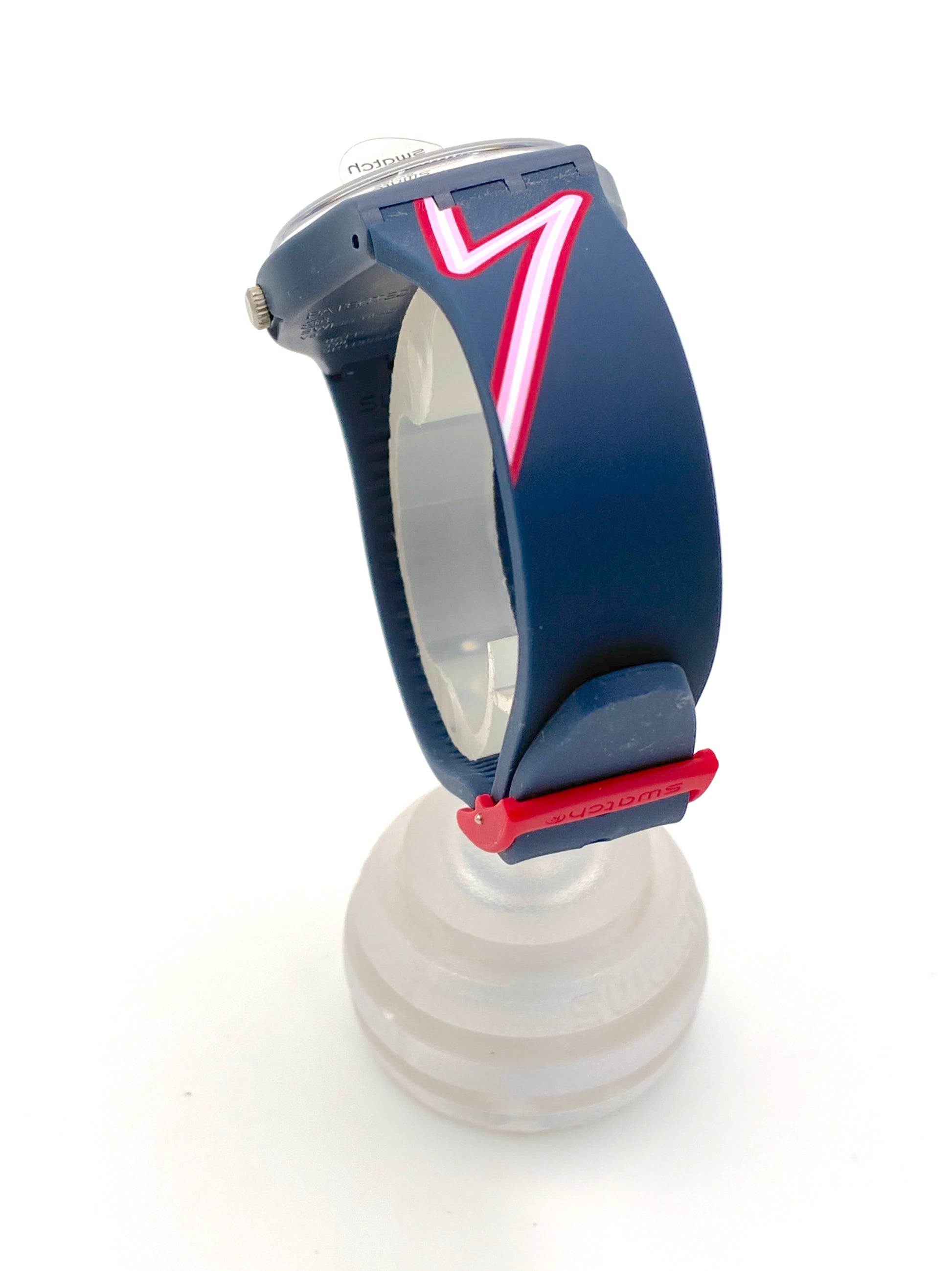 The Perfect For Lovers  – For Valentine's Day on February 14, Swatch created the Power of Love collection featuring the Gent FLASH OF LOVE. Like a neon sign, a neon pink heart with lightning bolts adorns the dark blue watch. The case and buckle are made of plastic, with a silicone strap attached. Please be informed that the small red horizontal loop on the strap is missing.