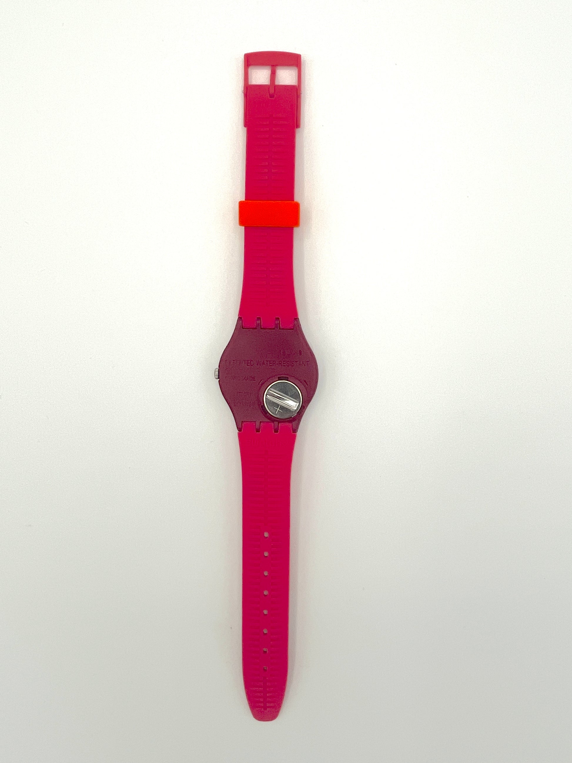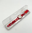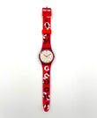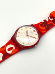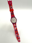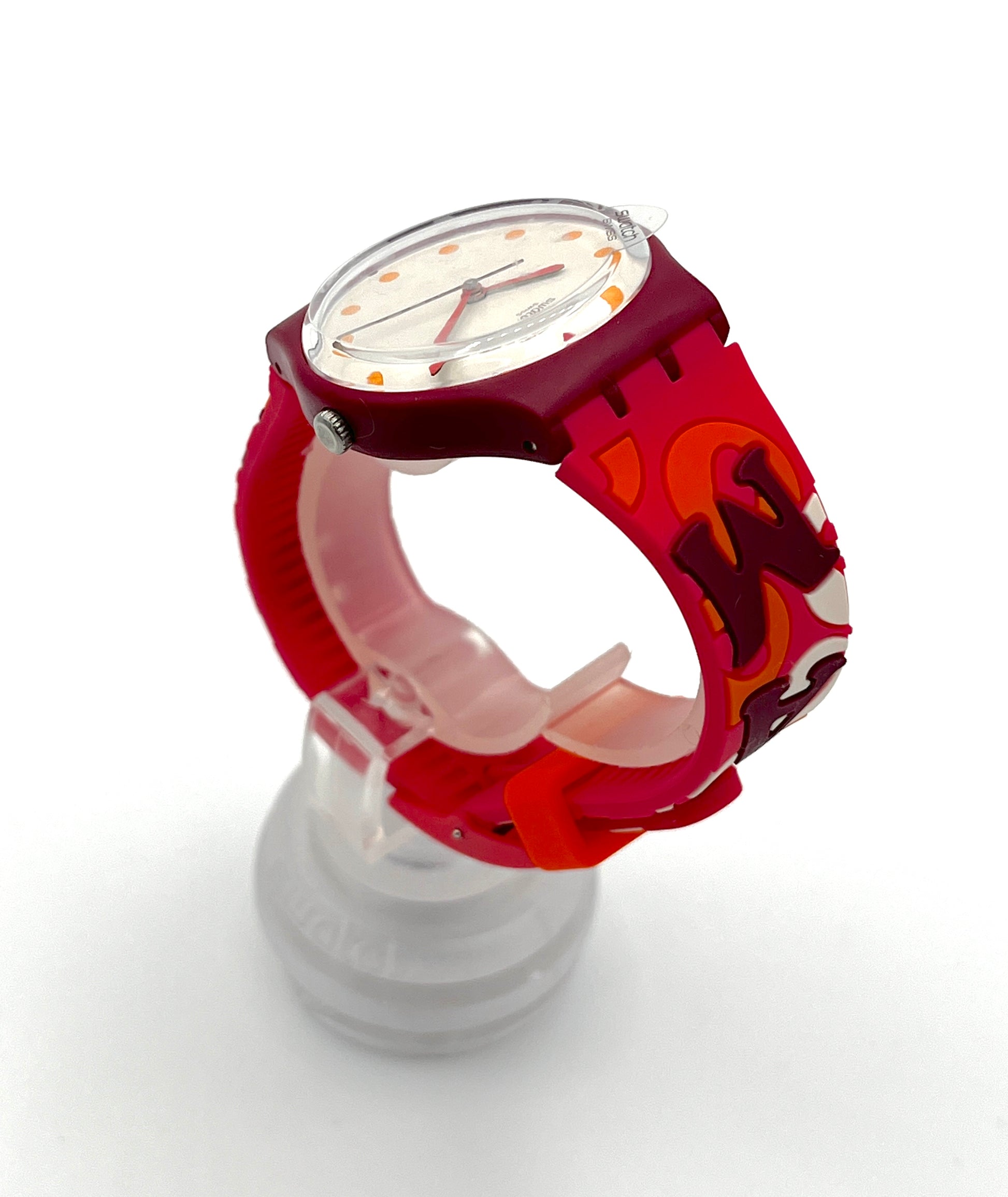 Red Swatch watch with white face and orange dots on a white background