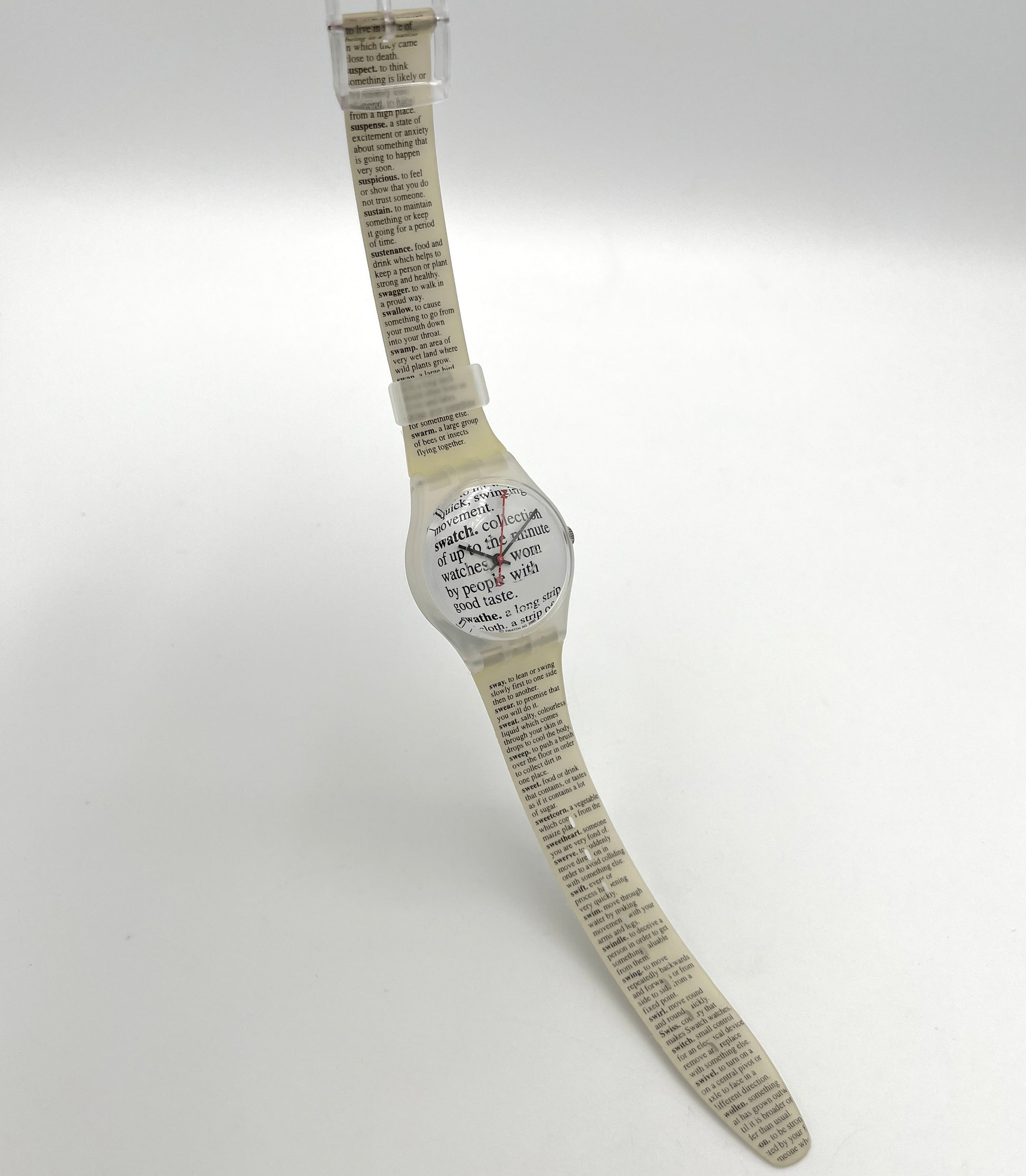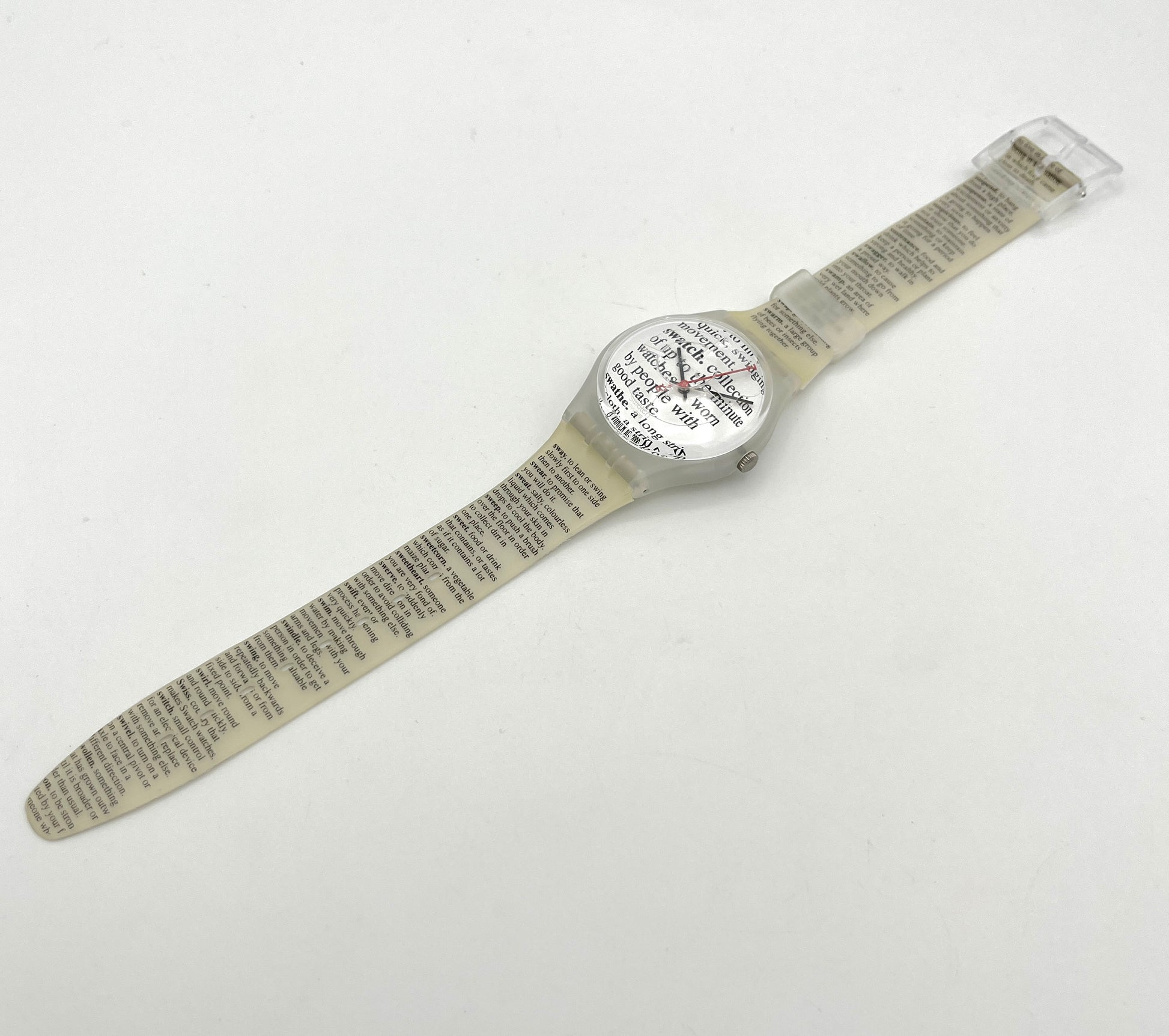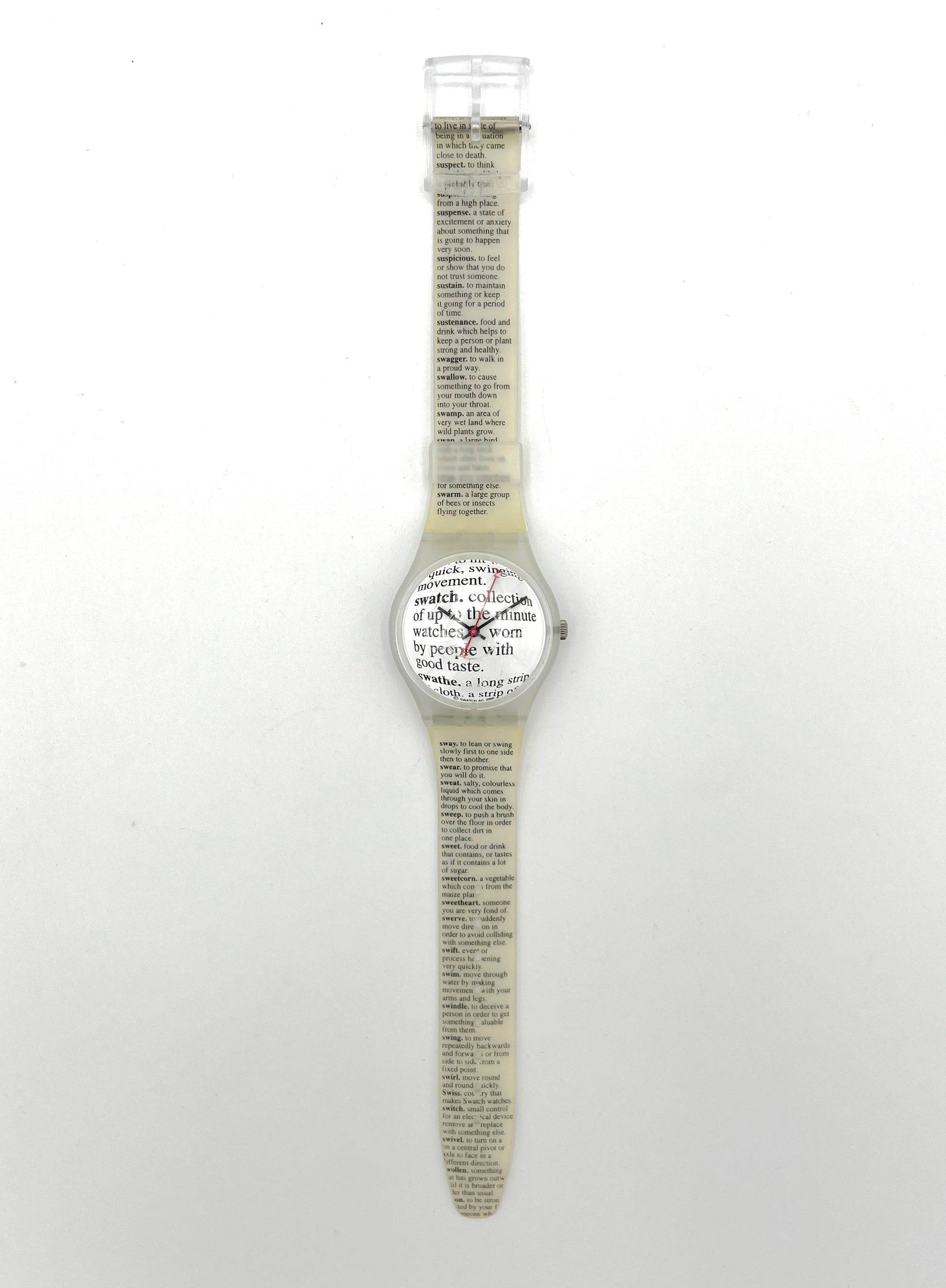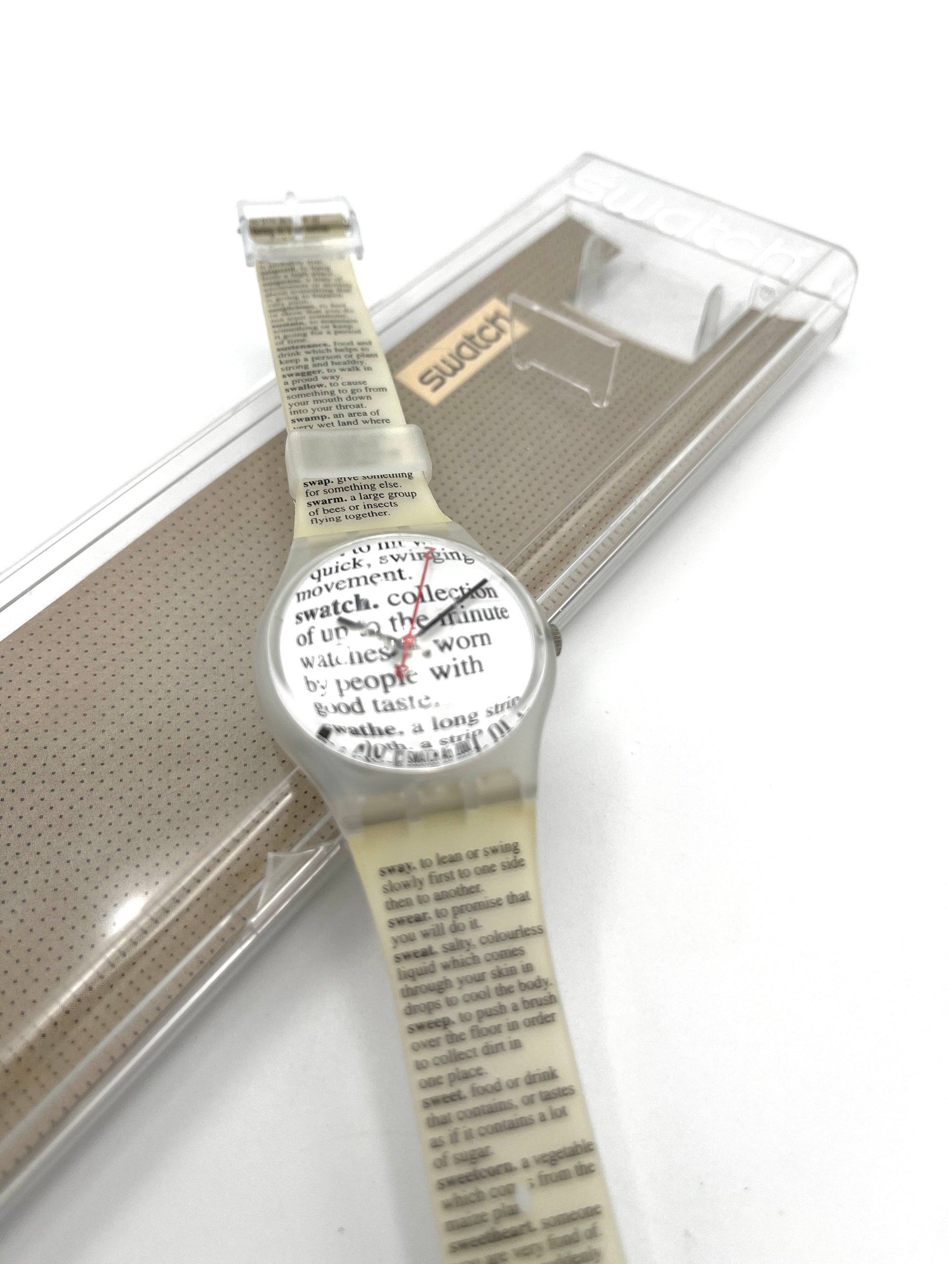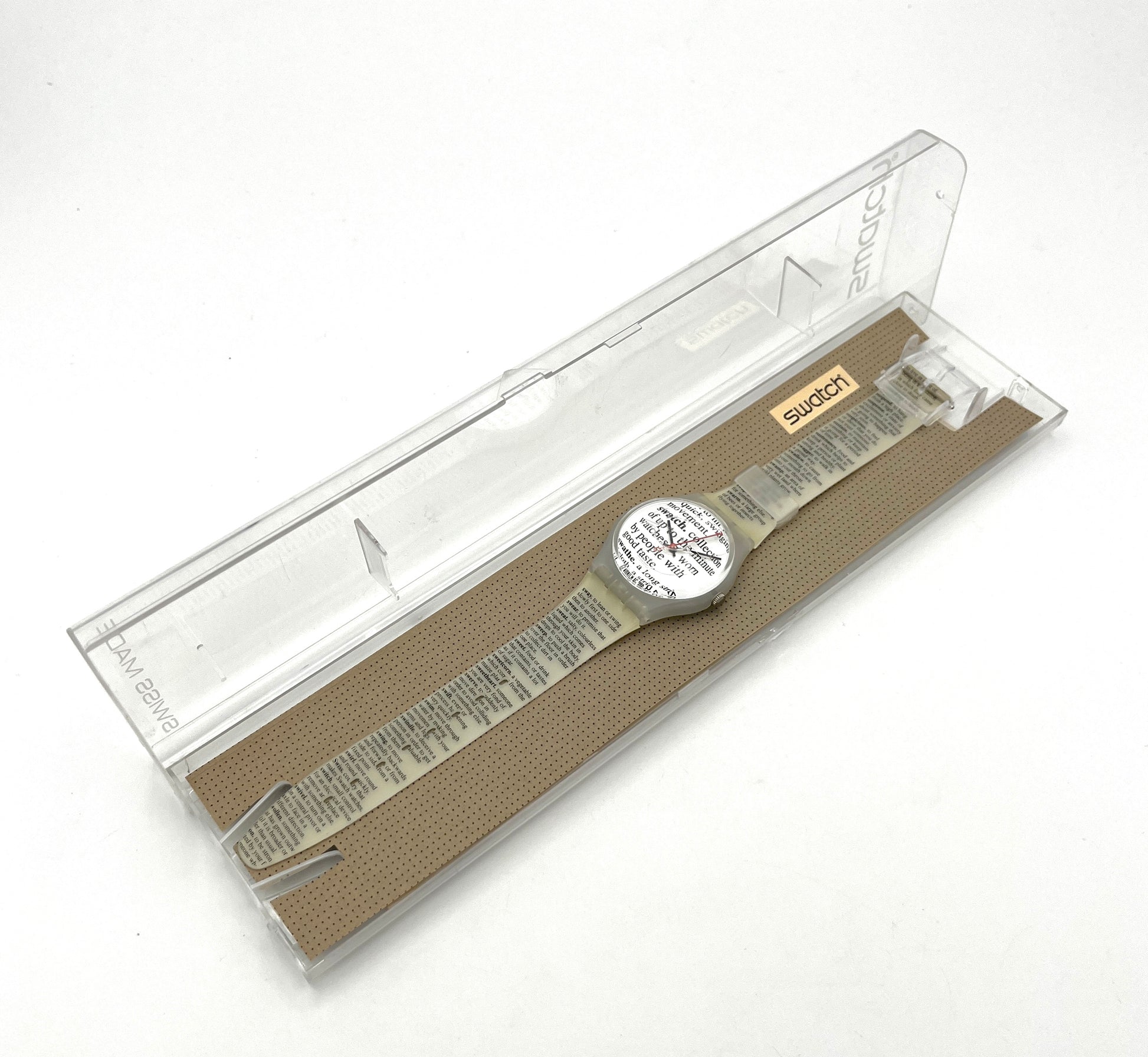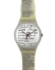 Rare 2001 Model – The very rare Swatch Gent PAGE 1983 looks like an encyclopedia running across the wristband and dial. In the middle, there is an article about Swatch.