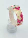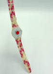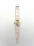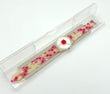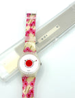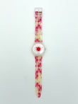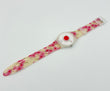 Watch with floral strap and red heart design on a white background