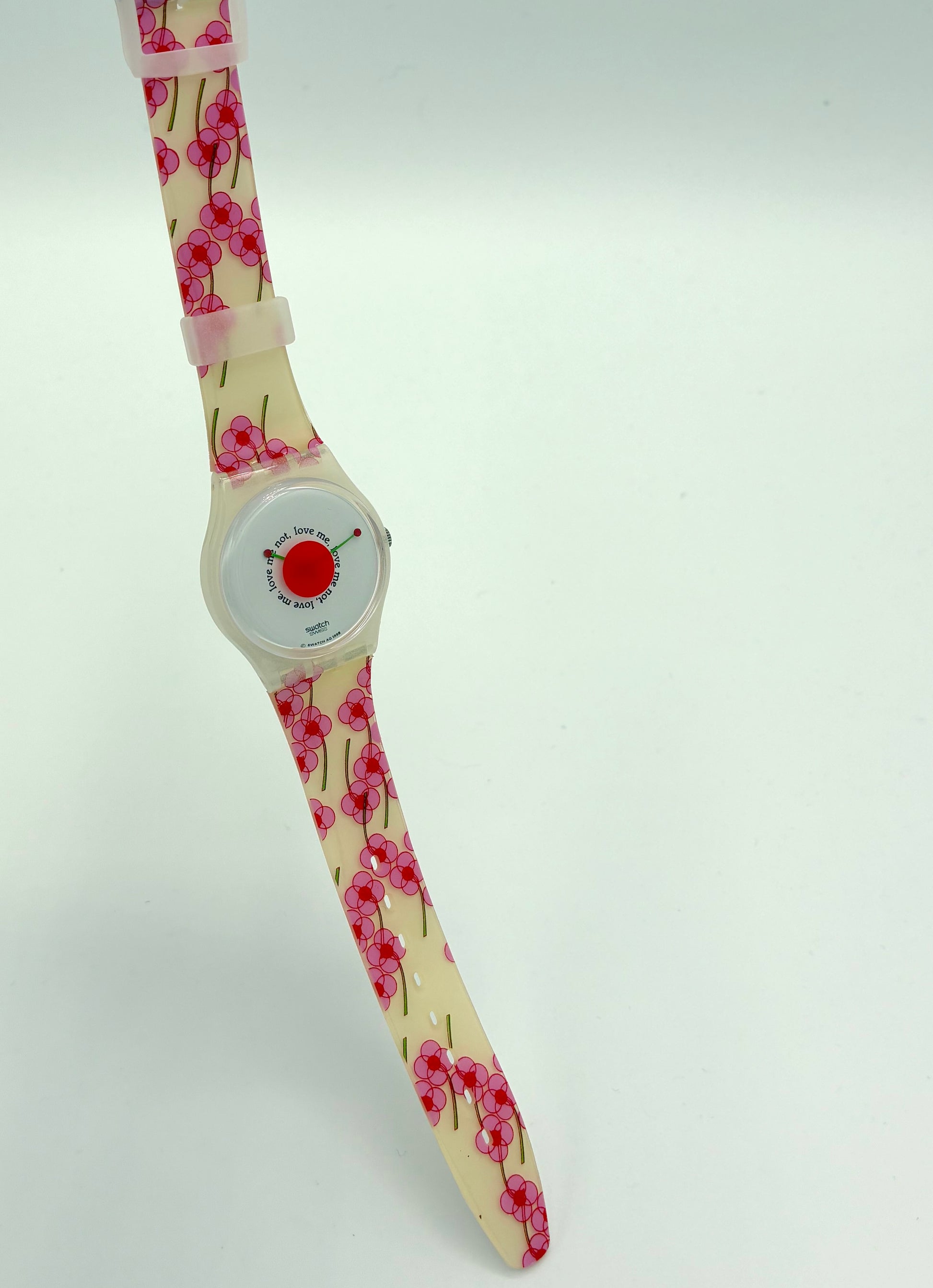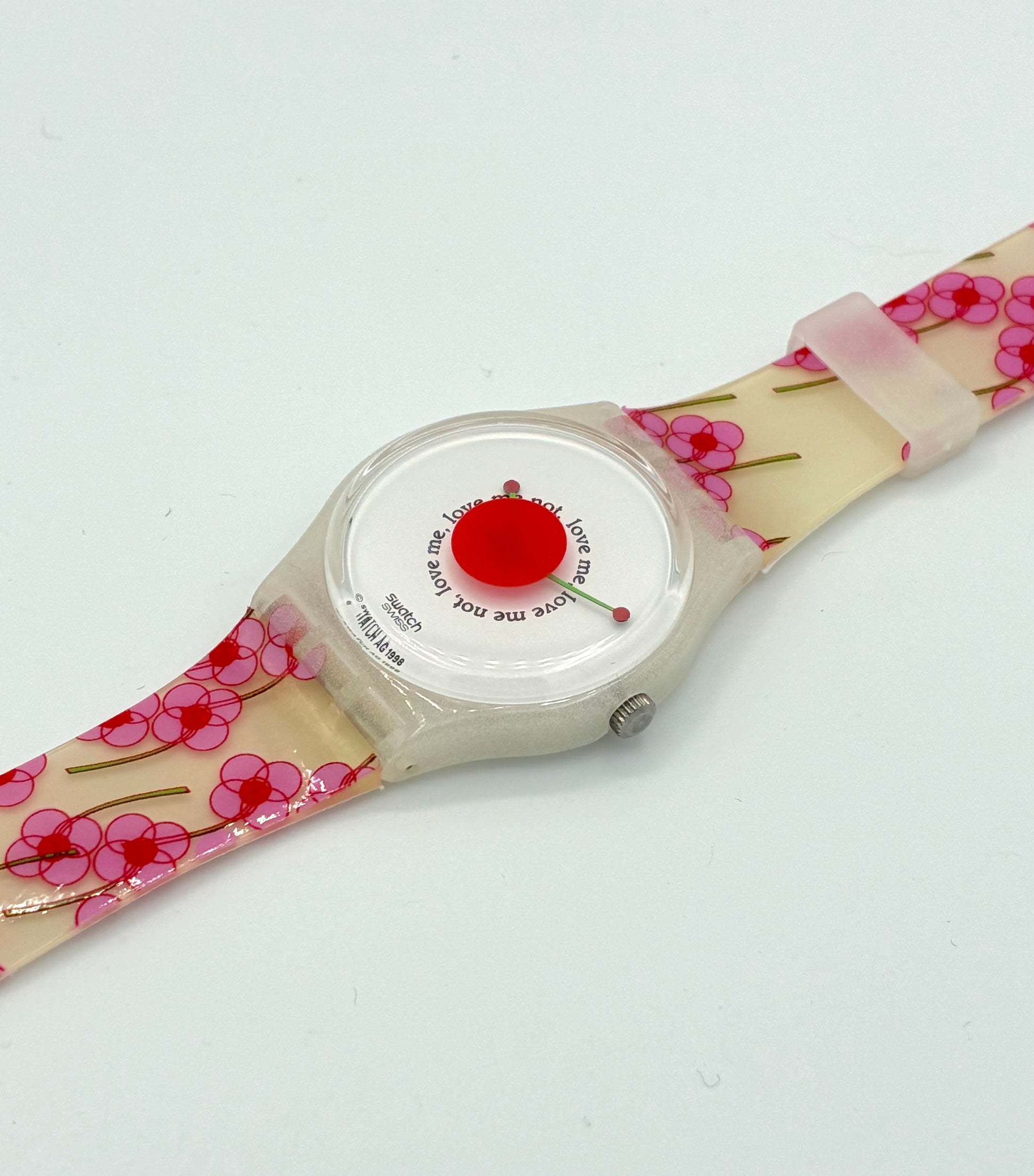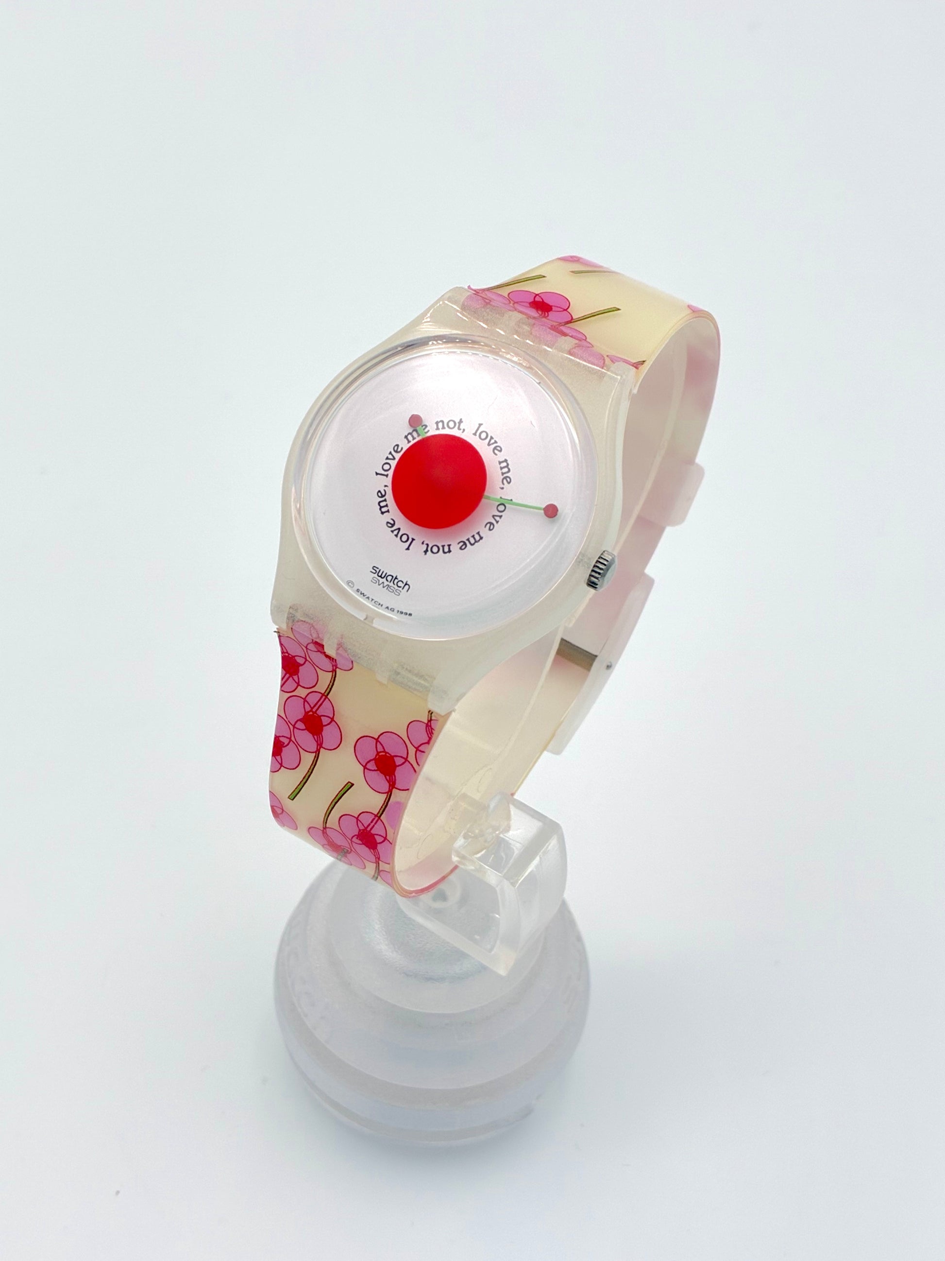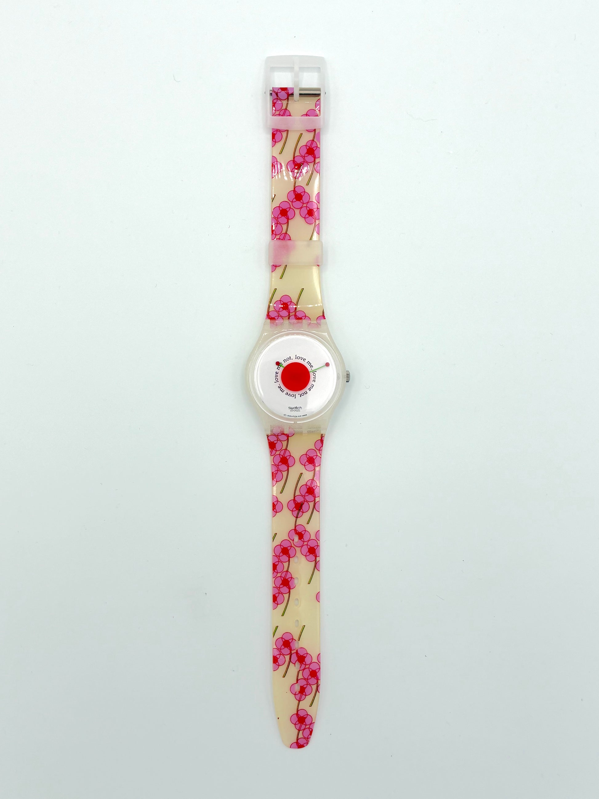Charming Design – Features a pink flower pattern and the sayings "love me" and "love me not" on the white dial.