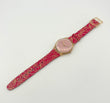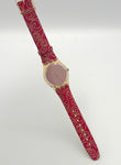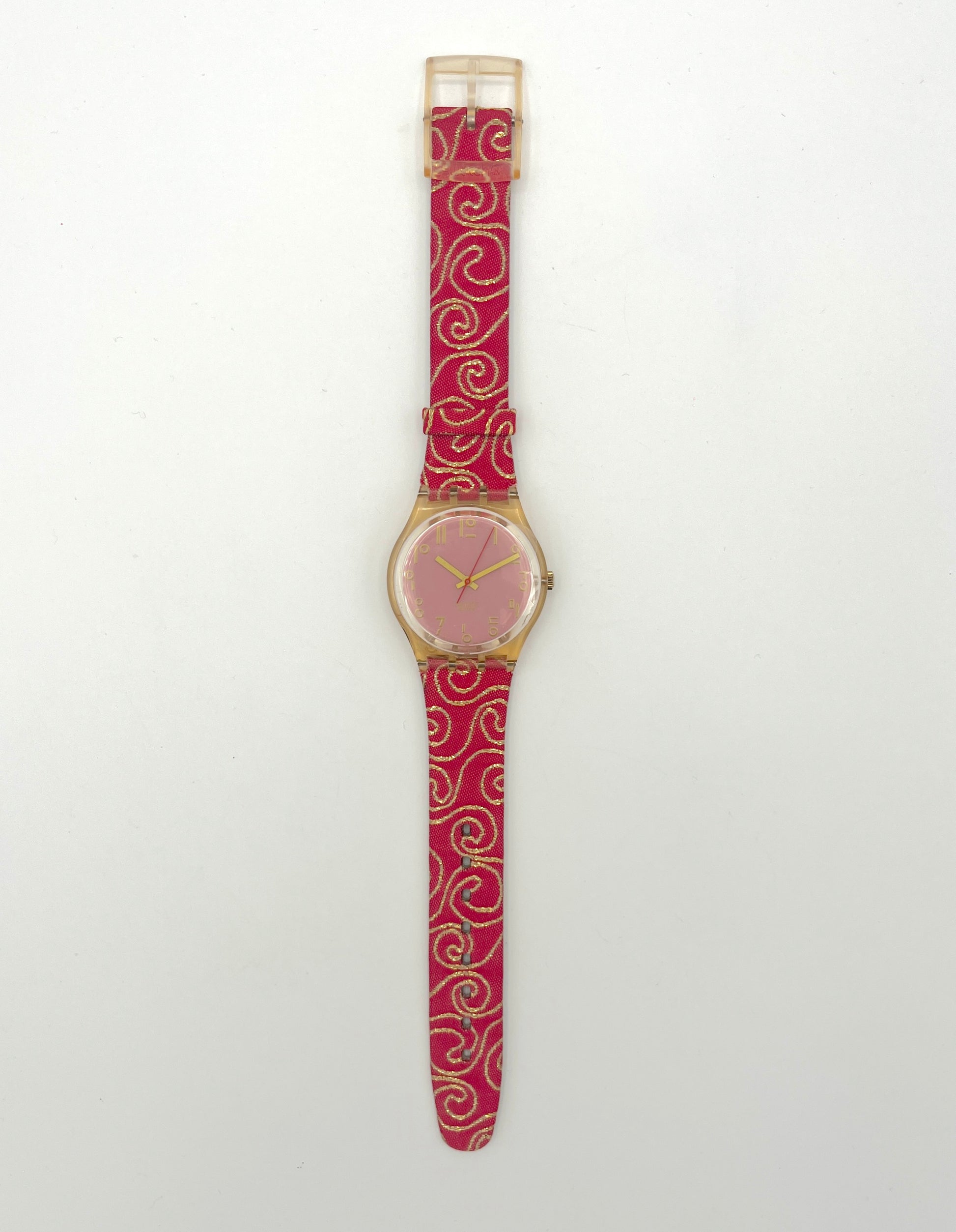 Unique Color Palette – Pink dial, raspberry-colored textile leather strap, and orange transparent case.