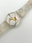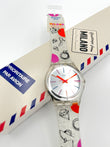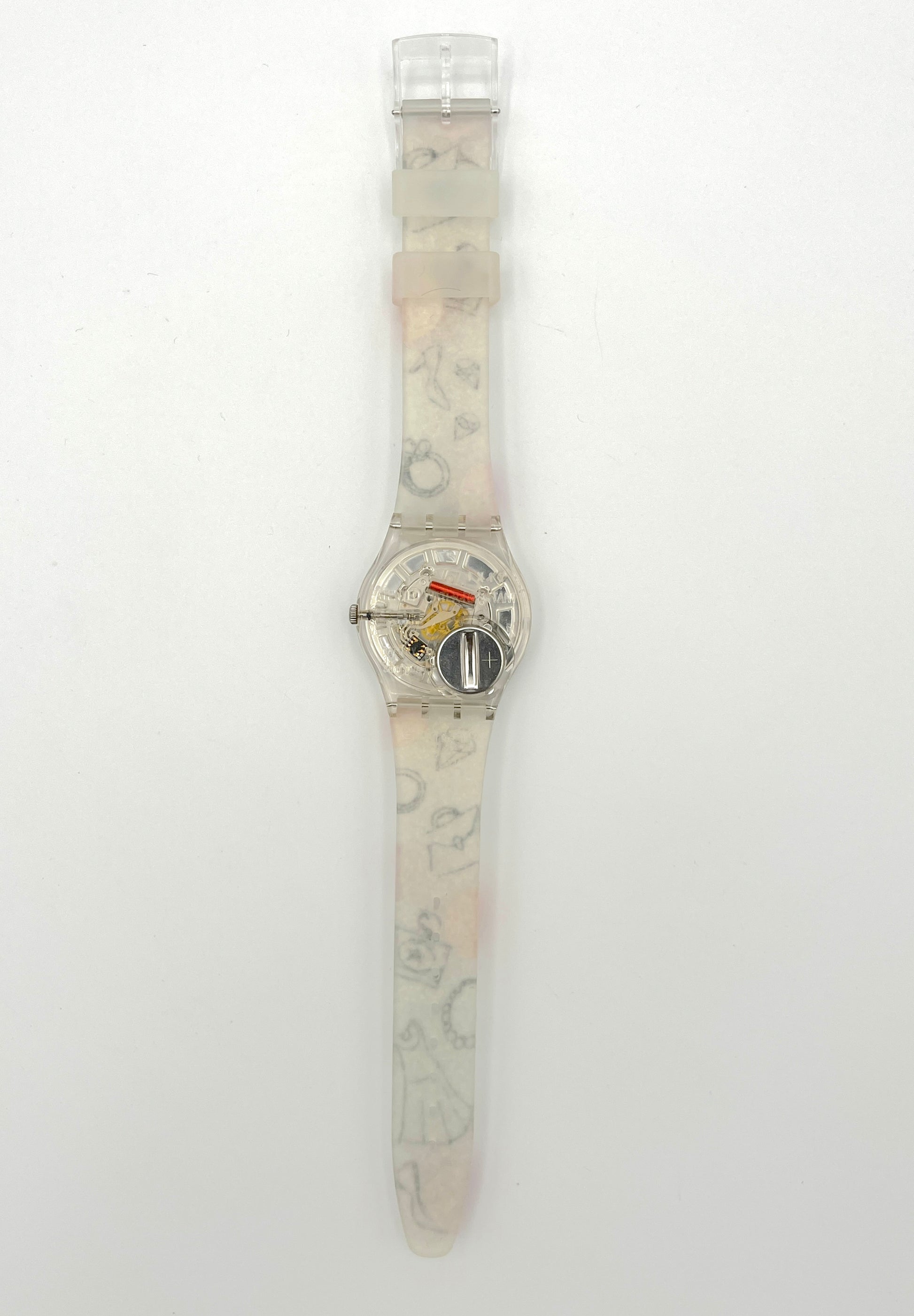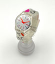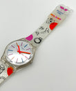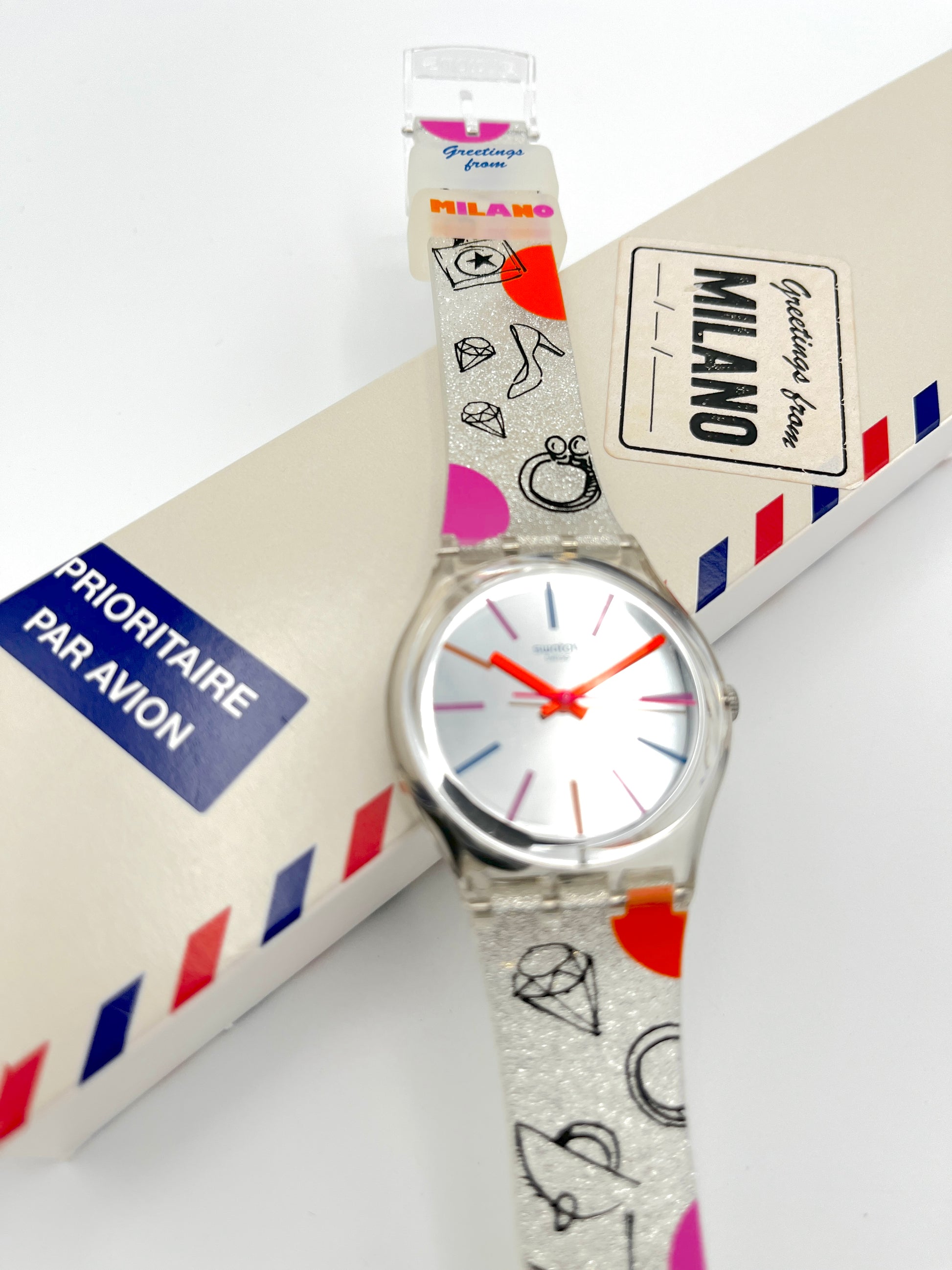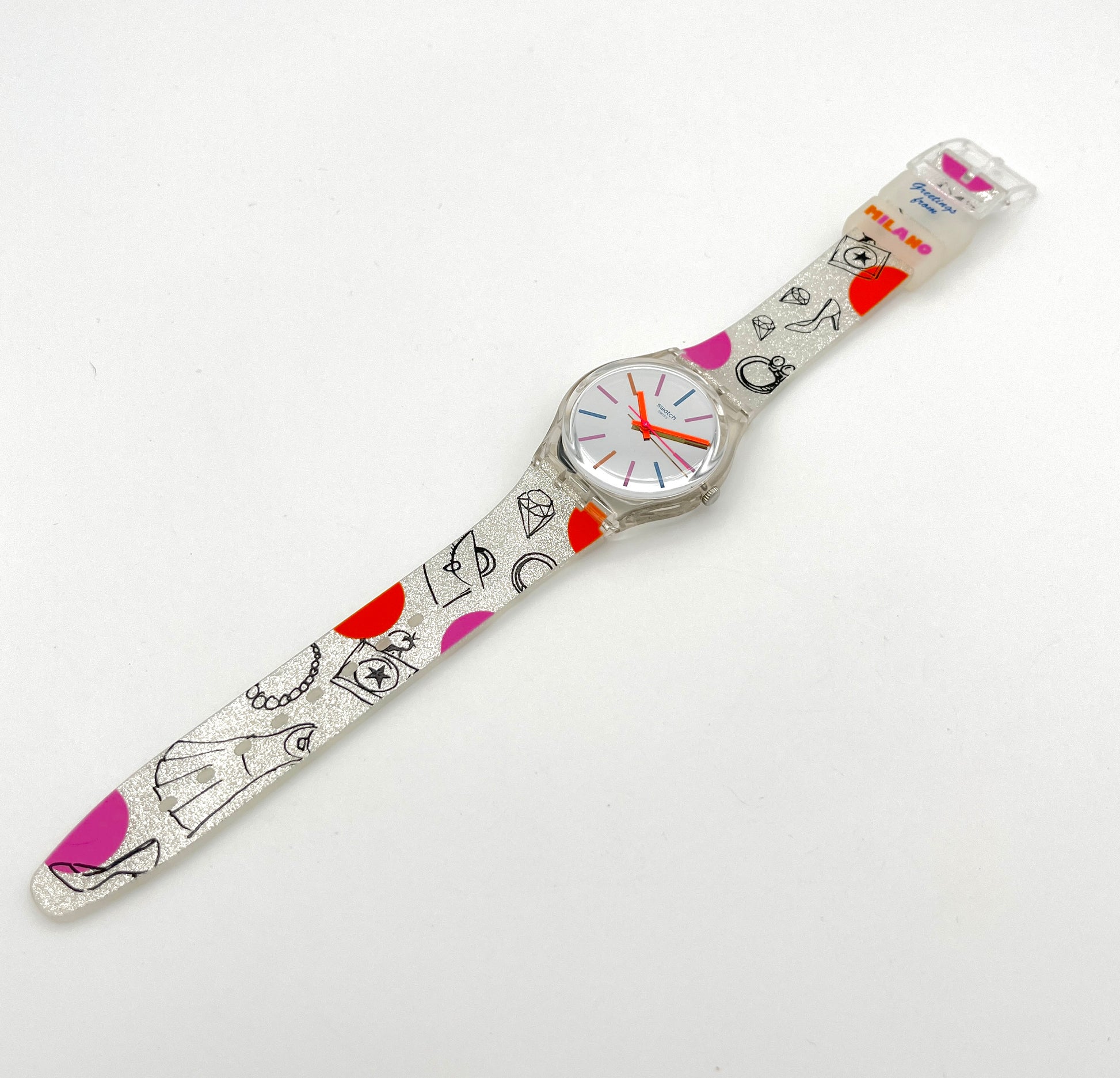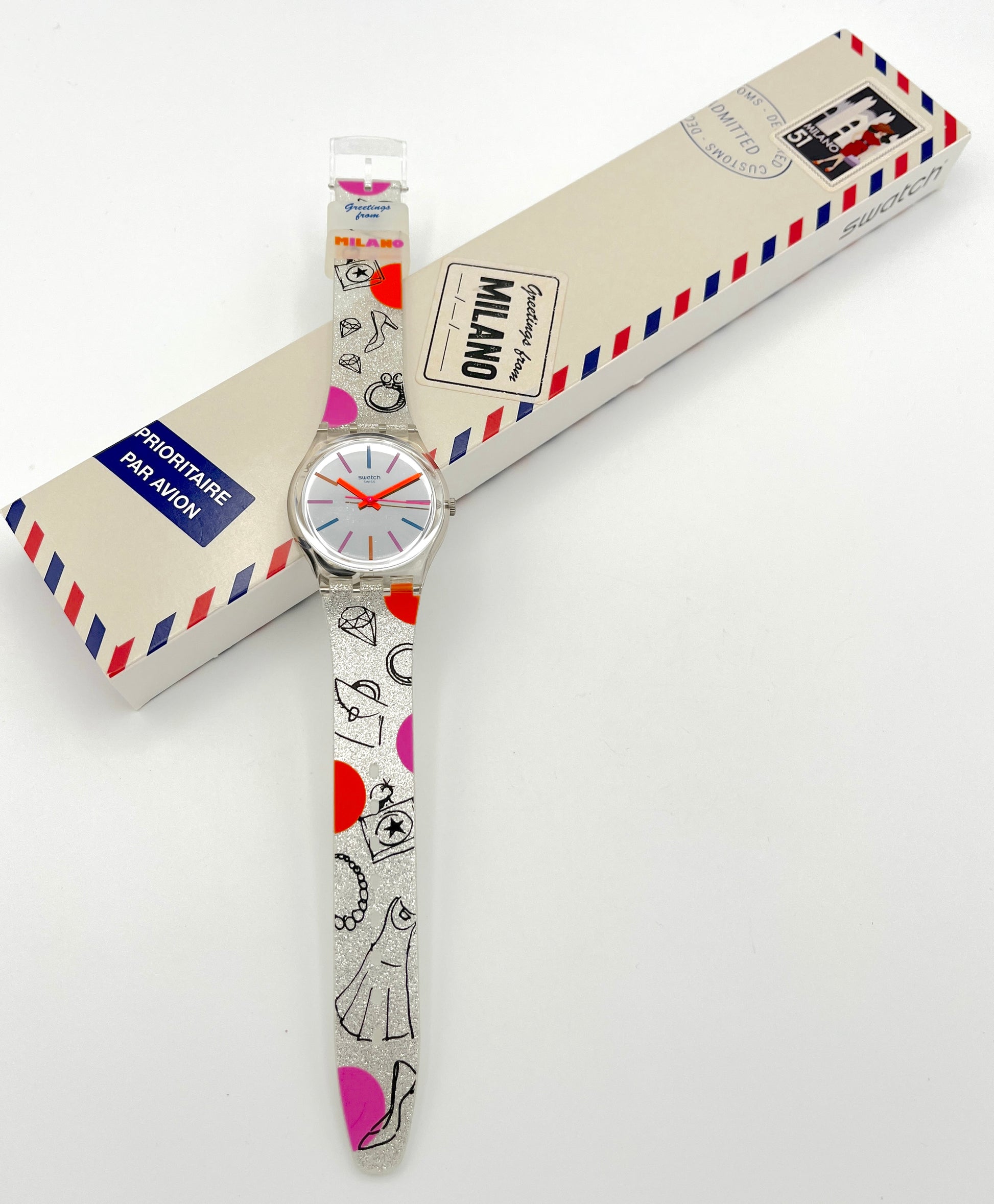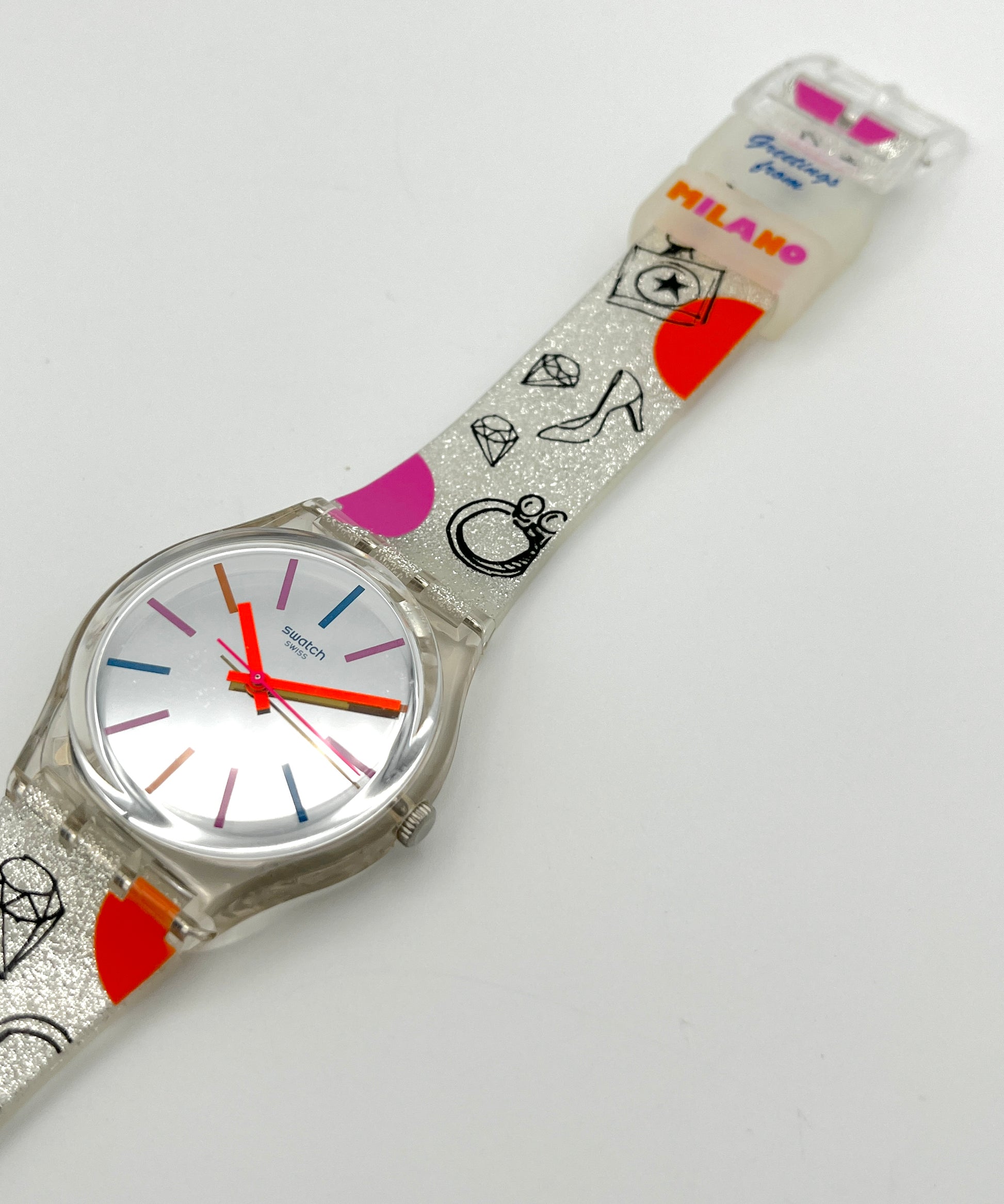 Exclusive Milano Edition – In keeping with the Italian metropolis and its fashion district, jewelry, accessories, and shoes are printed among colorful dots on the glittering silicone strap. The dial resembles a mirror and is also decorated with colored indices and hands. The phrase “Greetings from Milano” can be read on the two loops.