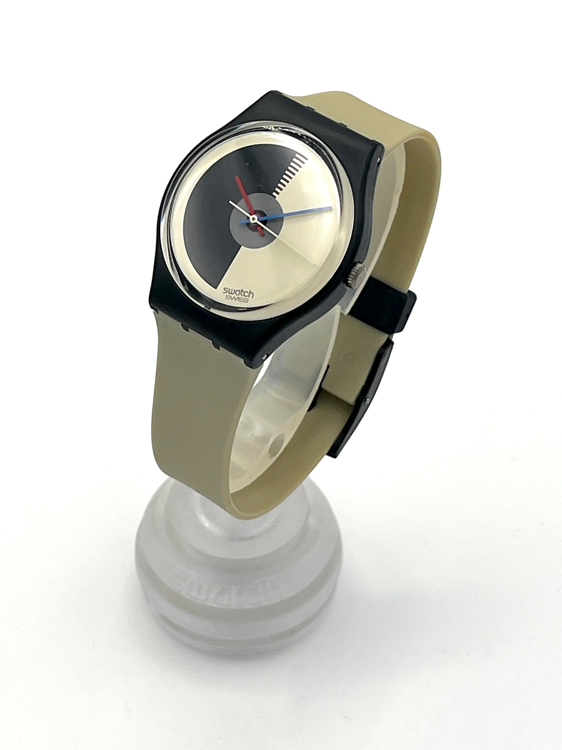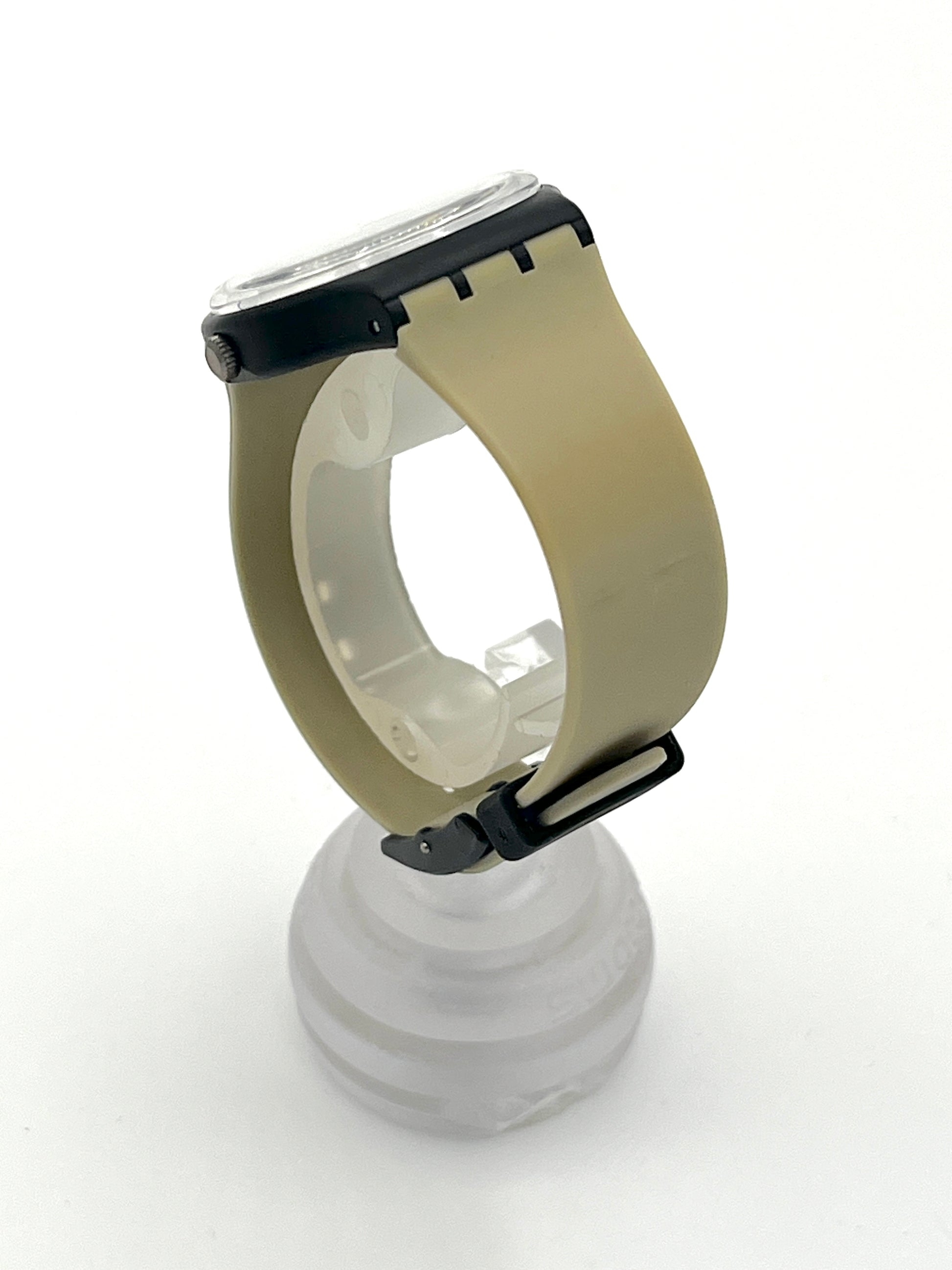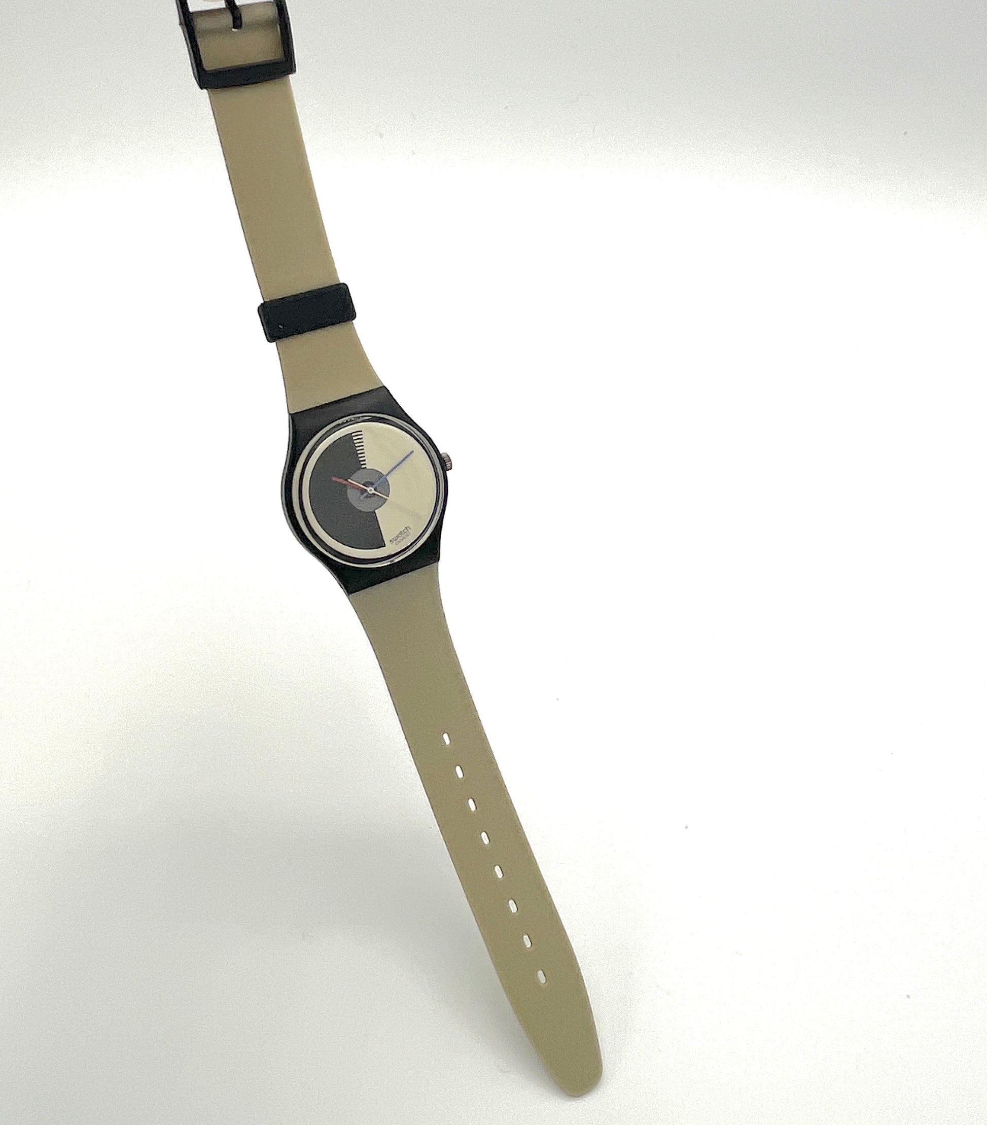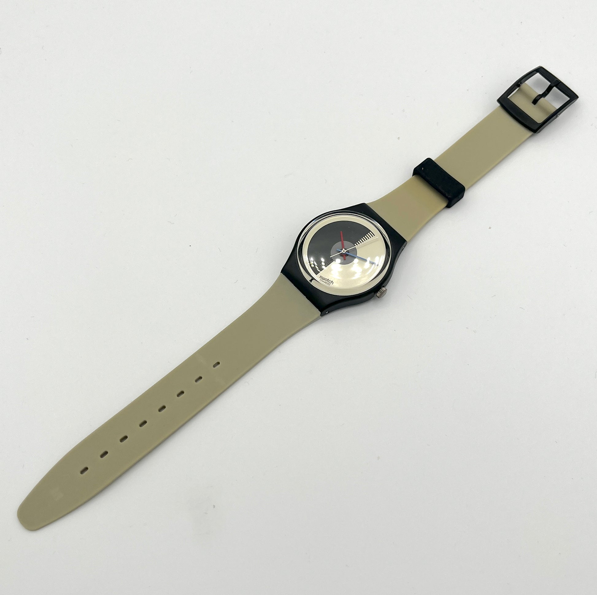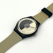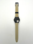 Swatch watch with a black and beige strap on a white background