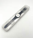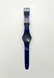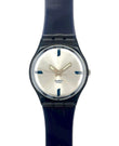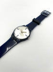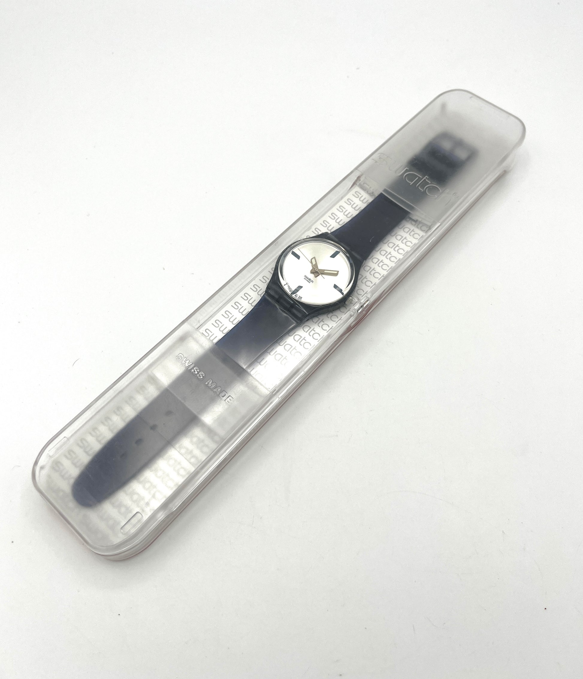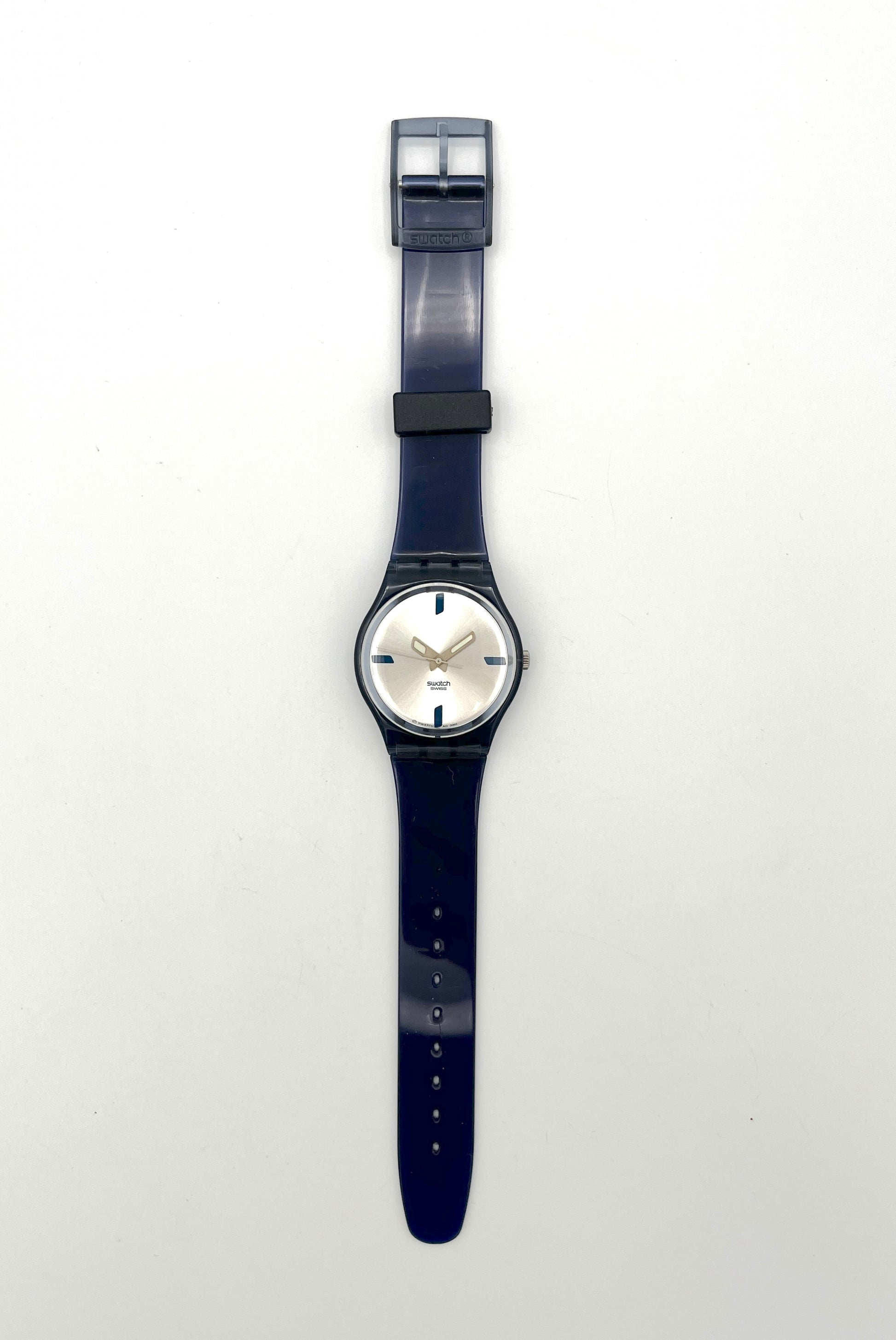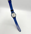 Version with transparent blue strap – The rare Swatch Gent STONEWASH GM160C from 2002 stands out thanks to its unusual design. The silver dial with bars is surrounded by a blue case. This version is different from the standard GM160 that has a flex band. This version has a transparent blue plastic band.