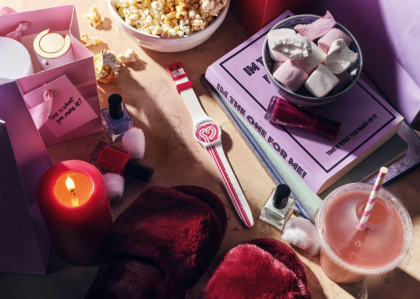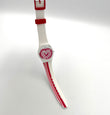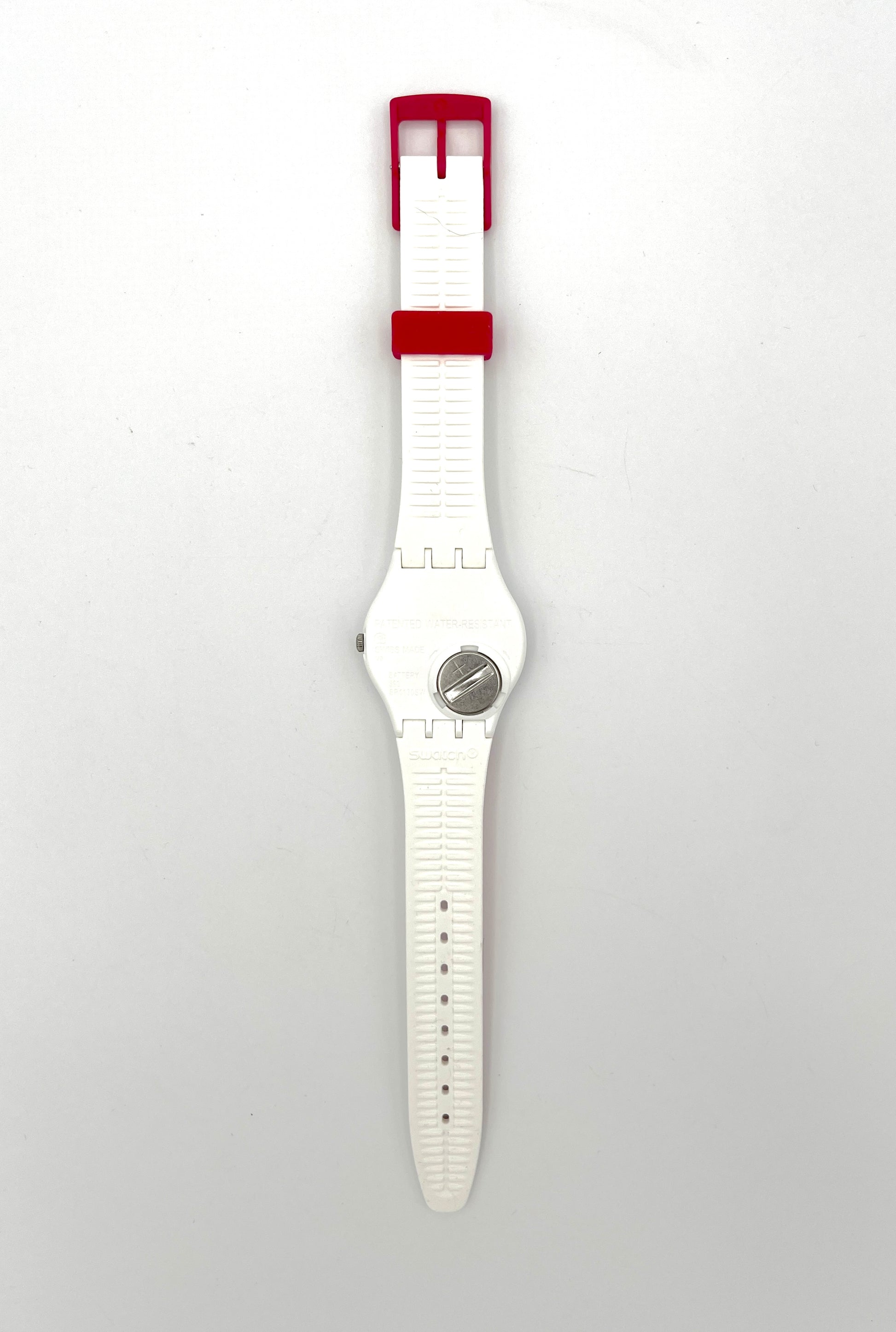 LOVE IS IN THE AIR – Swatch created the Gent BEATPINK GW124 for Valentine's Day on February 14, 2021. The white watch features pink lines in a 70s retro style that form a heart on the dial. They follow the beat of your heart and the music. The buckle and loop of the white silicone strap are also pink. The white plastic case of the waterproof watch houses a precise quartz movement.hands are red, creating a striking contrast.