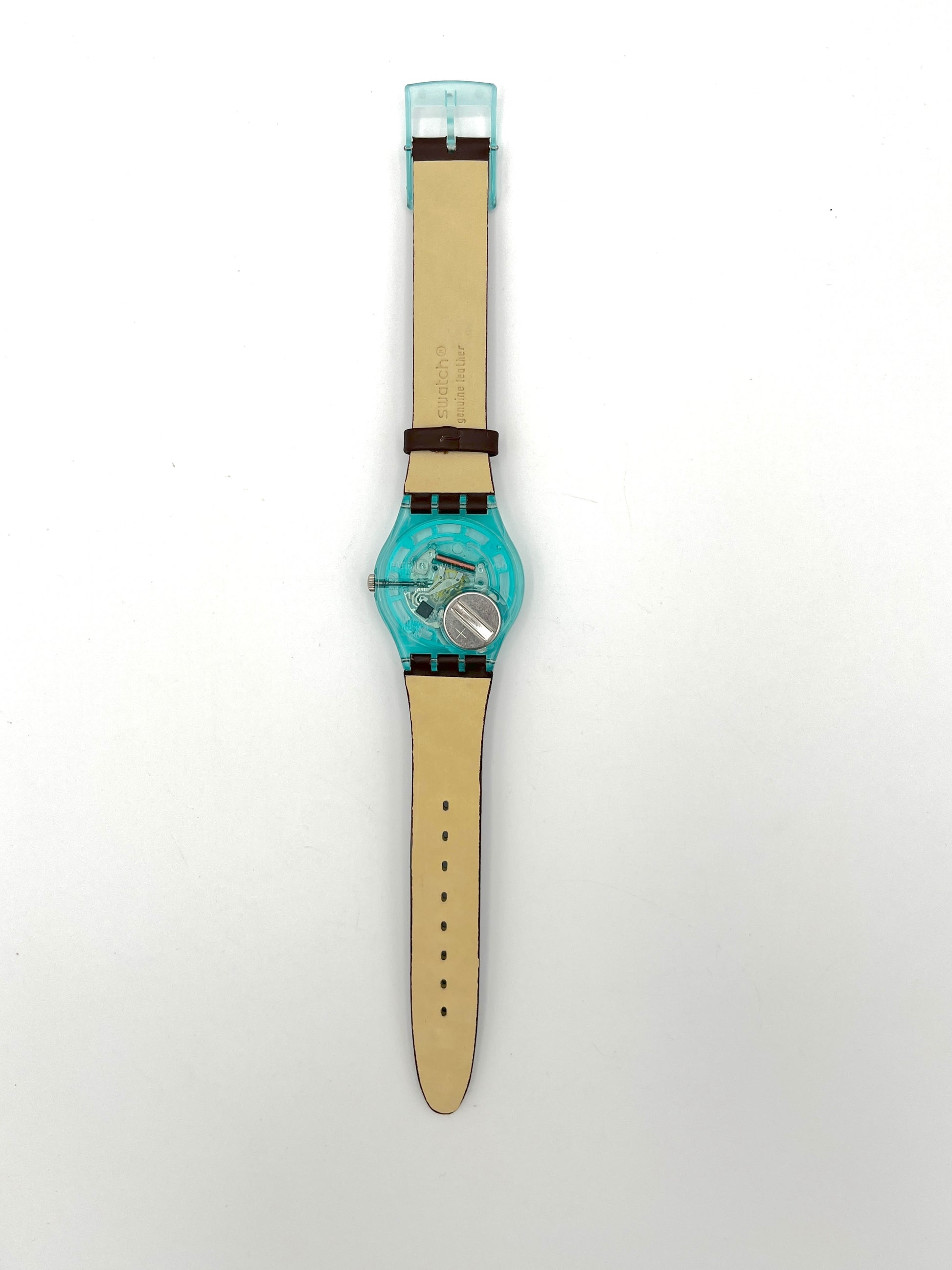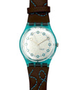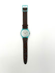 swatch Watch GL111 with a brown strap and turquoise accents on a silver dial