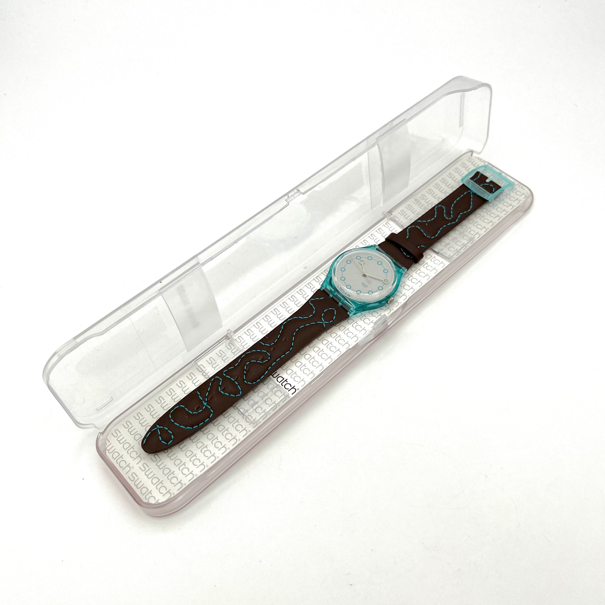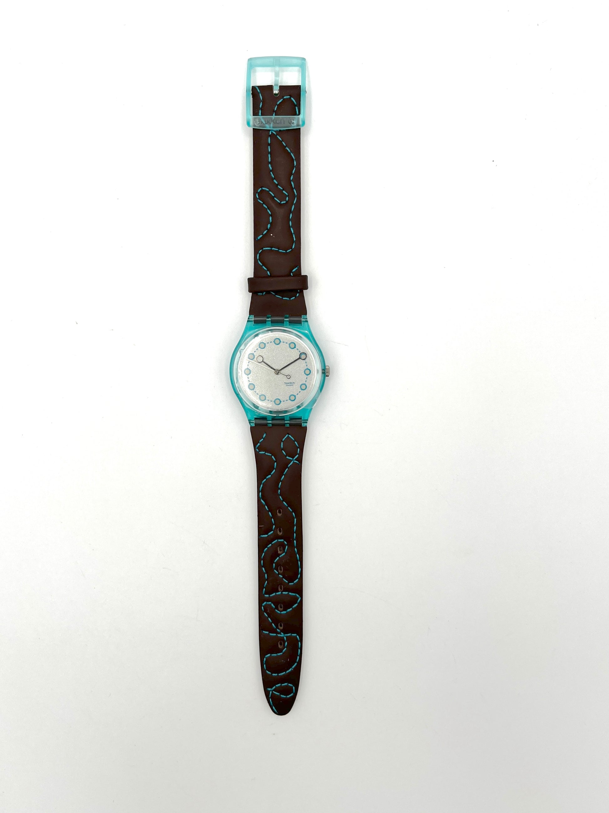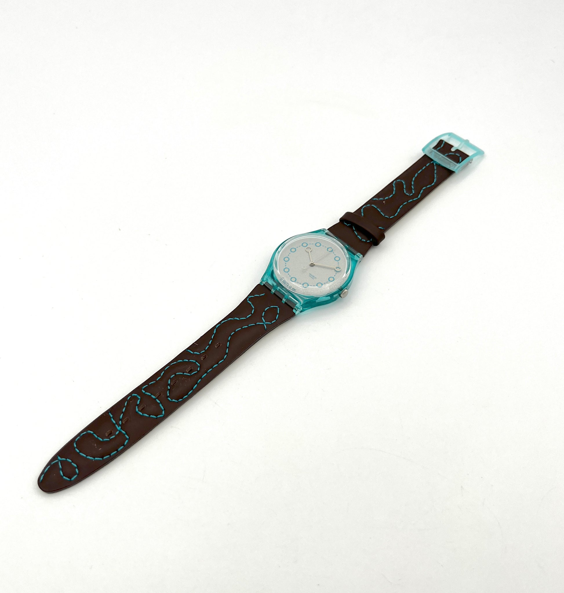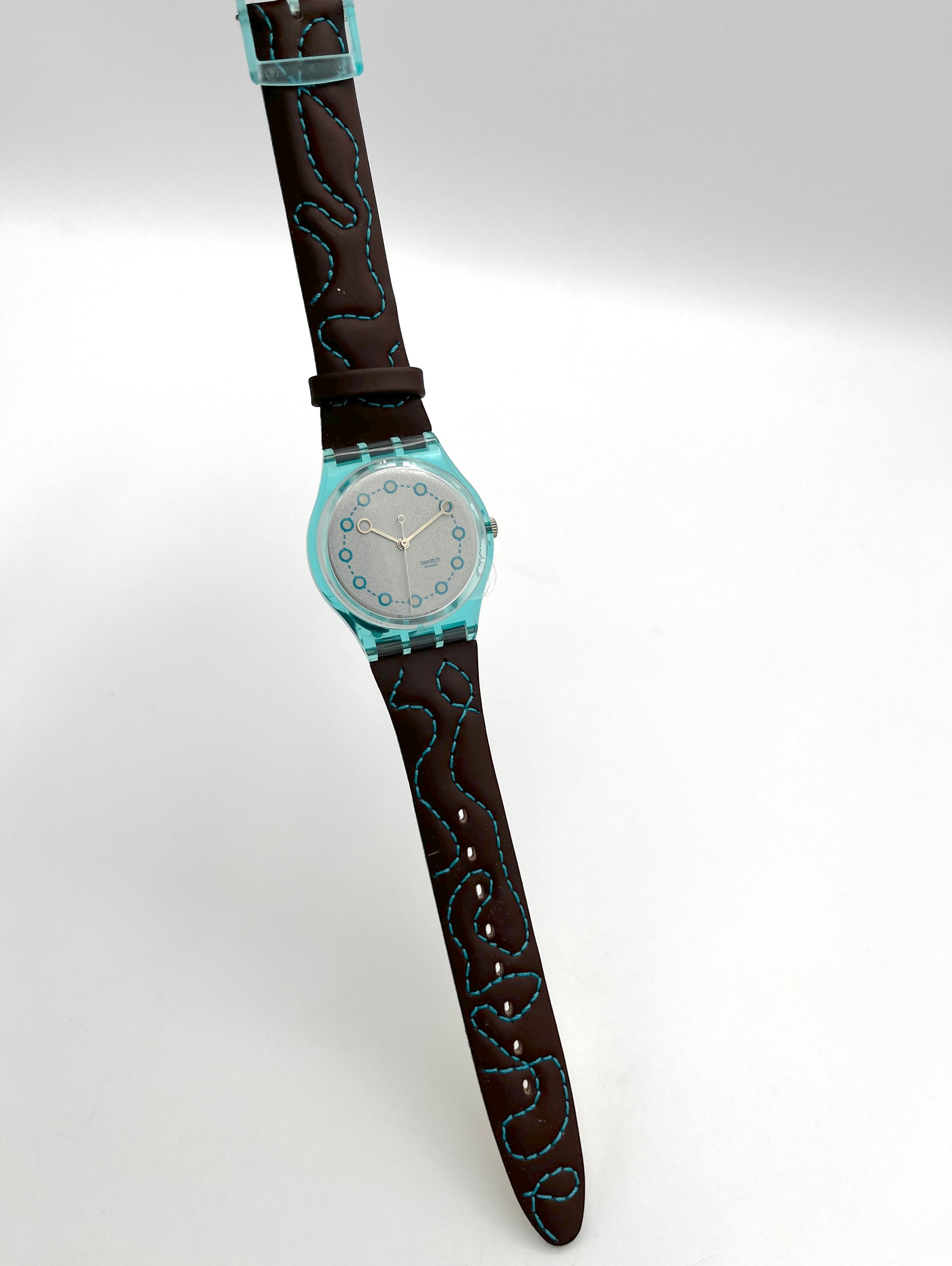 Leather brown strap – The rare Swatch Gent TURQUOISE GL111 from 2002 is enchanting, featuring curved embroidery on the leather strap. This stitching is decorated in contrasting turquoise on the dark brown blank leather. The buckle and case are also made of plastic and turquoise. Silver hands rotate on the matching dial, whose markings are small circles connected by a dotted line.