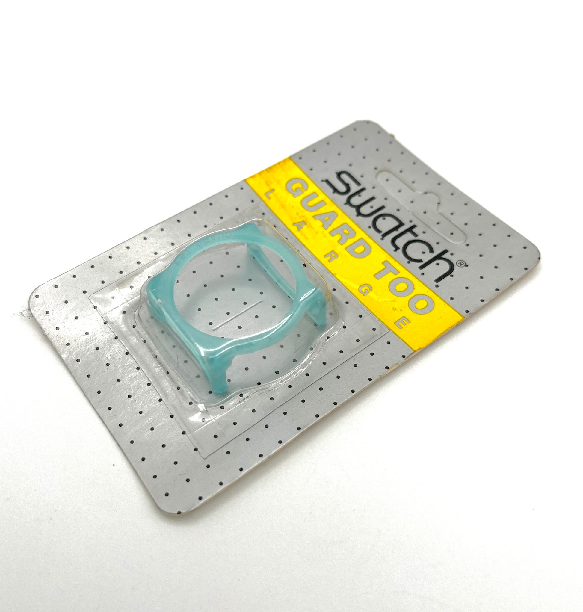 100% New – Unused, original plastic Swatch Guard Too Large in transparent turquoise.