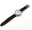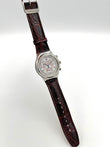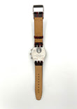 Rare Collector's Piece – The elegant Swatch RICHESSE INTERIEURE comes from the first series of Swatch Chronos with metal cases, and the watch is now almost impossible to find. Blue and red numbers with black indices can be seen on the white dial. An elegant reddish-brown leather strap with a steel clasp is attached to the shiny steel case.