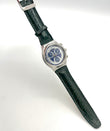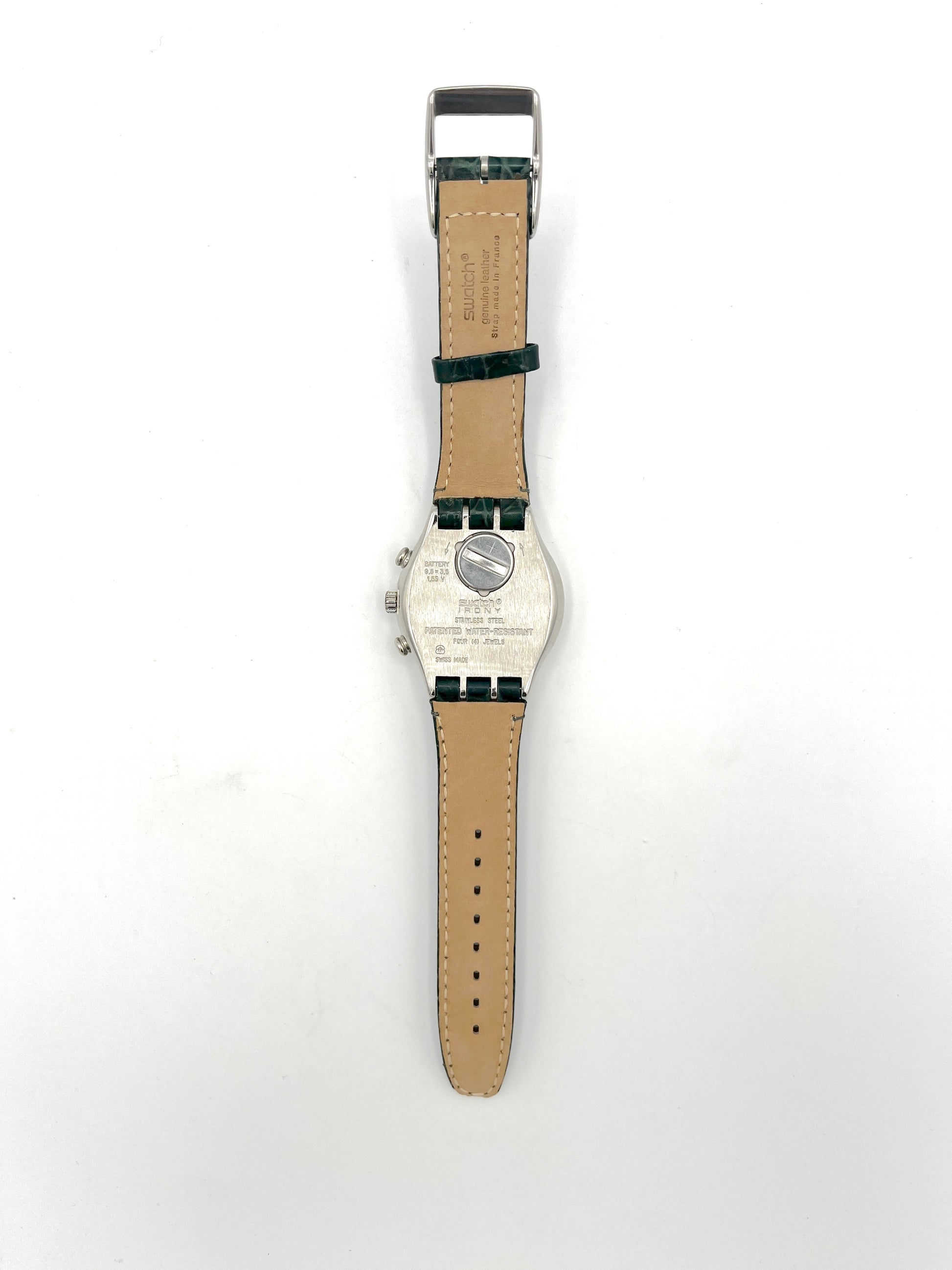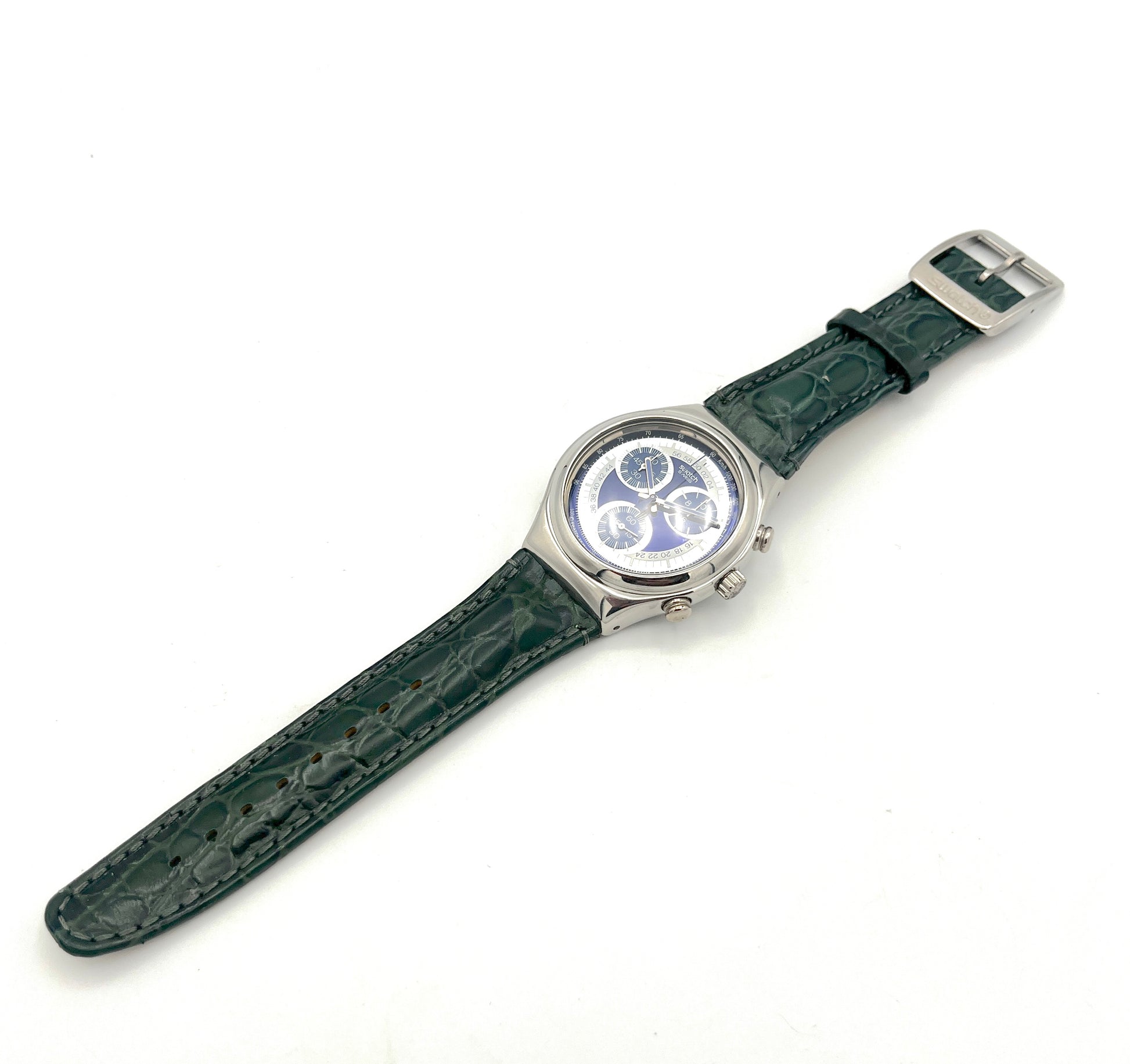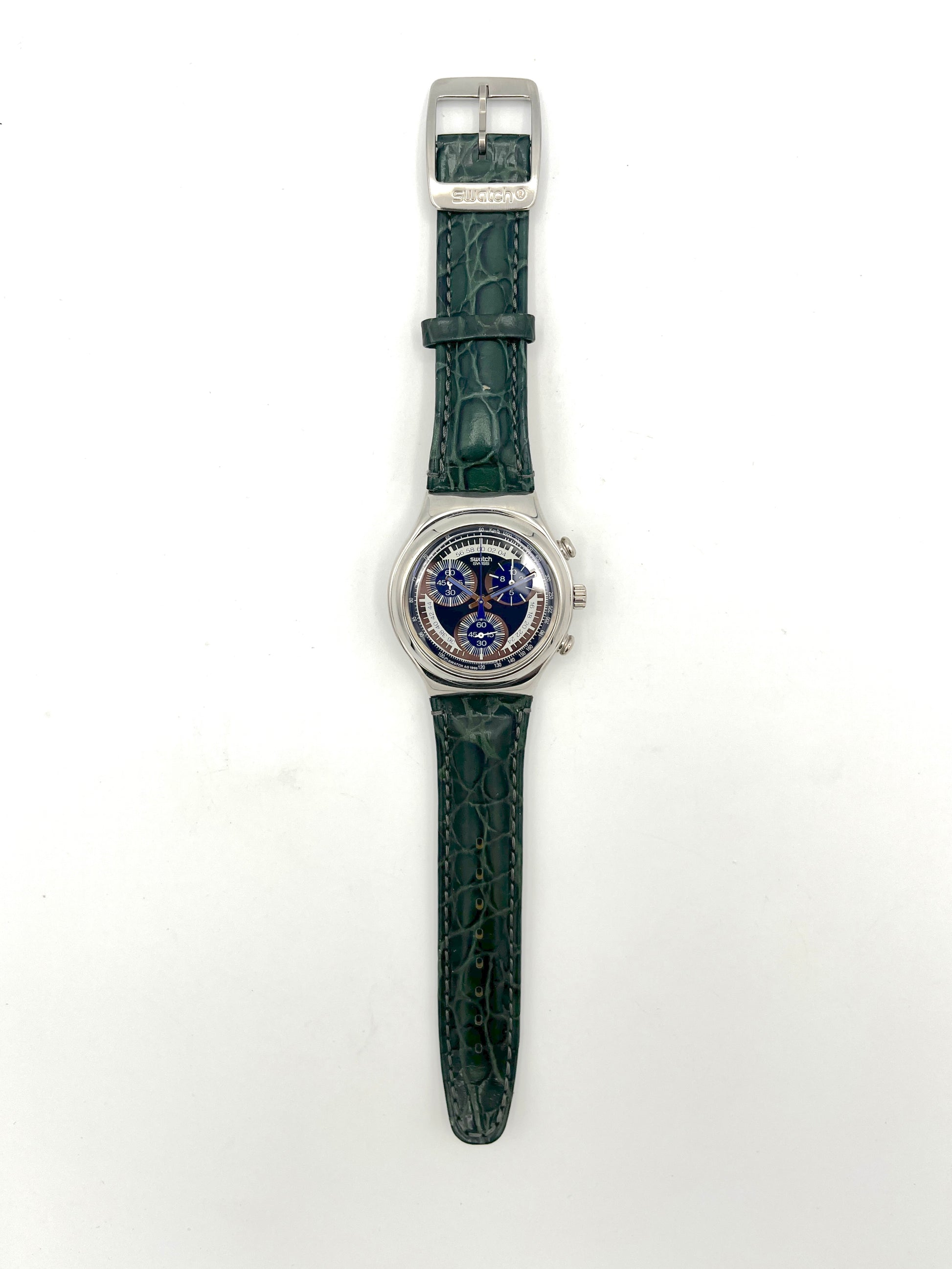 Rare Collector's PieceThis 1996 Swatch SEATRIP comes from the first series of Swatch Chronos with metal cases, and the watch is now almost impossible to find. The functions are displayed on the dial against a dark blue background, and the white numerals ensure good readability. The polished case with bezel is made of stainless steel, and the elegant strap is crafted from green crocodile-textured leather.