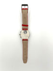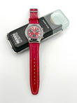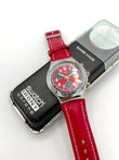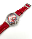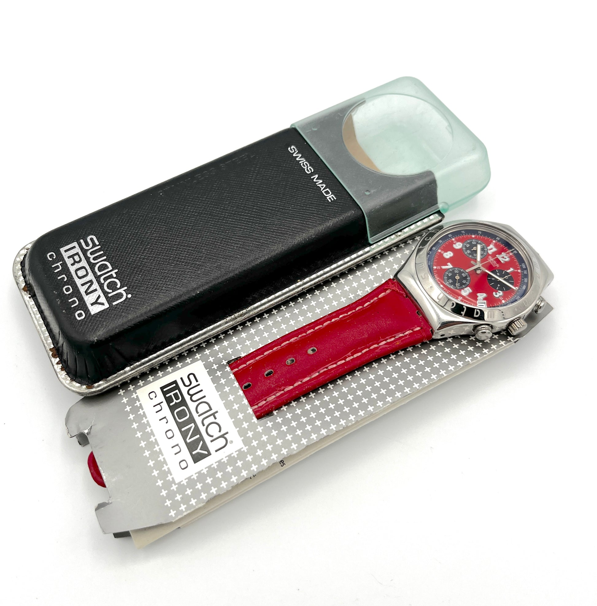 Rare Collector's Piece – This rare Swatch Irony Chrono was launched in 1998 in two versions, one with a red leather strap and this one with a dark blue leather strap. On offer here is the version with the red strap.