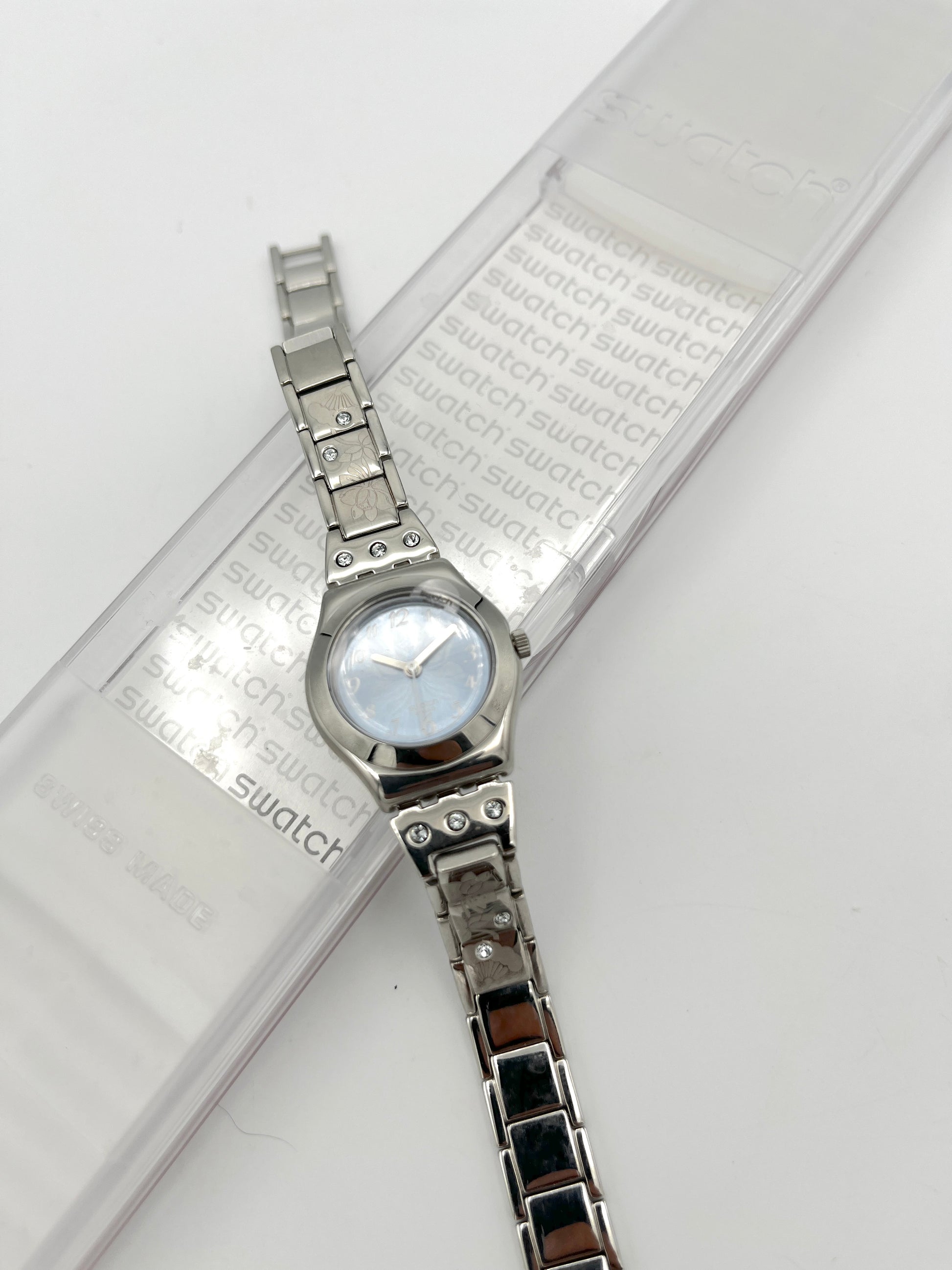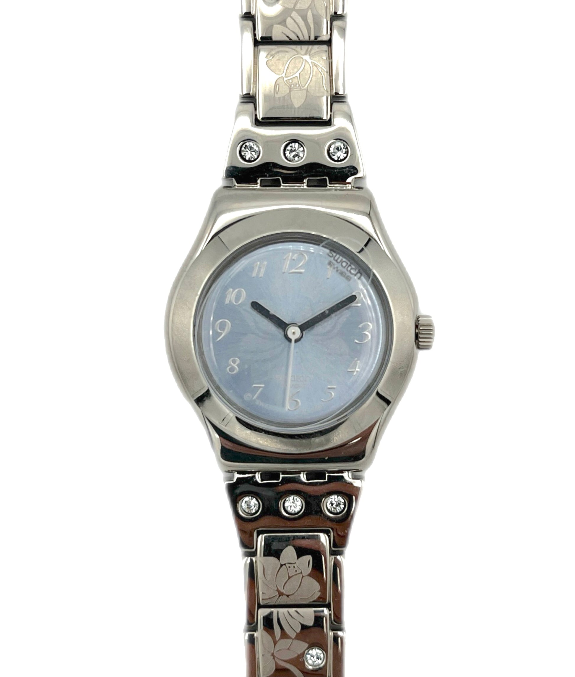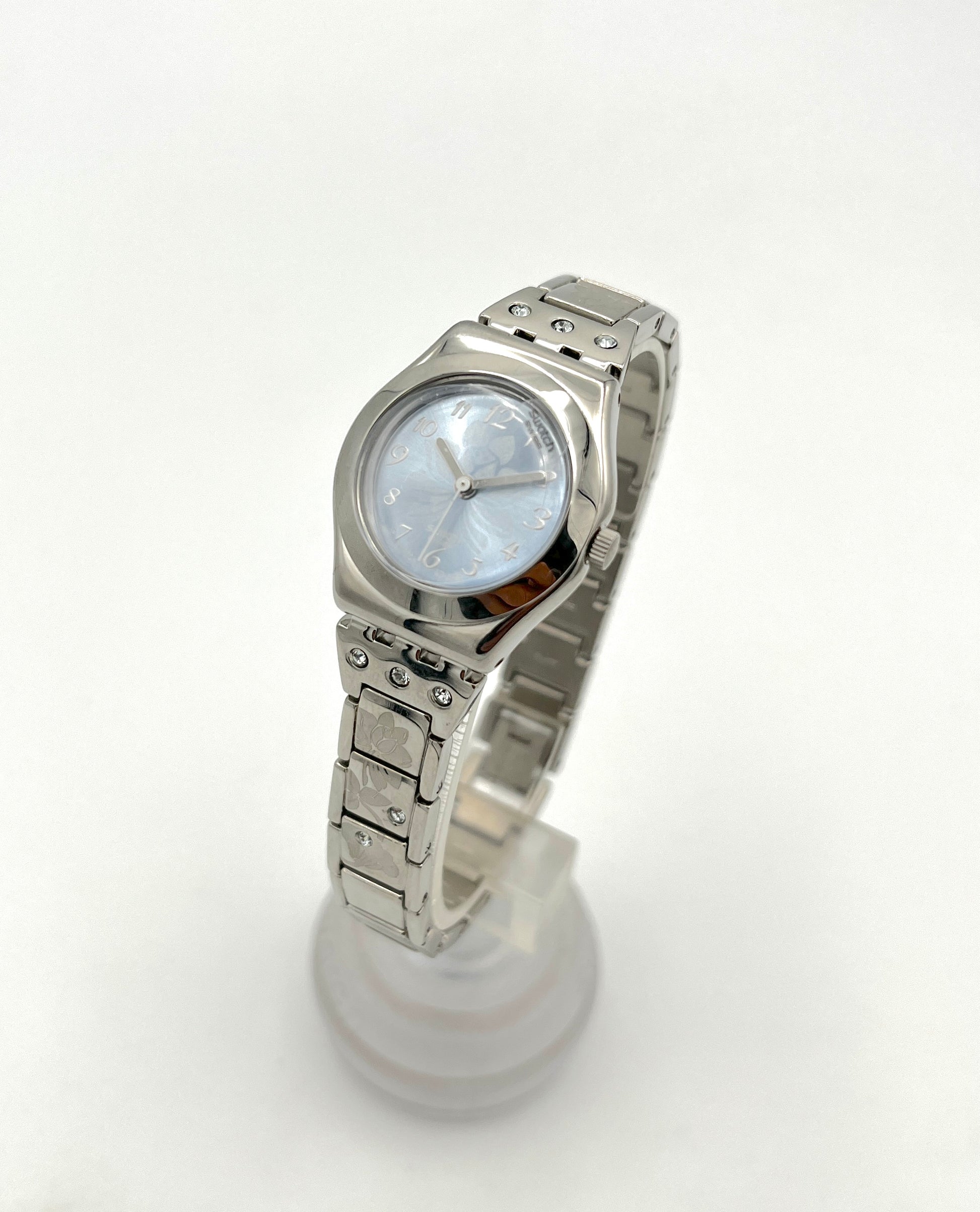 Double Elegance – The Swatch Irony Lady FLOWER BOX is a small ladies' watch with floral motifs. A highlight is the ice-blue dial with a flower in the center, created with silver hands and numbers. This motif continues on the polished bracelet as a matte engraving. The case and bracelet, which can be shortened as desired, are made of stainless steel.