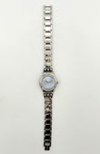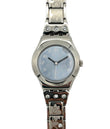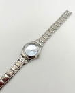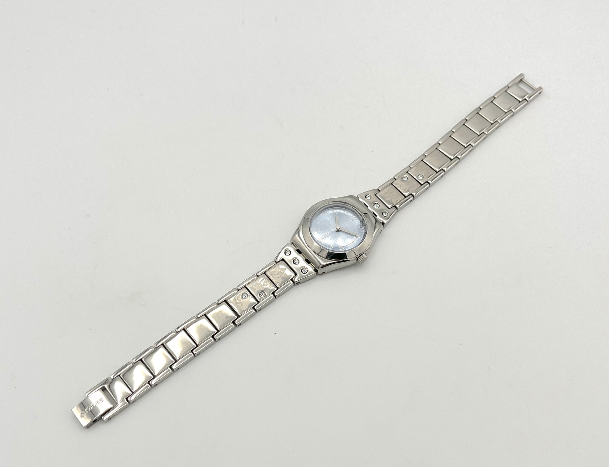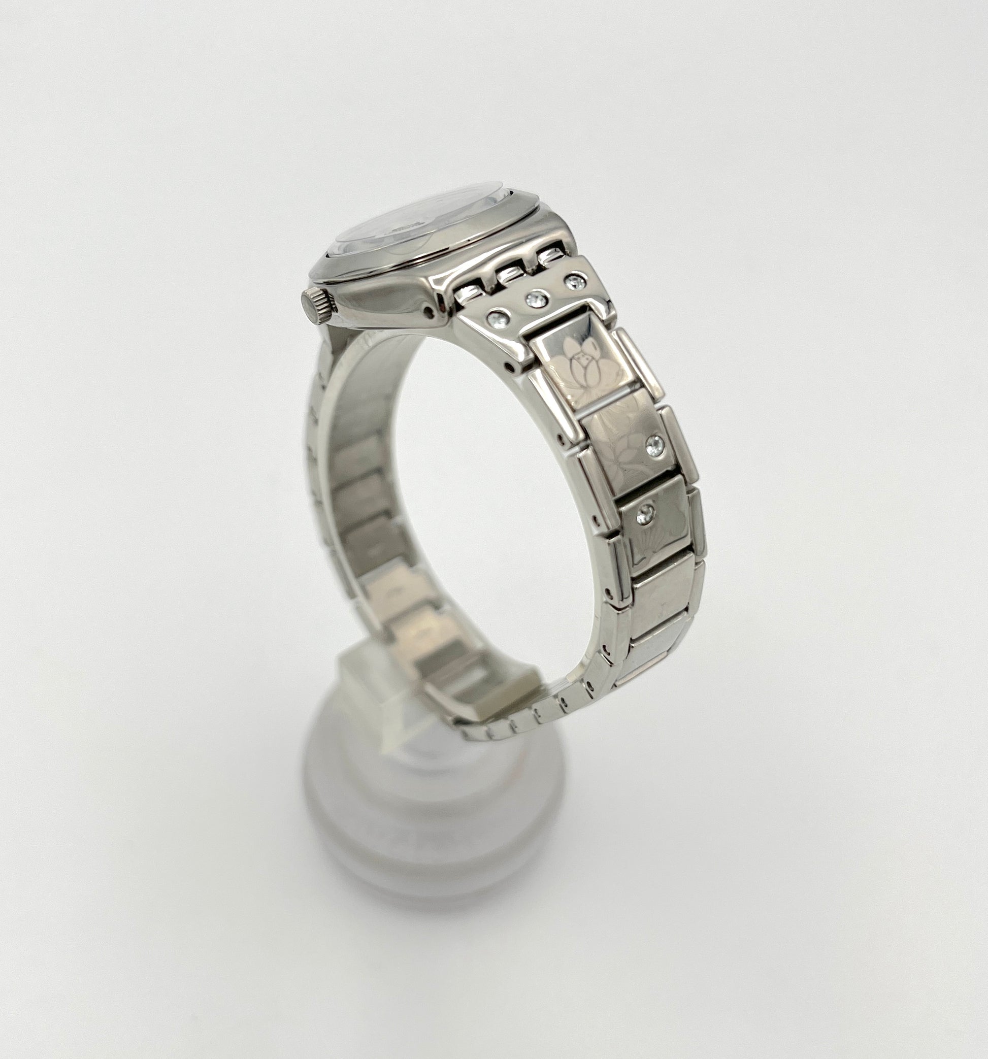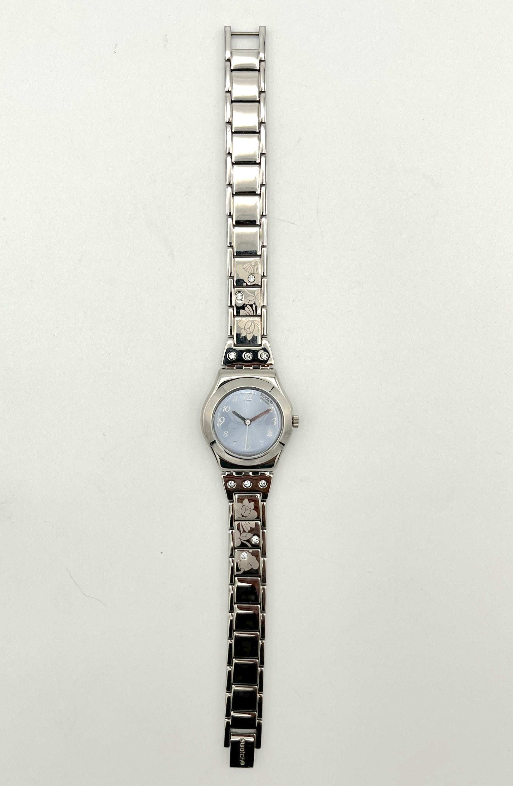 Double Elegance – The Swatch Irony Lady FLOWER BOX is a small ladies' watch with floral motifs. A highlight is the ice-blue dial with a flower in the center, created with silver hands and numbers. This motif continues on the polished bracelet as a matte engraving. The case and bracelet, which can be shortened as desired, are made of stainless steel.