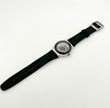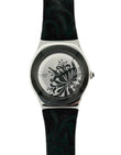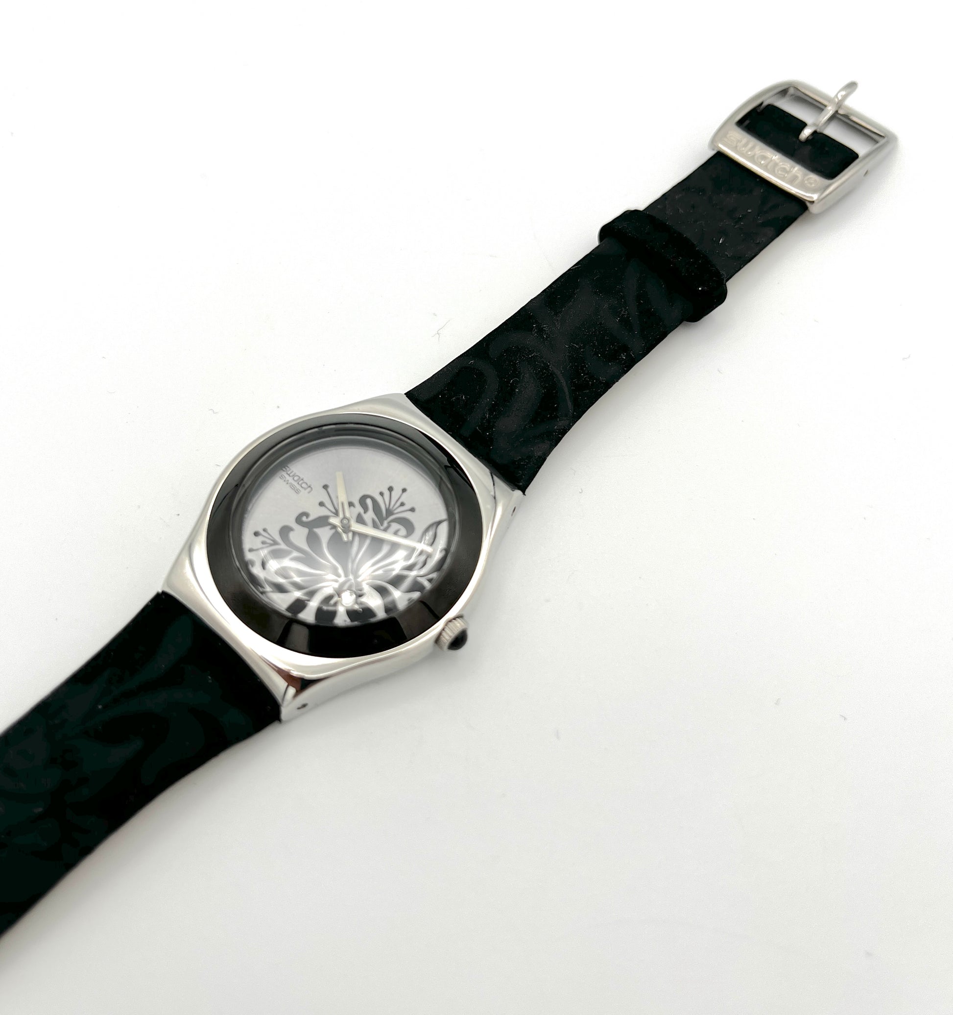 Classy Design – The very rare Swatch BLACK FLOWER is a medium-sized watch with a polished stainless steel case and a leather strap with black textile covering on the top. This continues the color design of the dial.