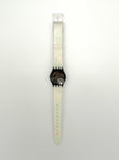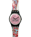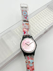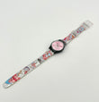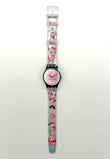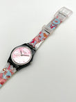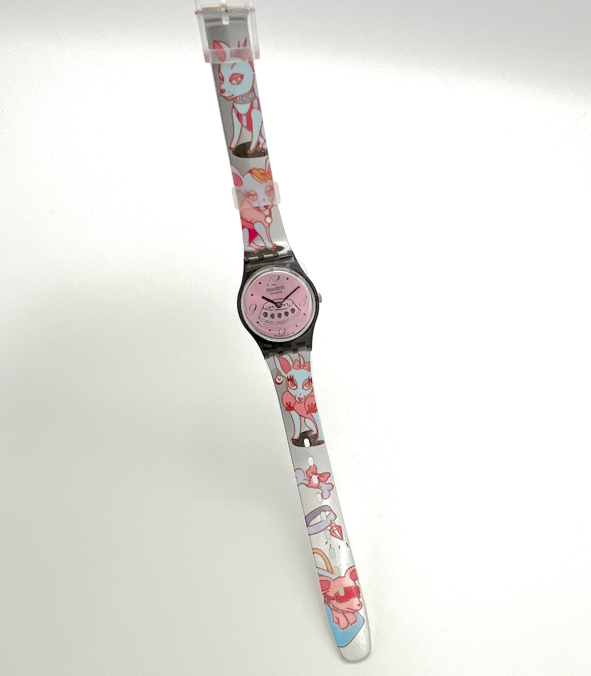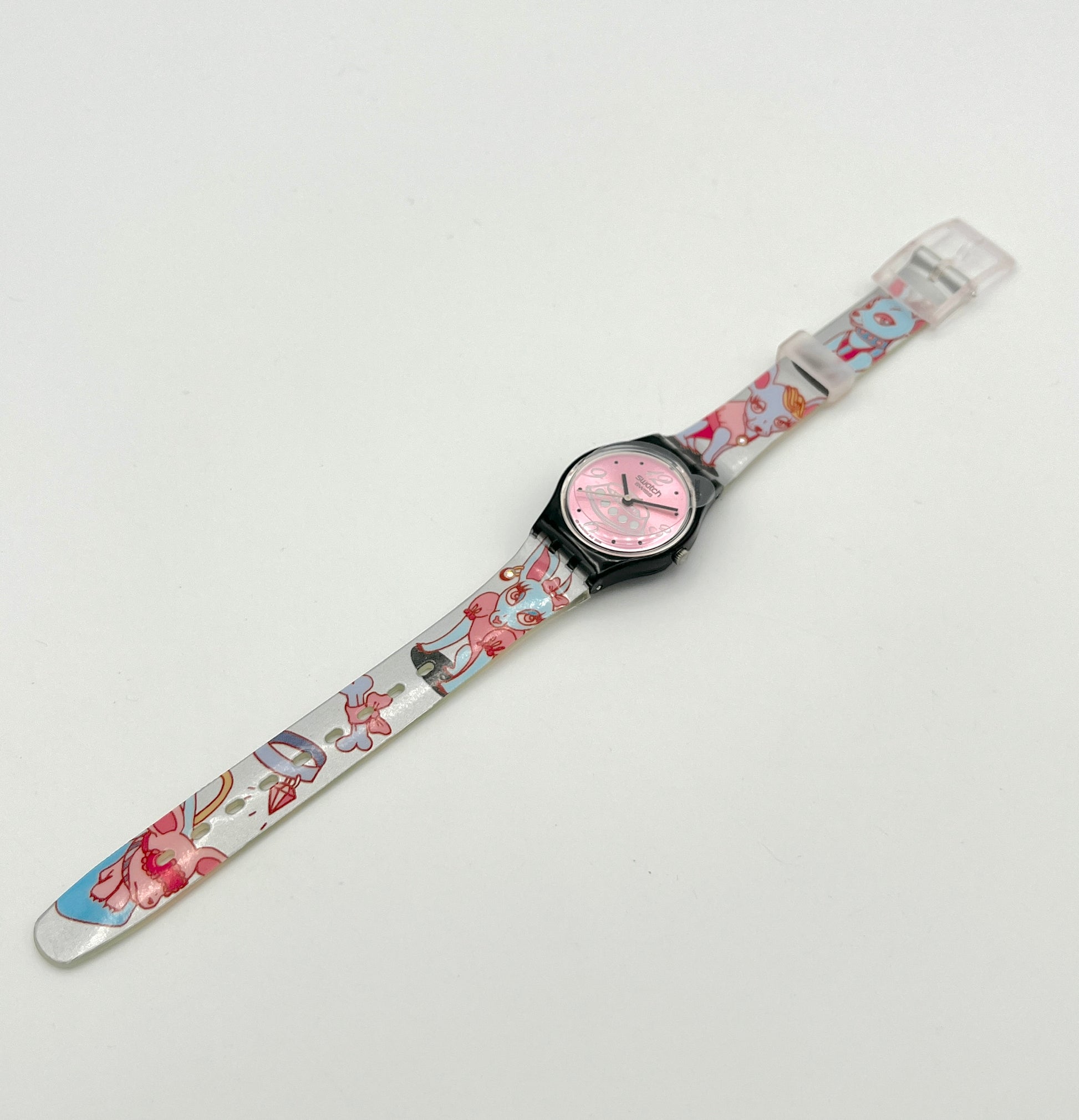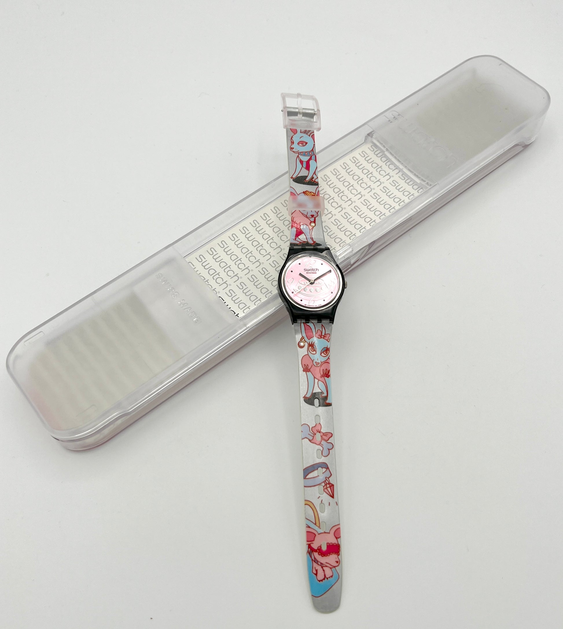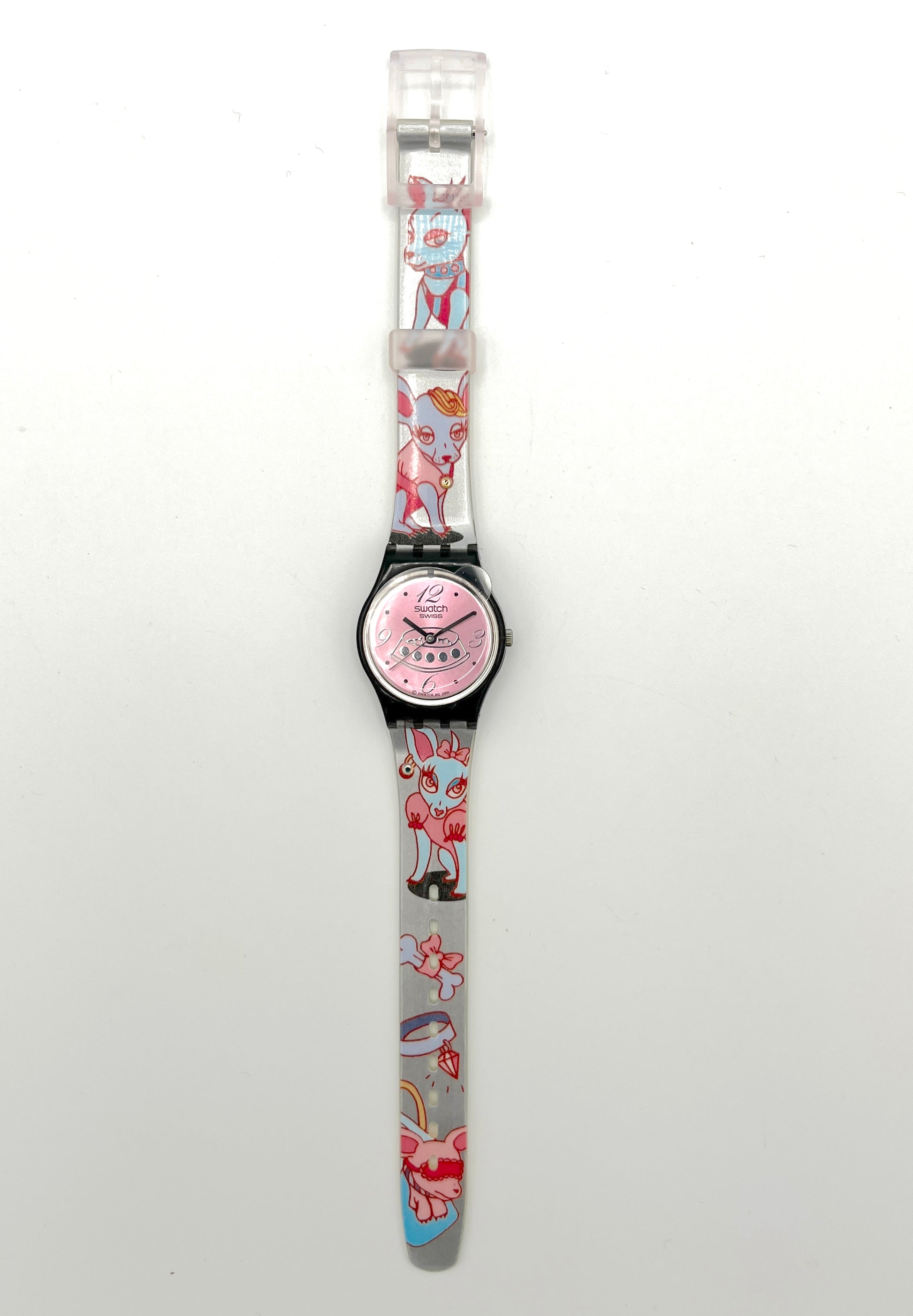 Elegant Design – The very rare Swatch Lady TWINKABELL is a beautiful accessory. The pink dial with a printed food bowl is surrounded by a black case. The playful plastic strap of the watch is covered with lots of little animals and bones