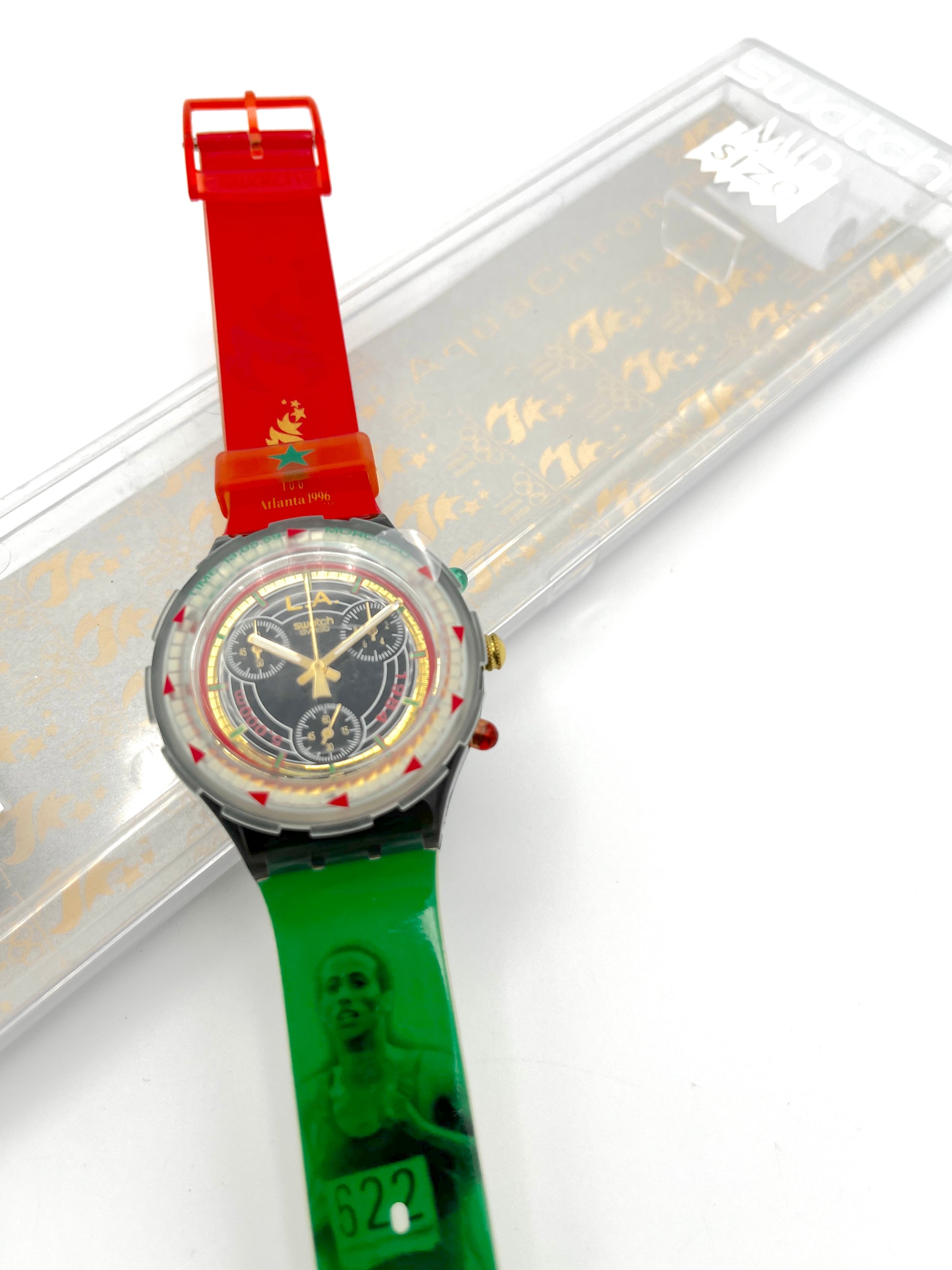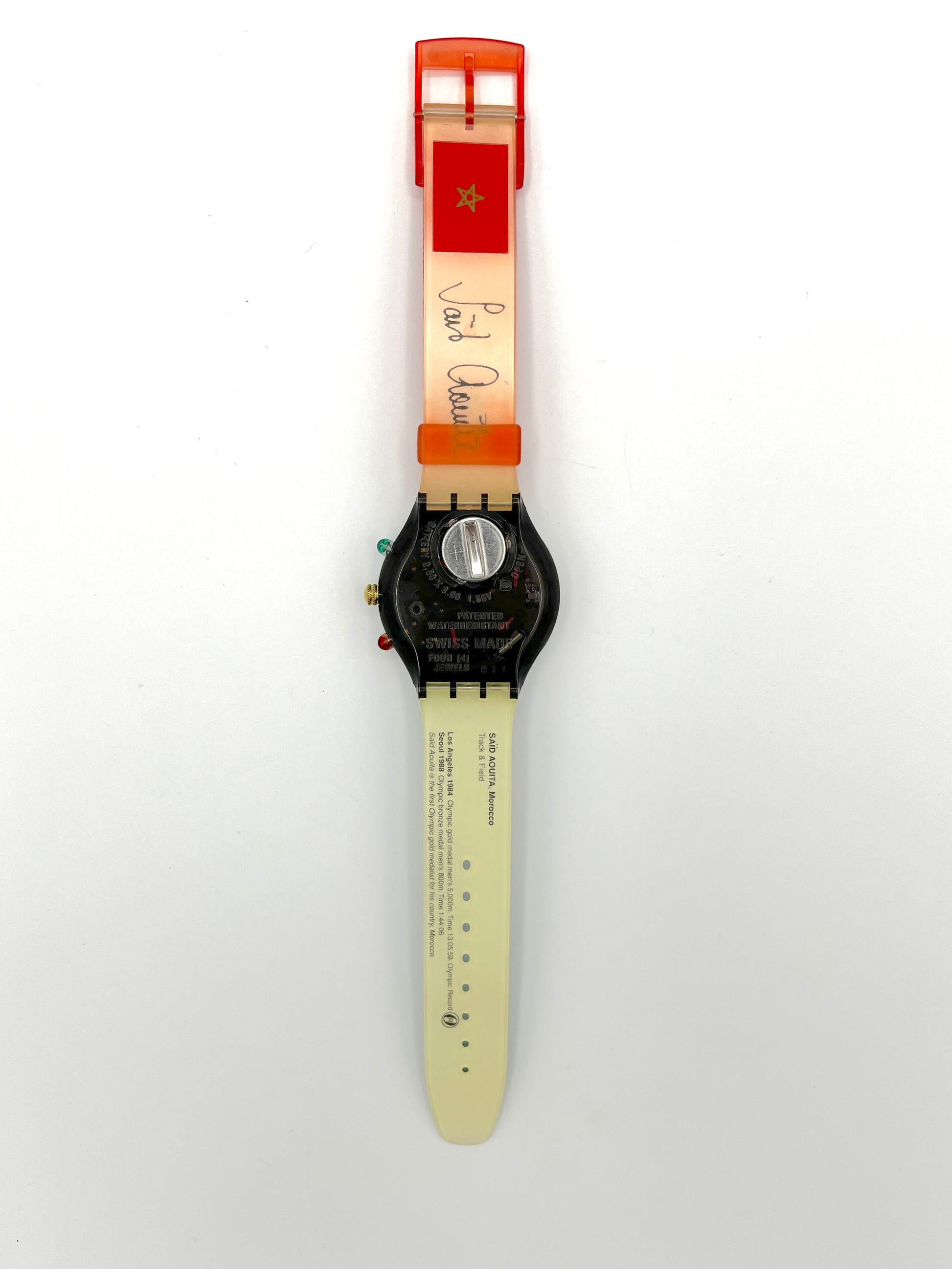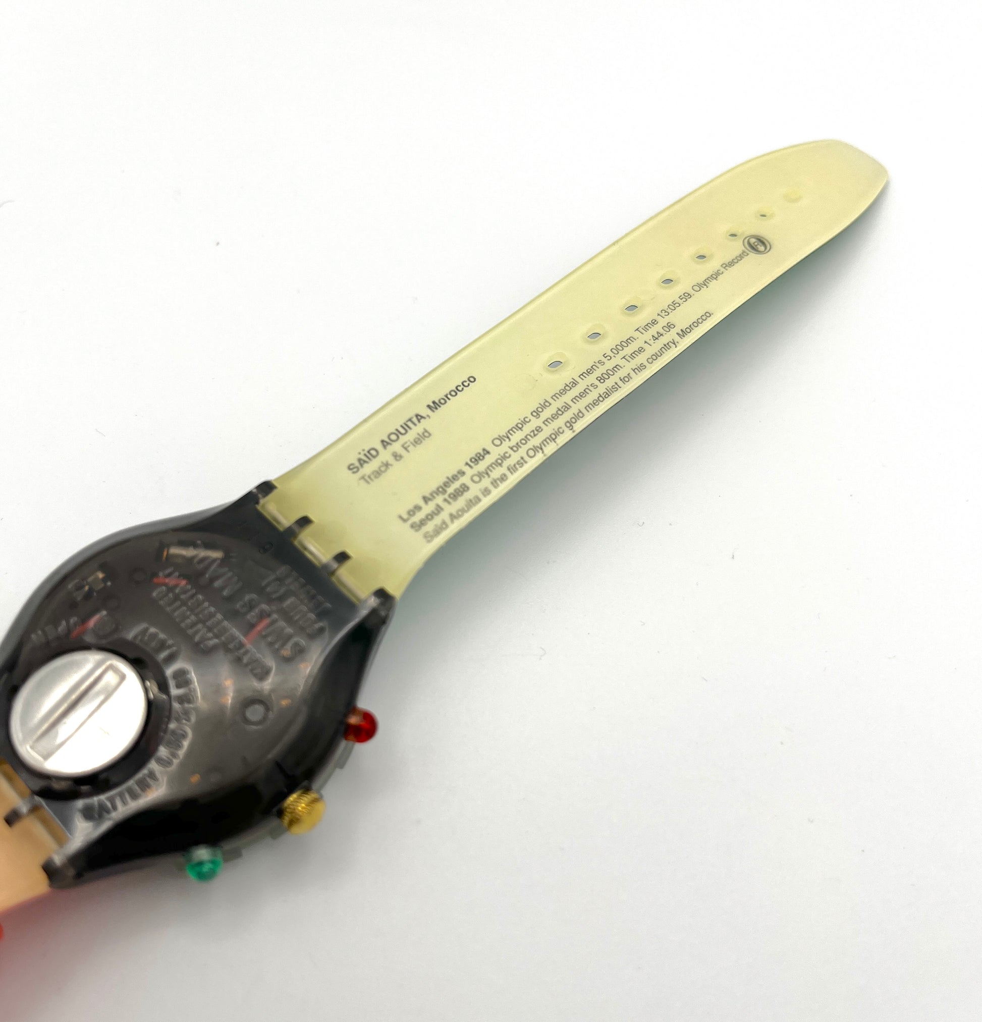 Dive & Chrono Functionality – Combines Scuba 200 features with a chronograph for versatile use. This model comes from Swatch's third Olympic set and is dedicated to long-distance runner and Moroccan Olympic champion Said Aouita.