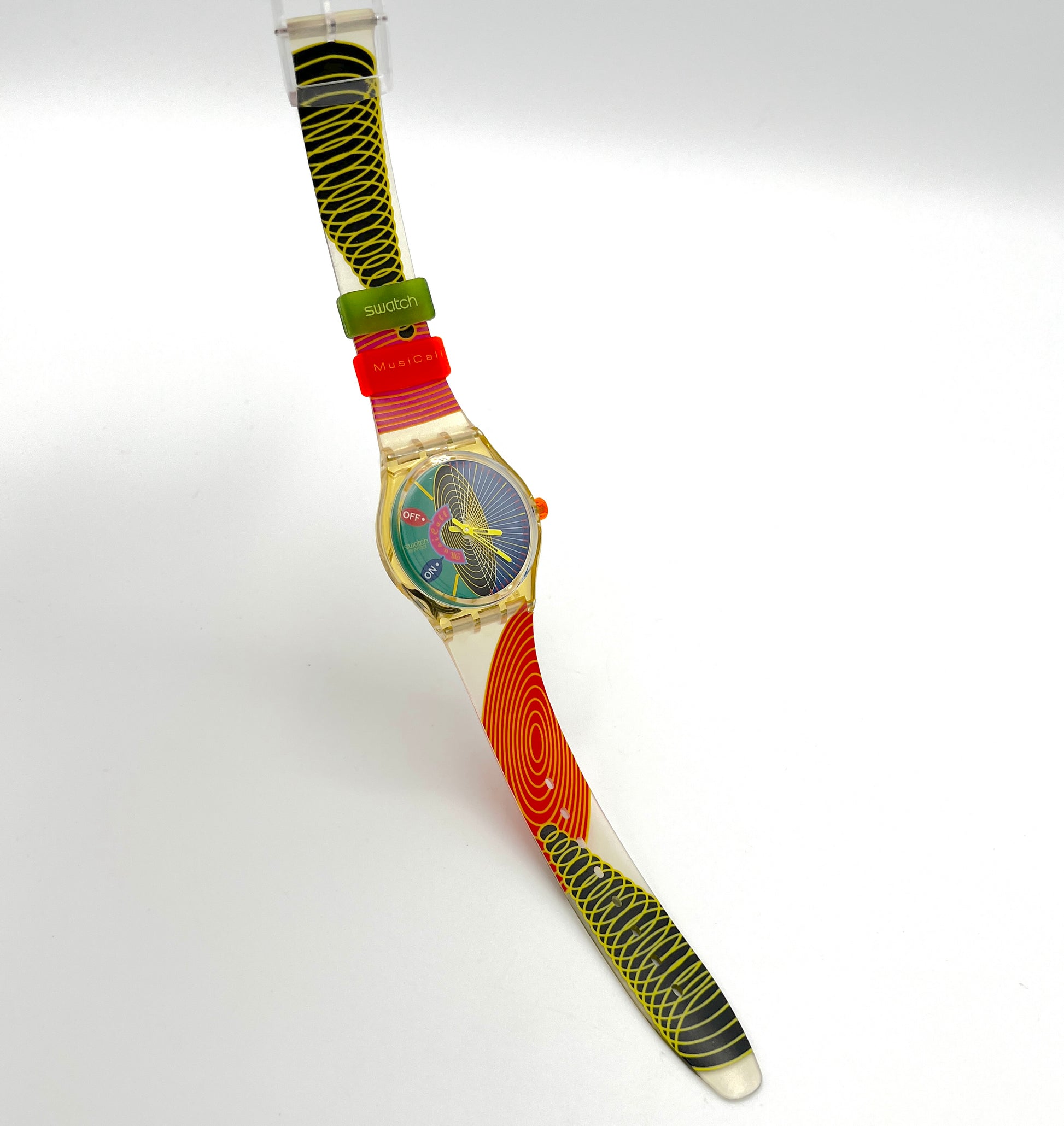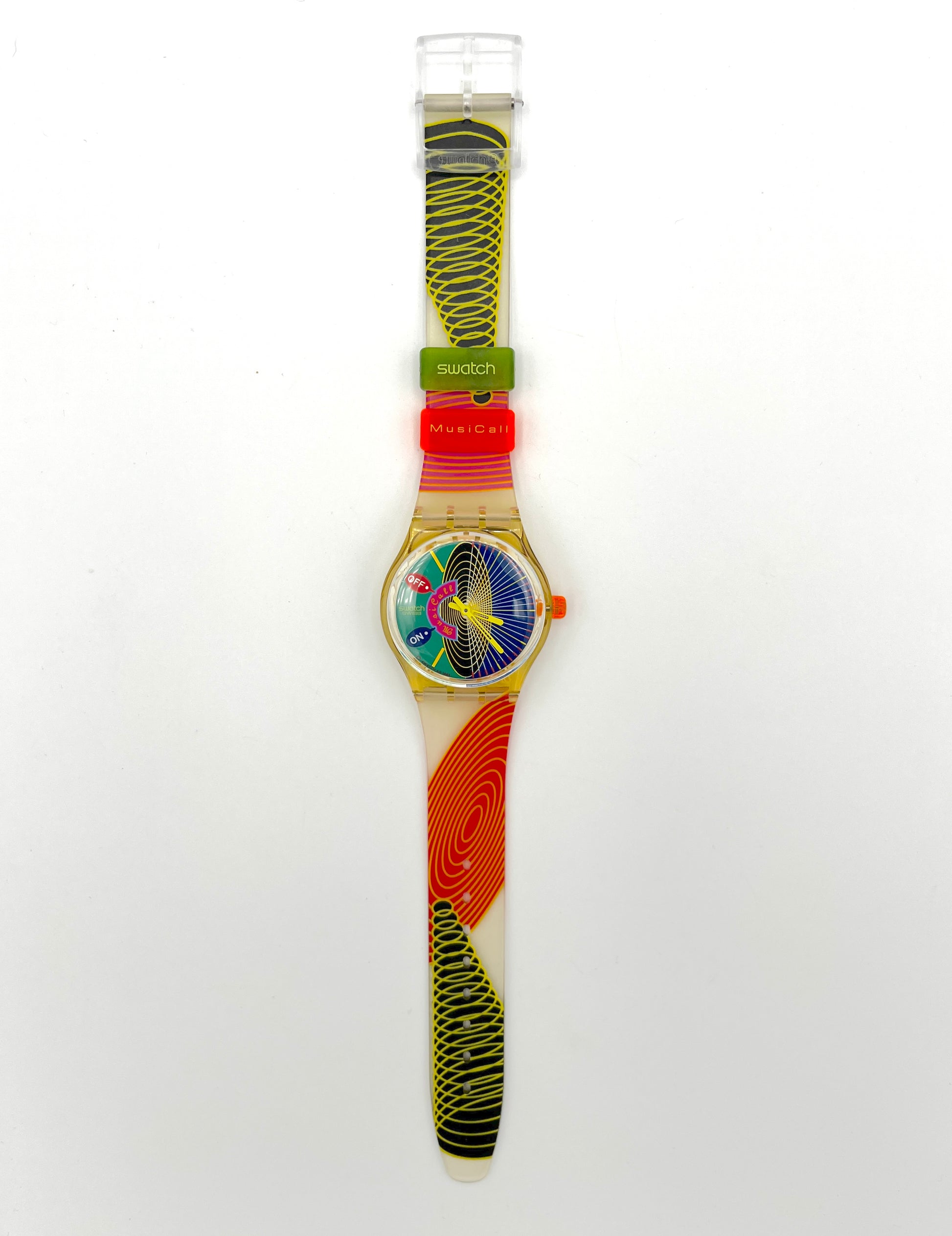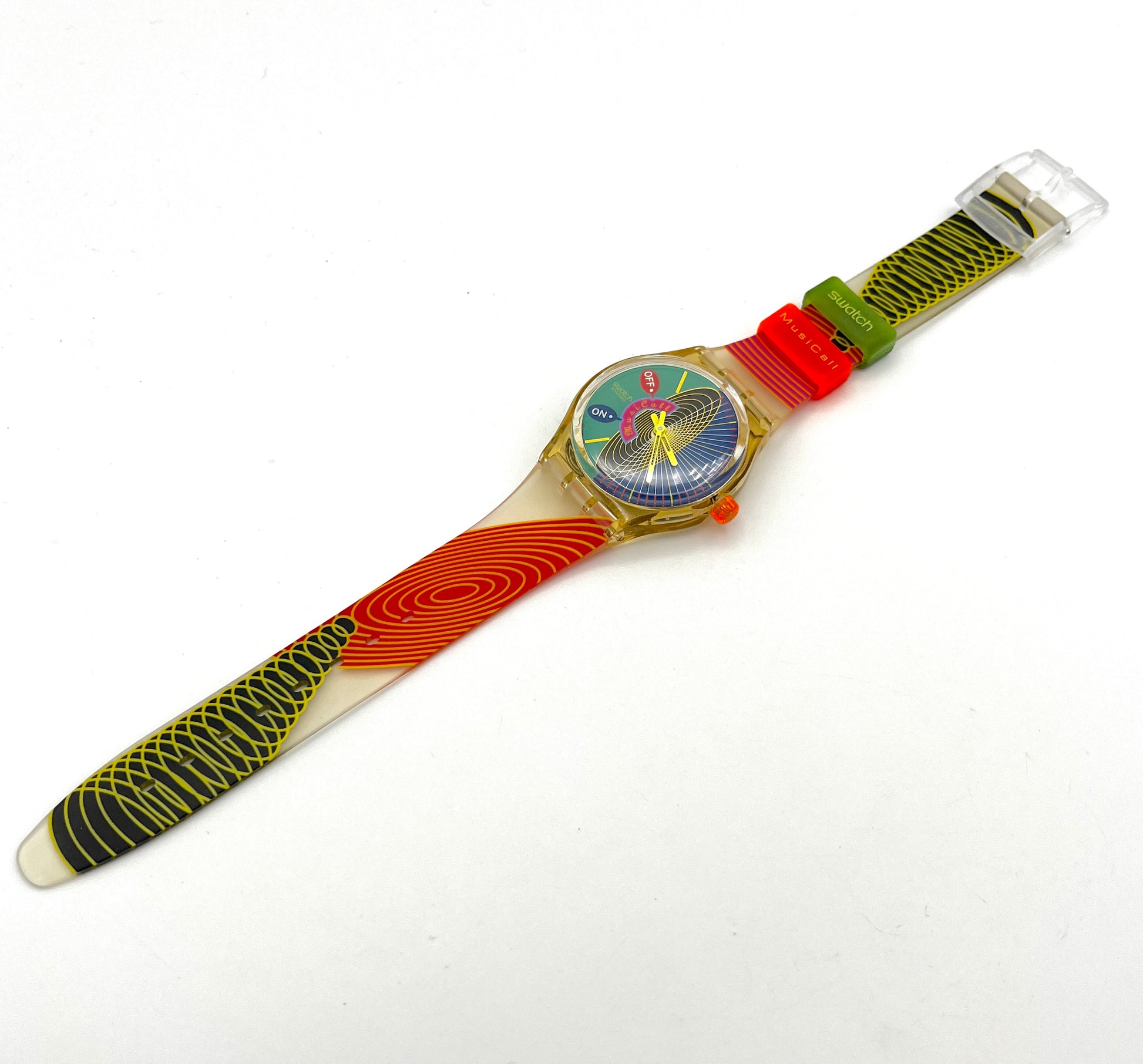 Colorful design – The colorful Swatch Musicall TAMBOUR is a classic from the early days of this model series. Musicall watches were produced from 1993 to 1998. They are the size of a normal Gent but also have an alarm function with a melody. Circles and ellipses are scattered all over the watch, a design typical of Swatch.